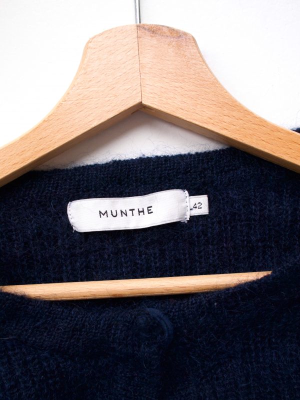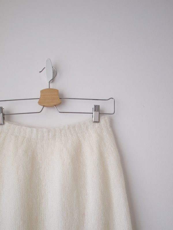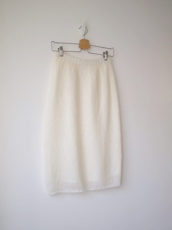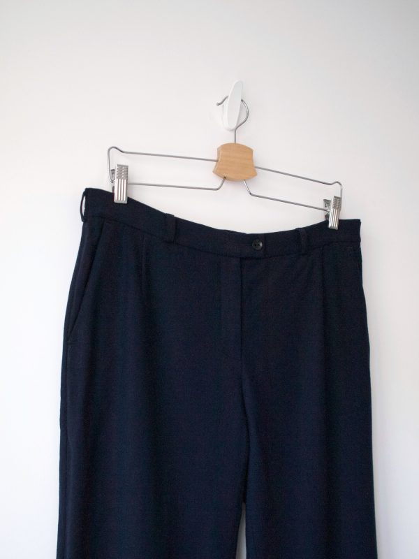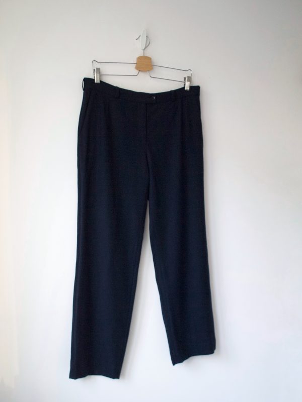 Unikatowa spódnica vintage, wykonana z wełny bouclé w głębokim granatowym kolorze. Posiada szlufki na pasek, z tyłu zapinana na zamek i wyposażona w podszewkę. Brak metki ze składem i rozmiarem, prawdopodobnie uszyta według indywidualnego projektu.