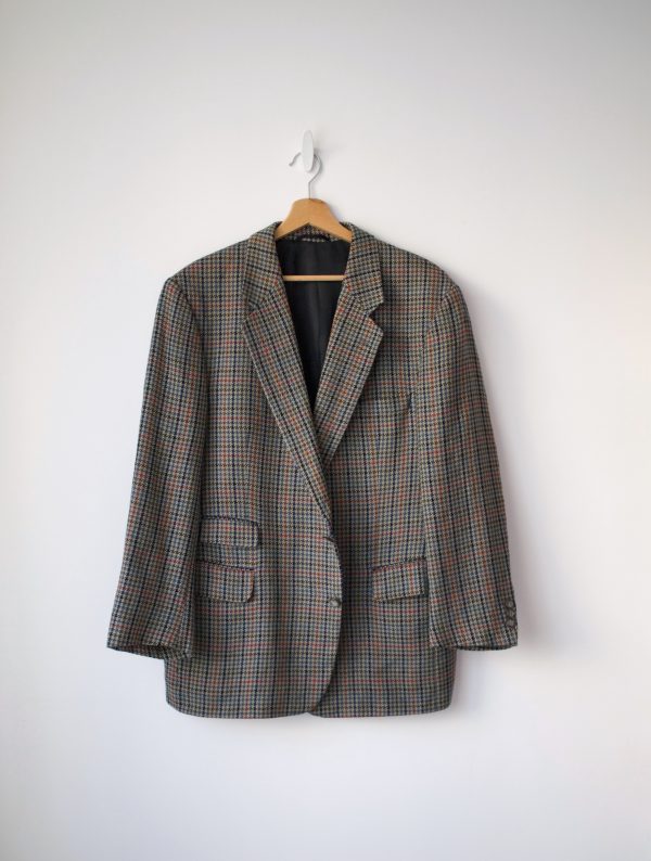 Wełniana marynarka domu mody Burberry, vintage z lat 90. Prosty fason, podszewka z logo marki. Model męski, bardzo obszerny – polecany na rozmiar XL+ lub jako wyrazisty oversize.