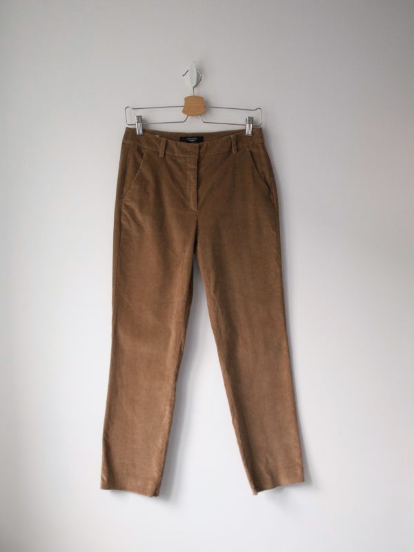 Sztruksowe spodnie luksusowej marki Max Mara, linia weekend. Wykonany z ciepłej, przyjemnej w dotyku tkaniny, z kieszeniami. Model jest dostępny na stronie marki w cenie 875 zł.