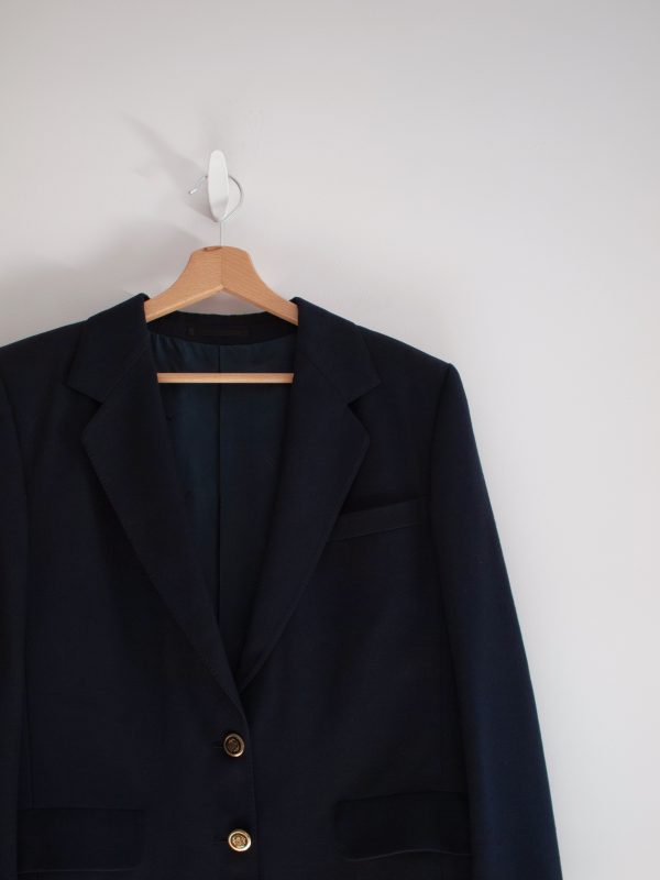 270,00 złMarynarka luksusowej brytyjskiej marki Aquascutum, wykonana w 100% z wełny w granatowym kolorze, zapinana na eleganckie guziki, z sygnowaną podszewką.