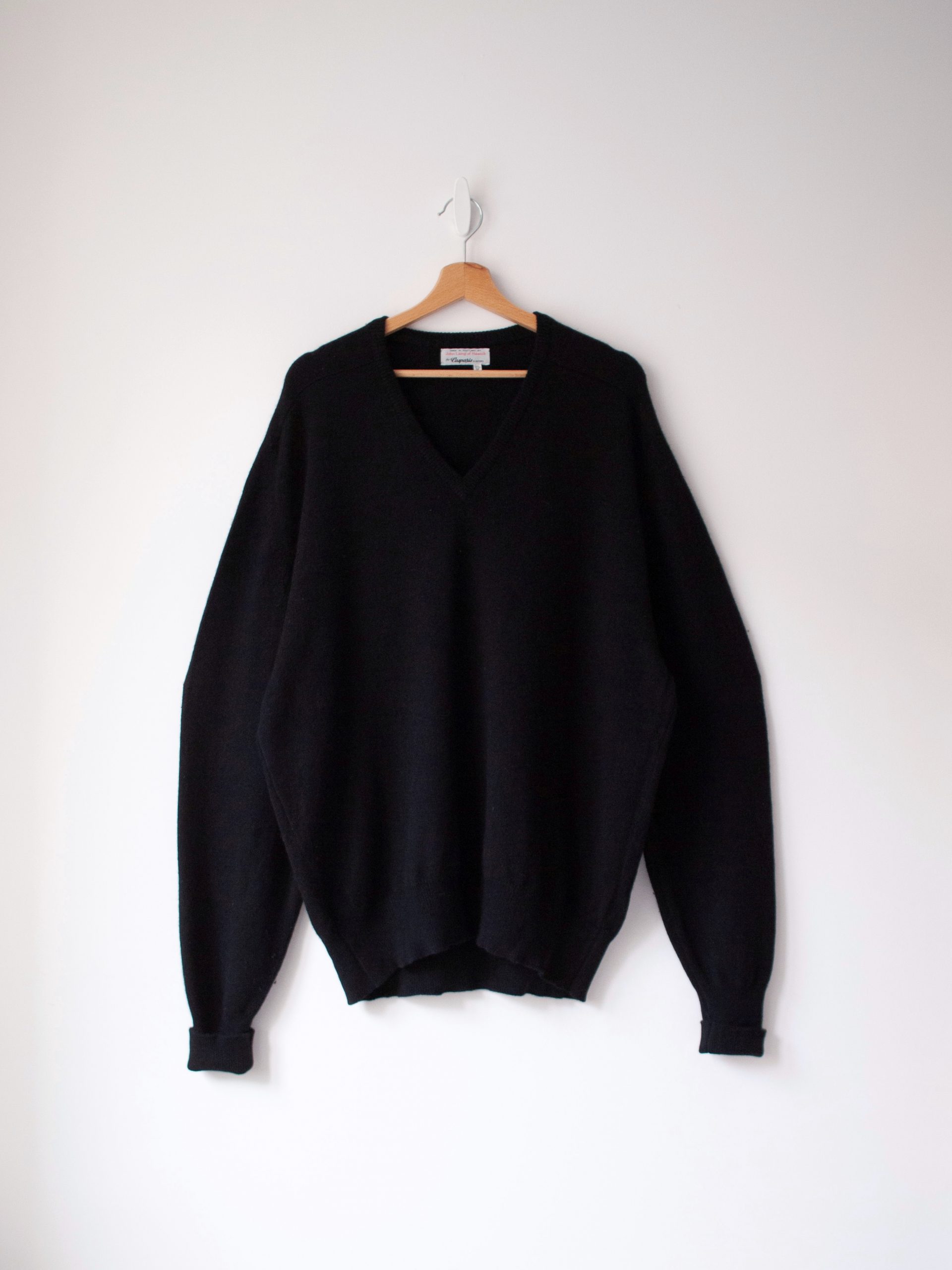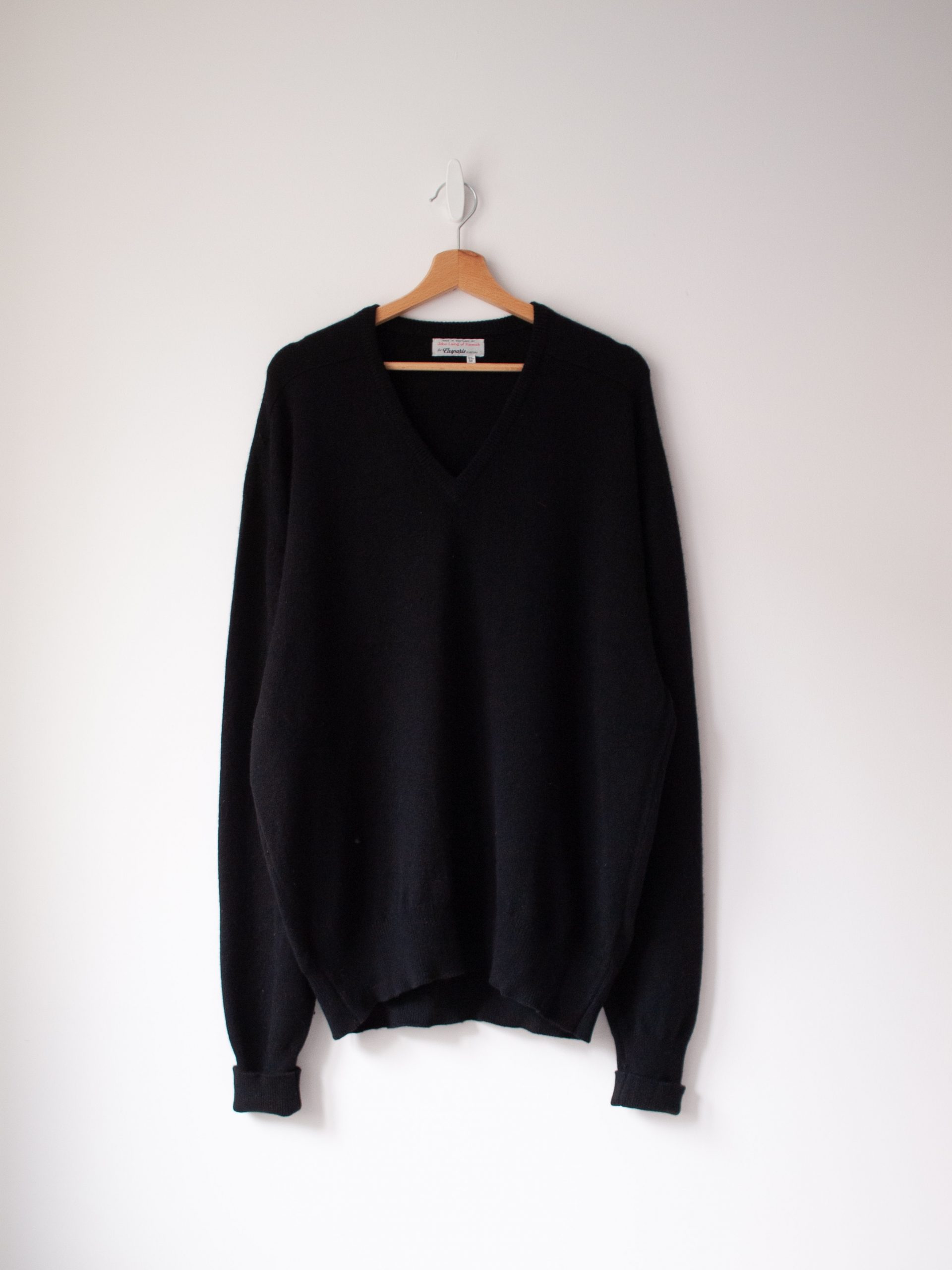 Unikatowy sweter vintage, wykonany z kaszmiry o grubym splocie. Sweter został wyprodukowany w Szkocji przez John Laing of Hawick – renomowaną markę specjalizującą się w wysokiej jakości dzianinach z kaszmiru i wełny.