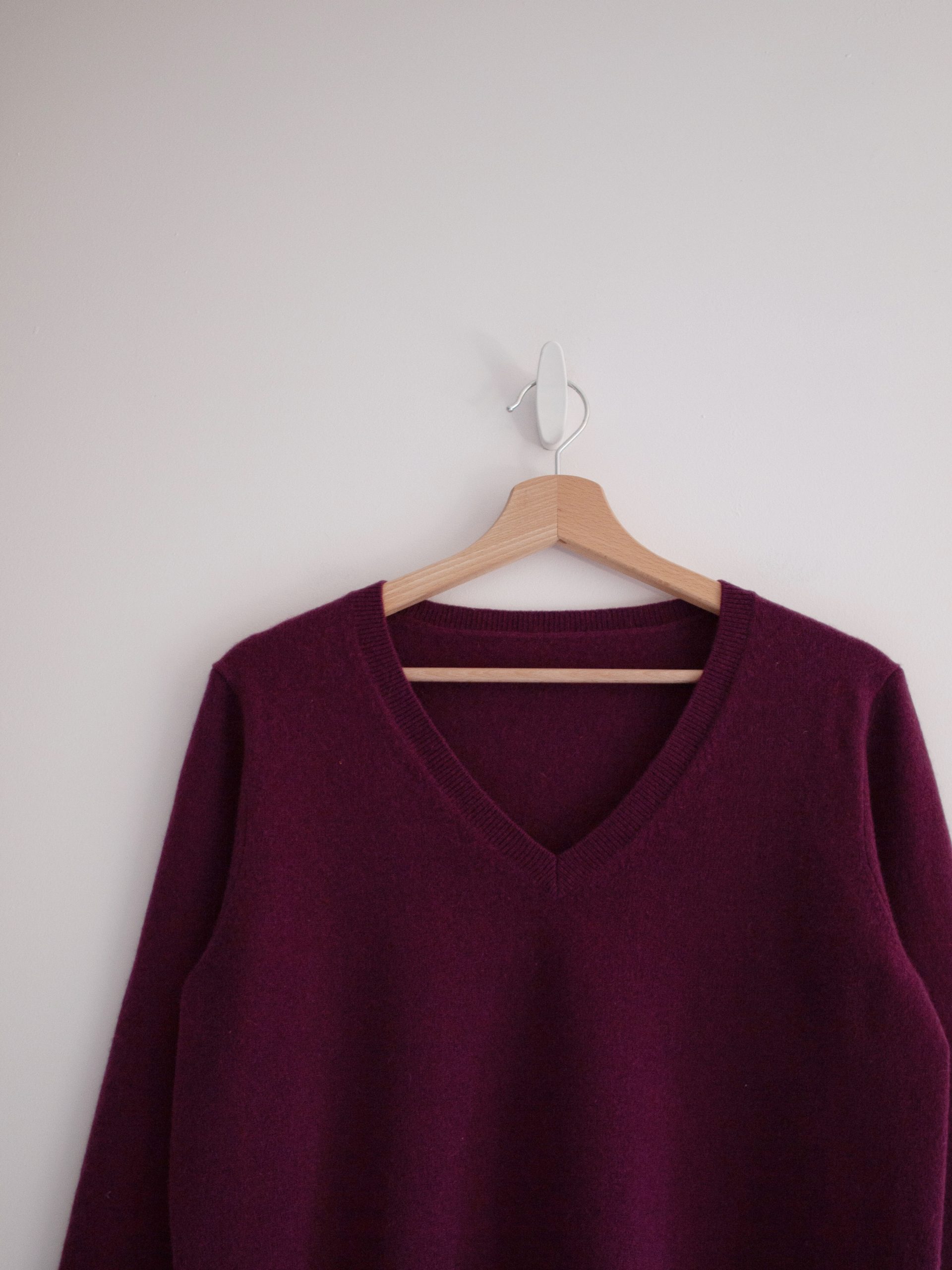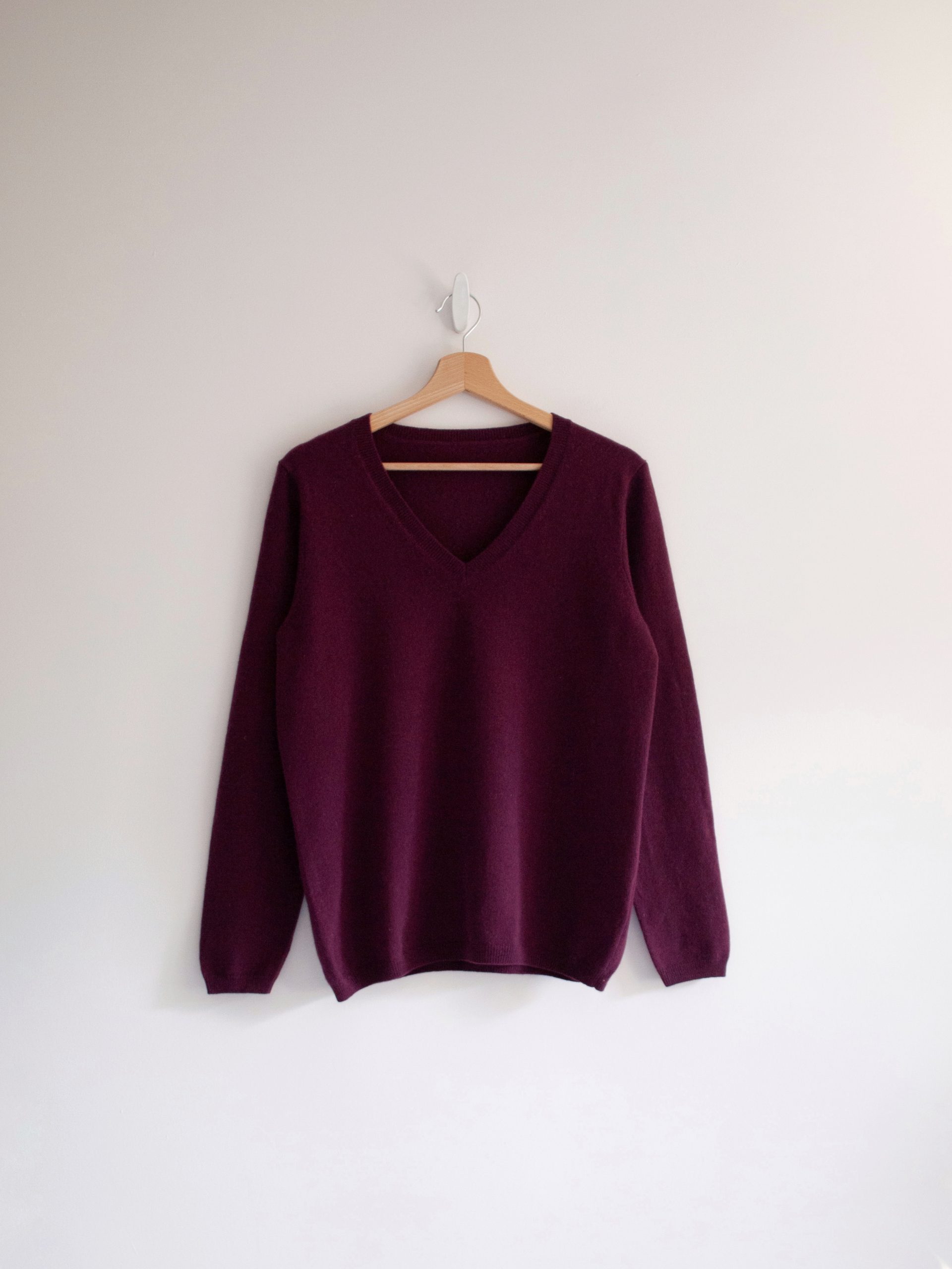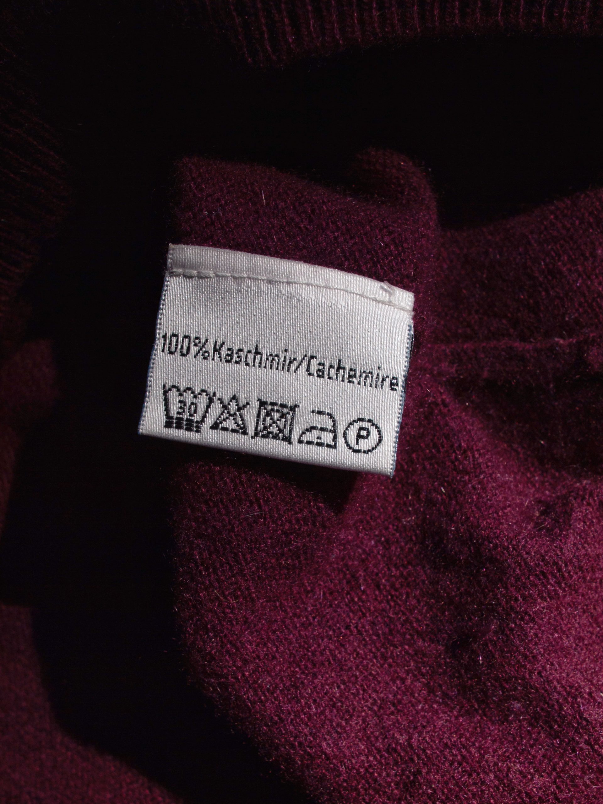 Bordowy kaszmirowy sweter o klasycznym fasonie. Rozmiar z metki: brak Skład: 100% kaszmir Stan: bez wad Szerokość w klatce 48 cm Długośćcałkowita 63 cm