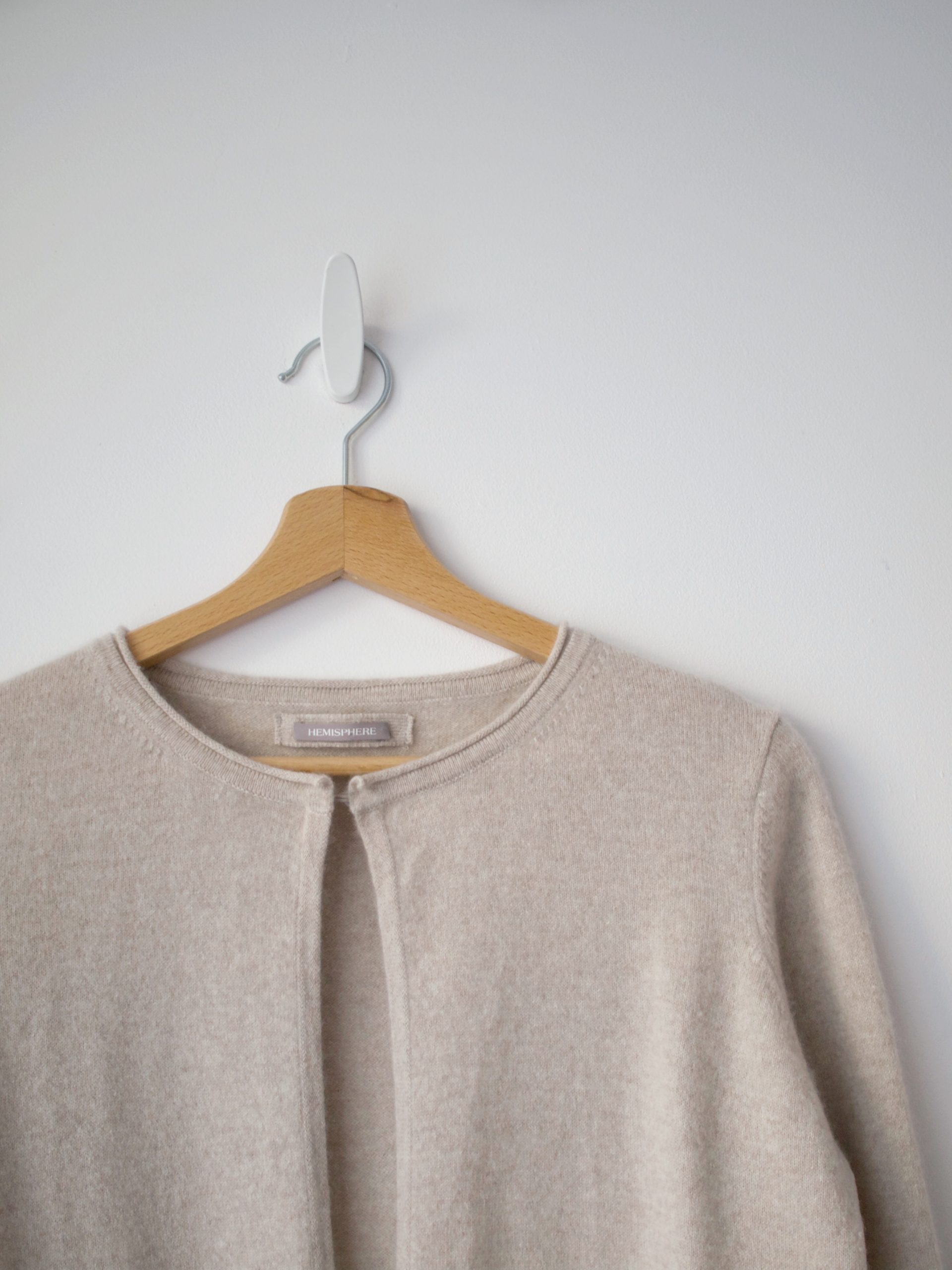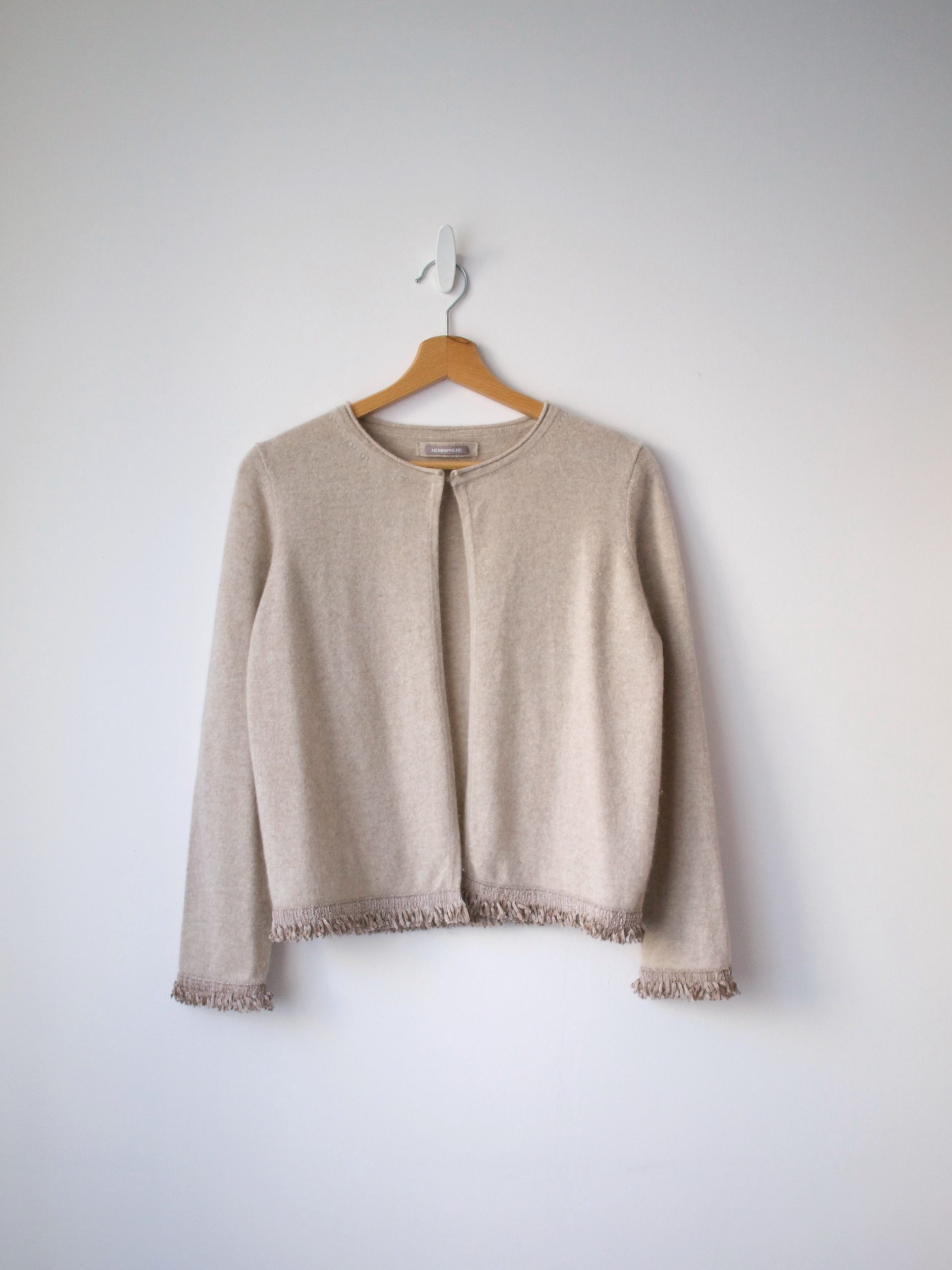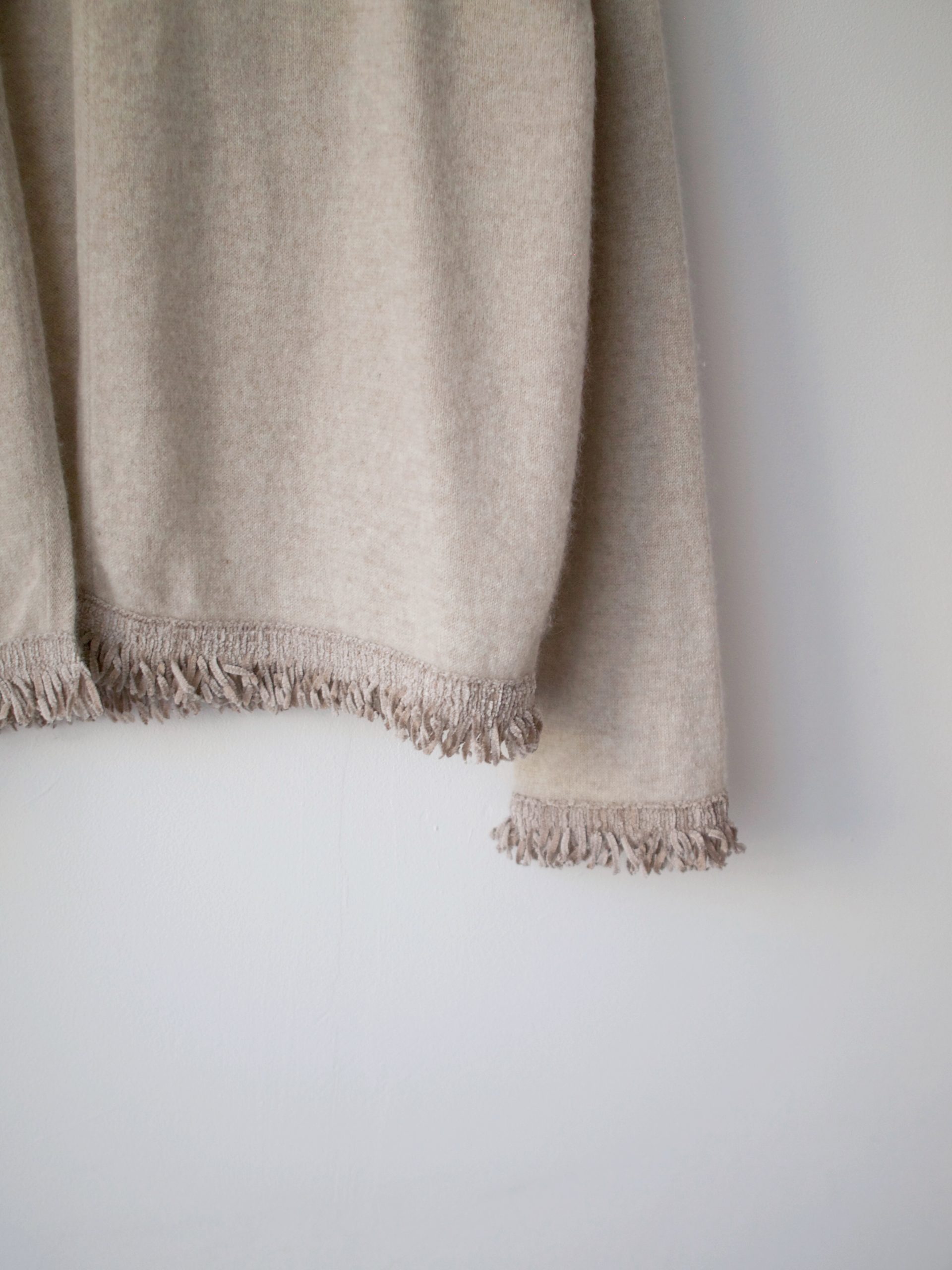 Kaszmirowy sweter z modnymi w tym sezonie frędzlami. Zapinany na haftkę, wykonany z wyjątkowo miękkiej, przyjemnej w dotyku dzianiny.
