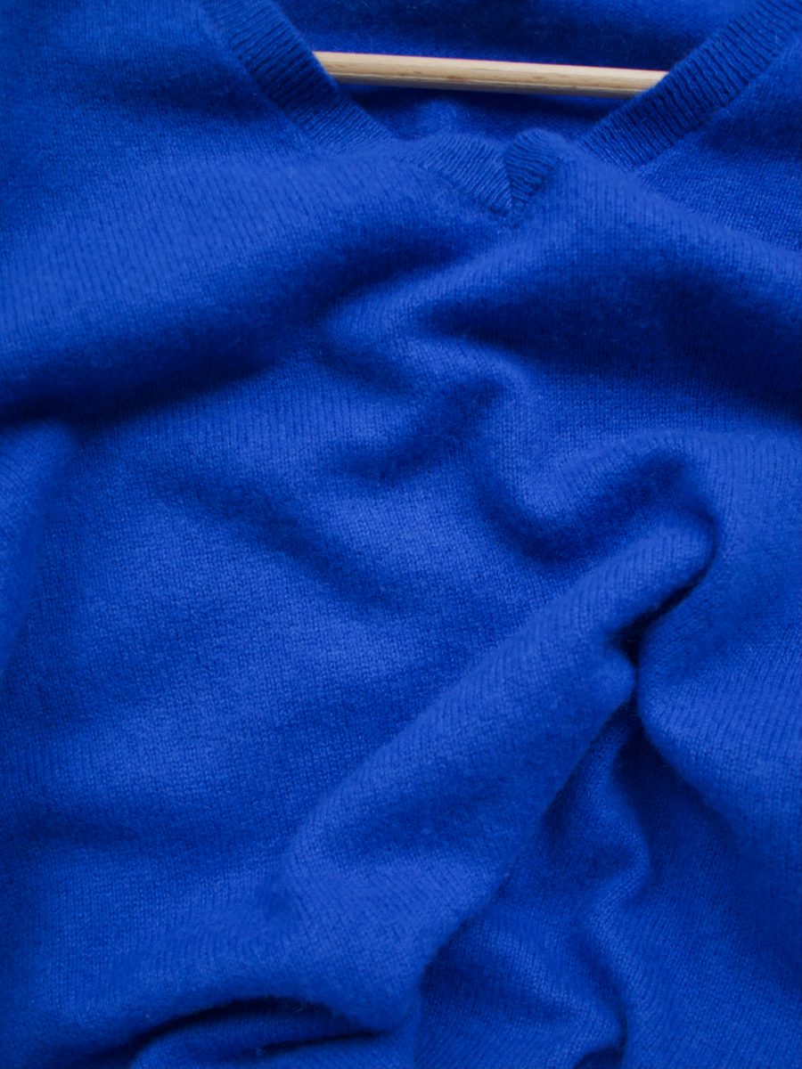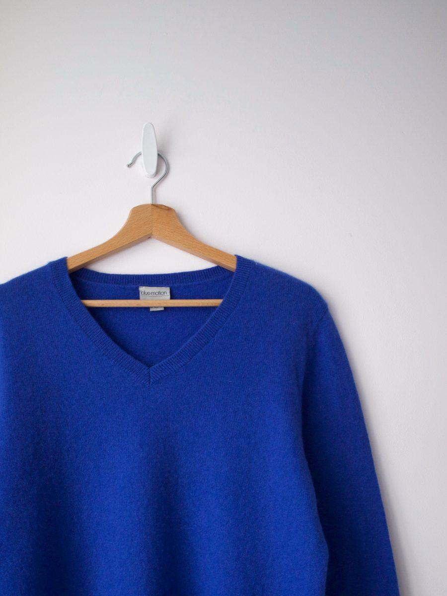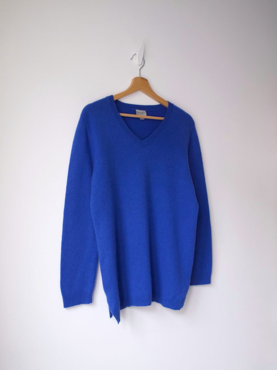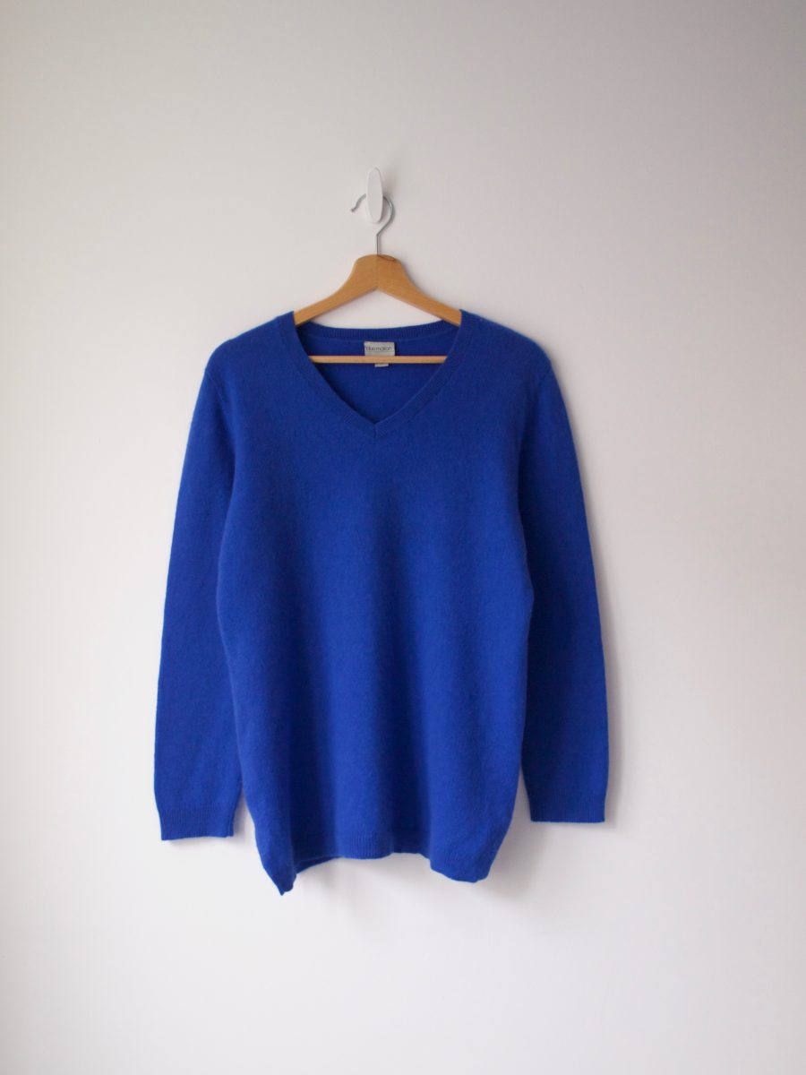 Klasyczny sweter M&S z dekoltem w serek. Skład to 100% kaszmir, bardzo dobry stan, jest minimalnie sfilcowany, nie jest to zauważalne, po prostu jest trochę sztywniejszy.