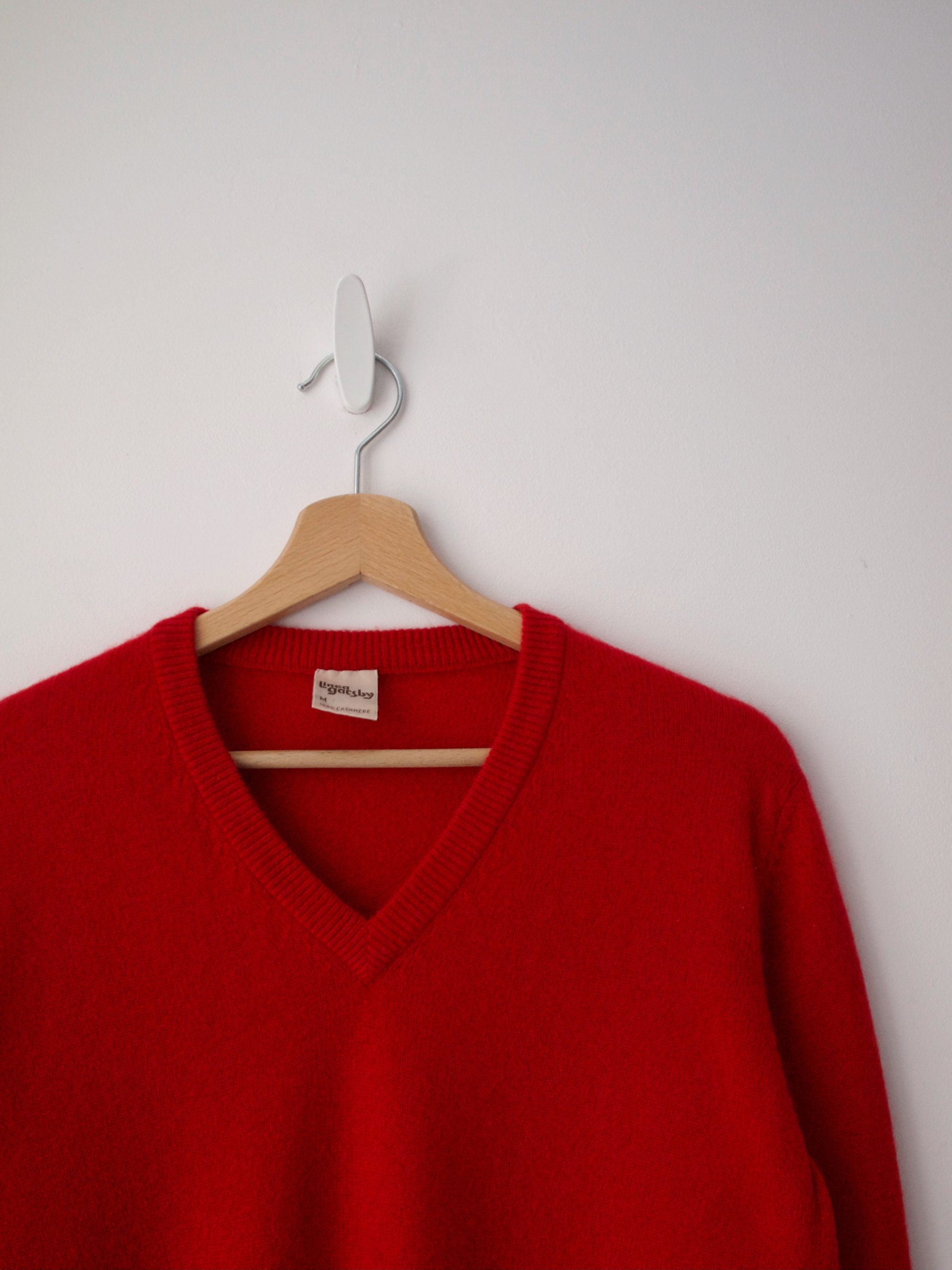 Klasyczny sweter M&S z dekoltem w serek. Skład to 100% kaszmir, bardzo dobry stan, jest minimalnie sfilcowany, nie jest to zauważalne, po prostu jest trochę sztywniejszy.