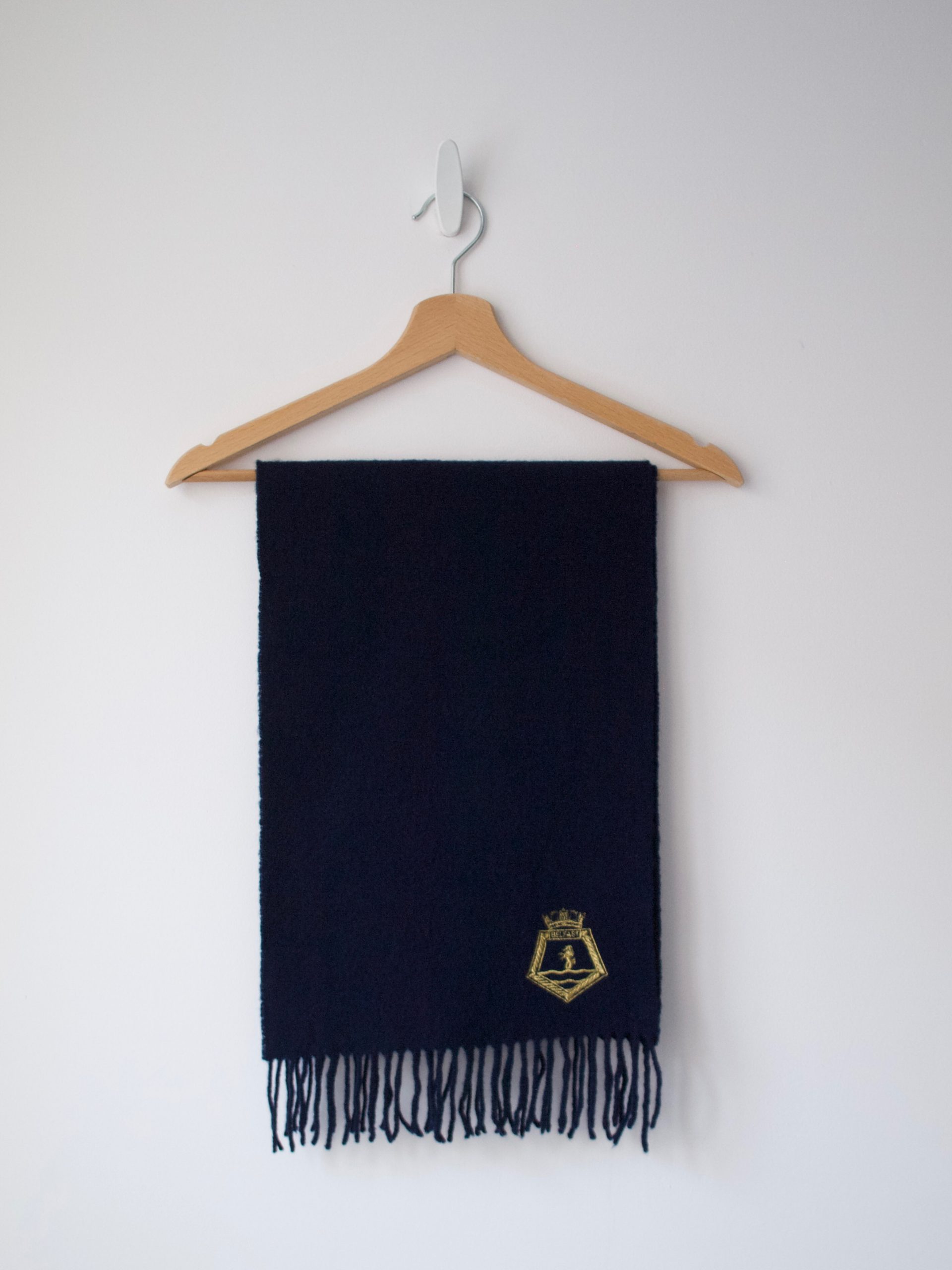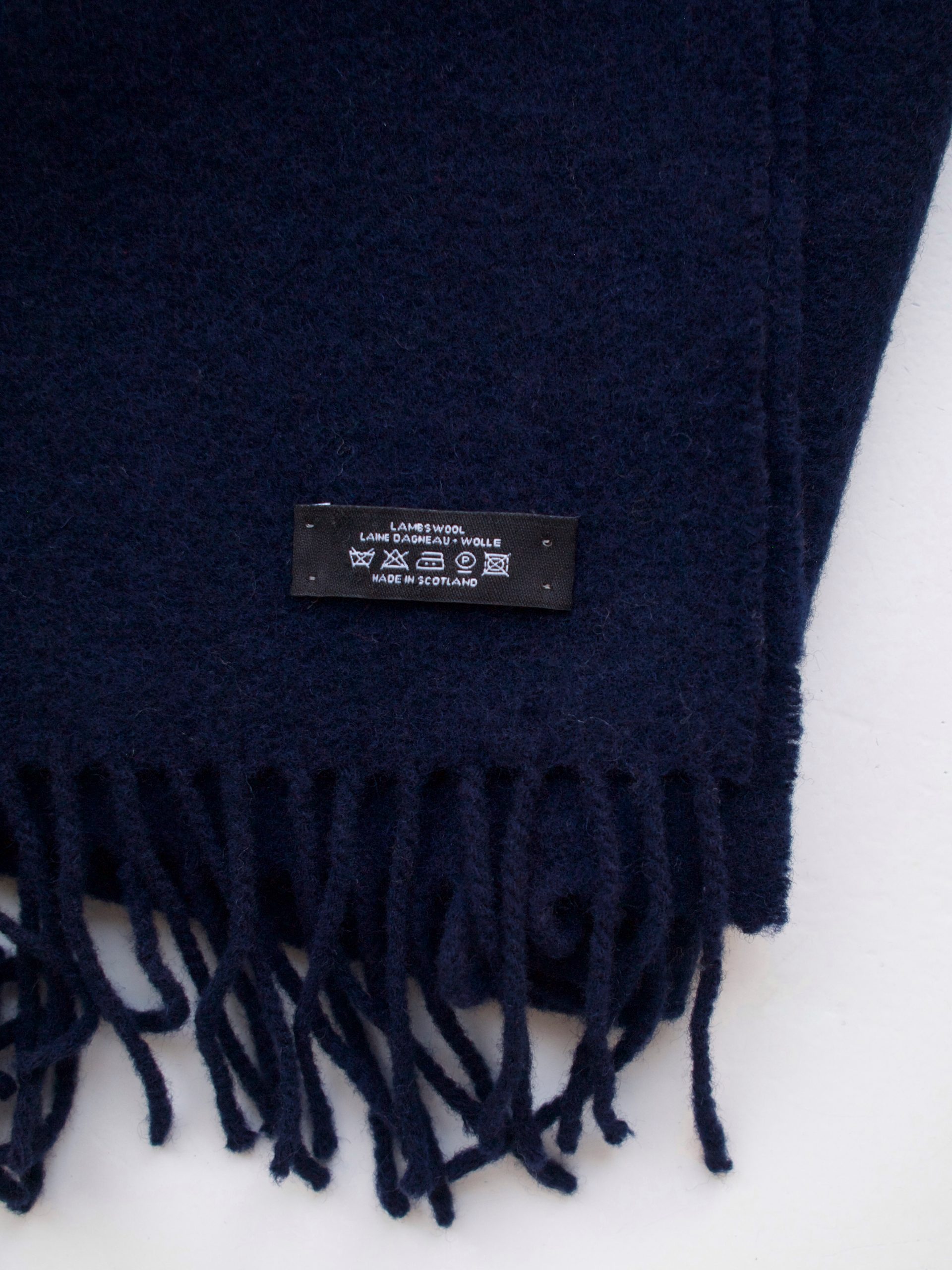 Klasyczny granatowy szalik z wysokiej jakości wełny, wyprodukowany w Szkocji. Skład: 100% wełna jagnięca Stan: bez wad Wymiary: 155*28 cm