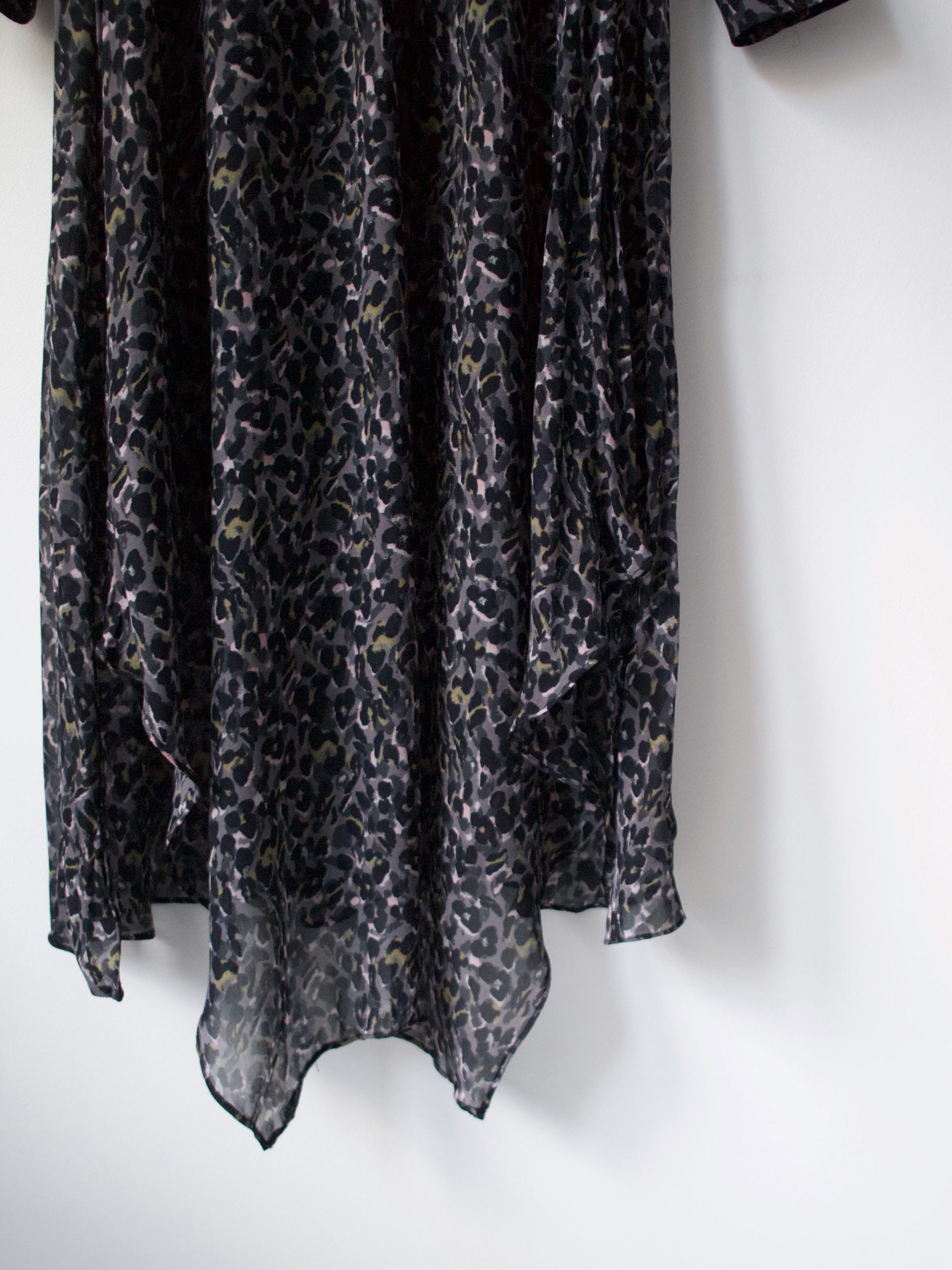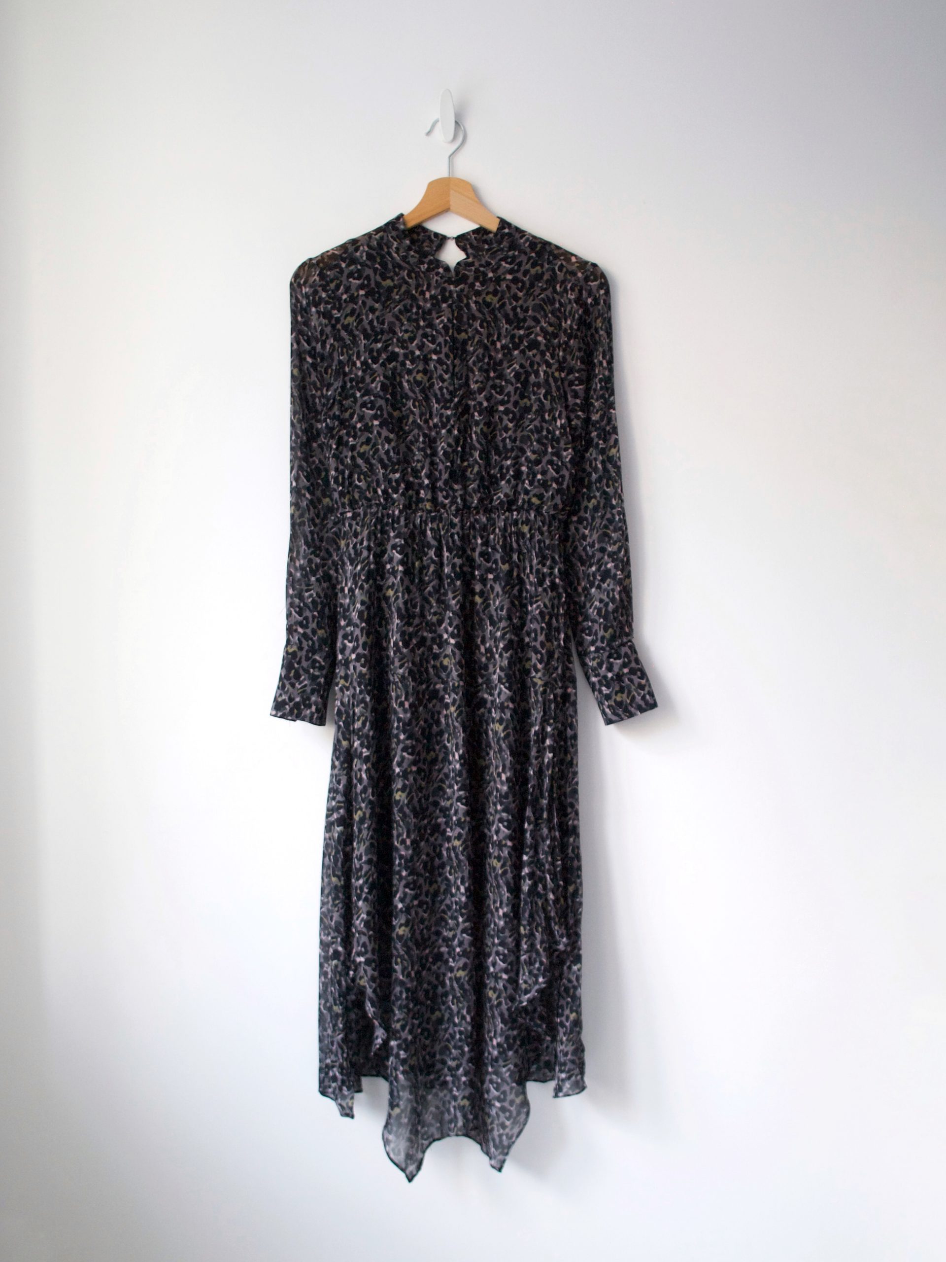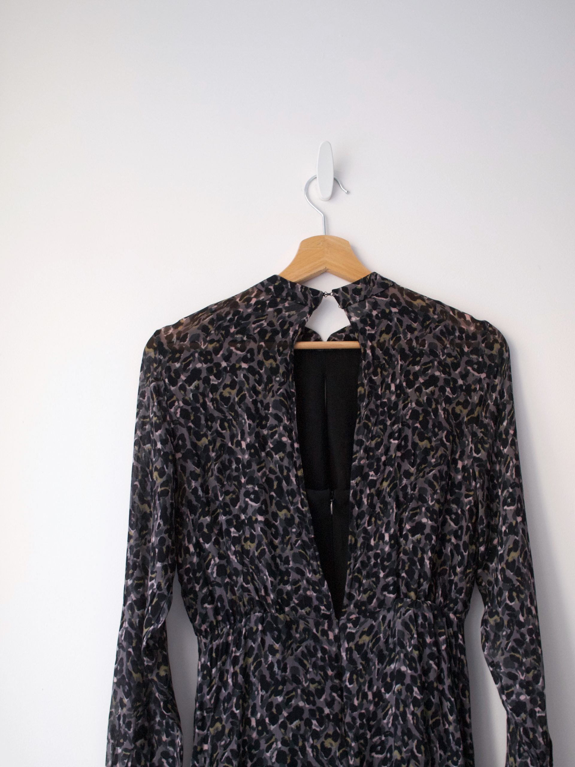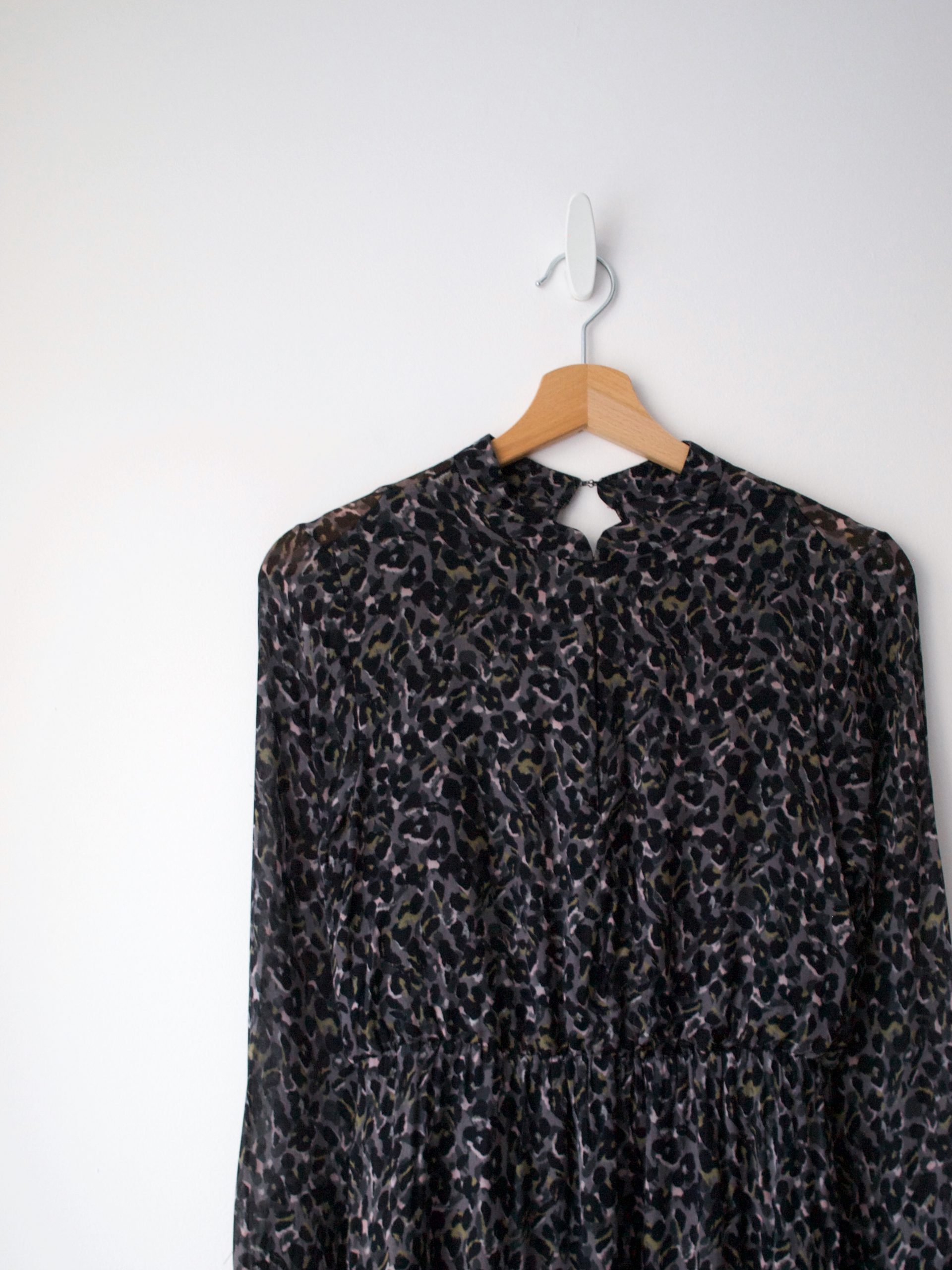Sukienka luksusowej marki AllSaints w modnym panterkowym wzorze. Wykonana ze zwiewnego szyfonu, wyposażona w podszewkę. Z tyłu dekolt zapinany na elegancką haftkę.