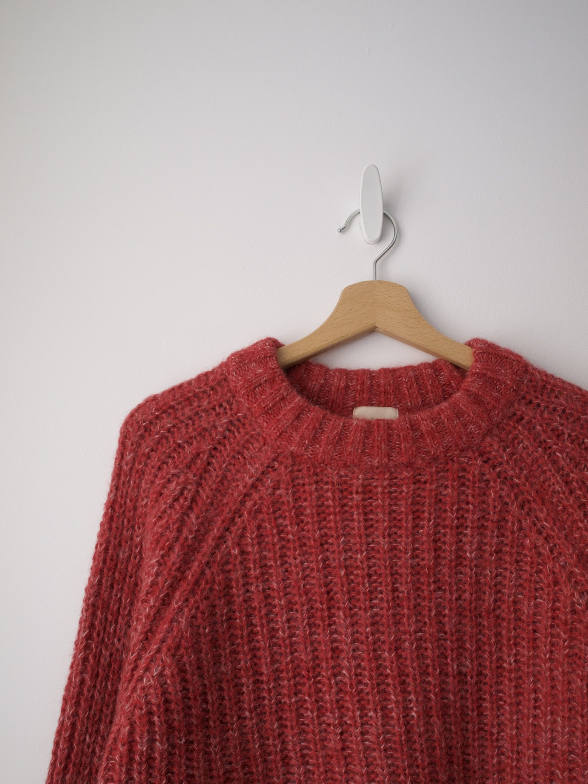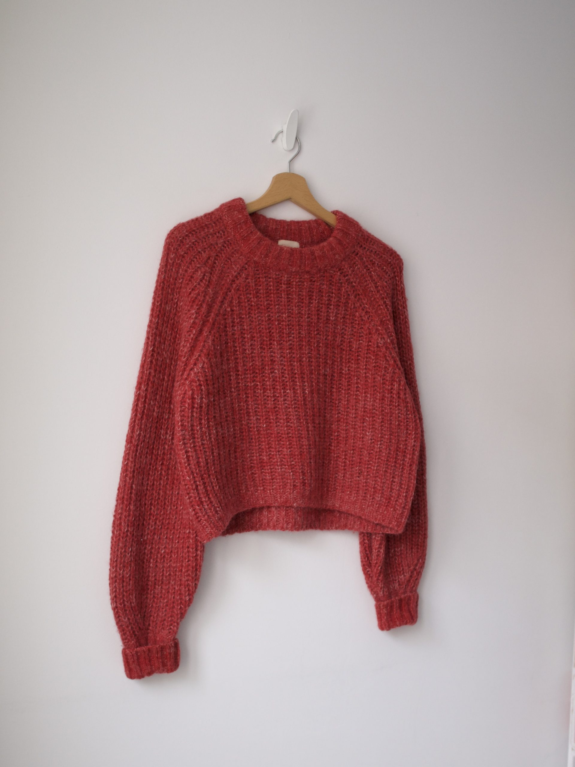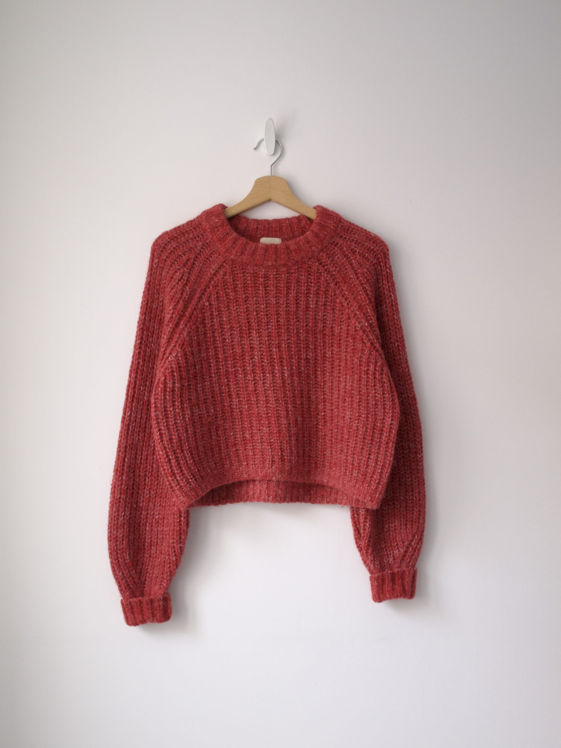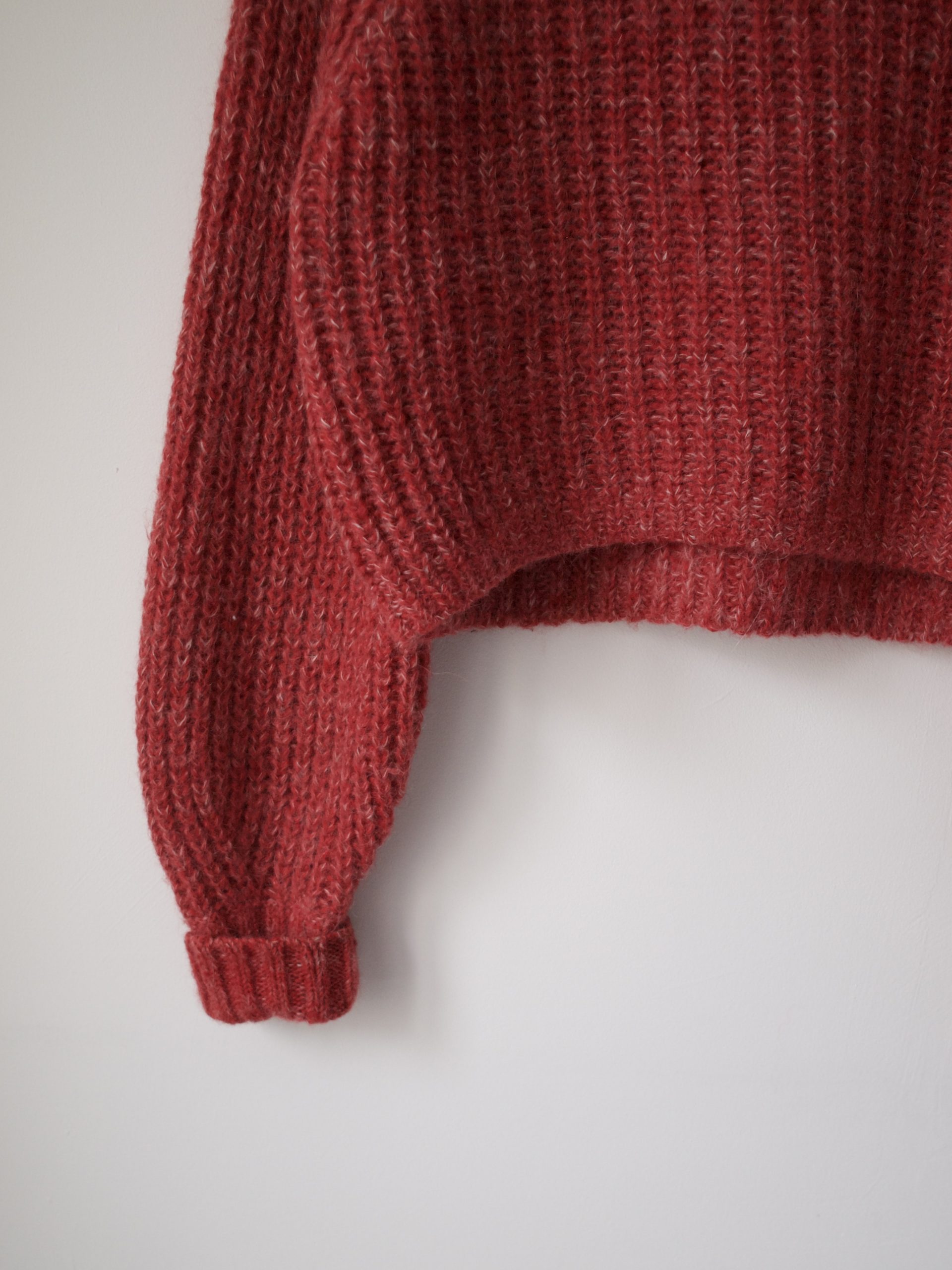 Puszysty sweter o grubszym splocie. Wykonany z tkaniny z dużym udziałem wełny oraz wełny z alpaki.