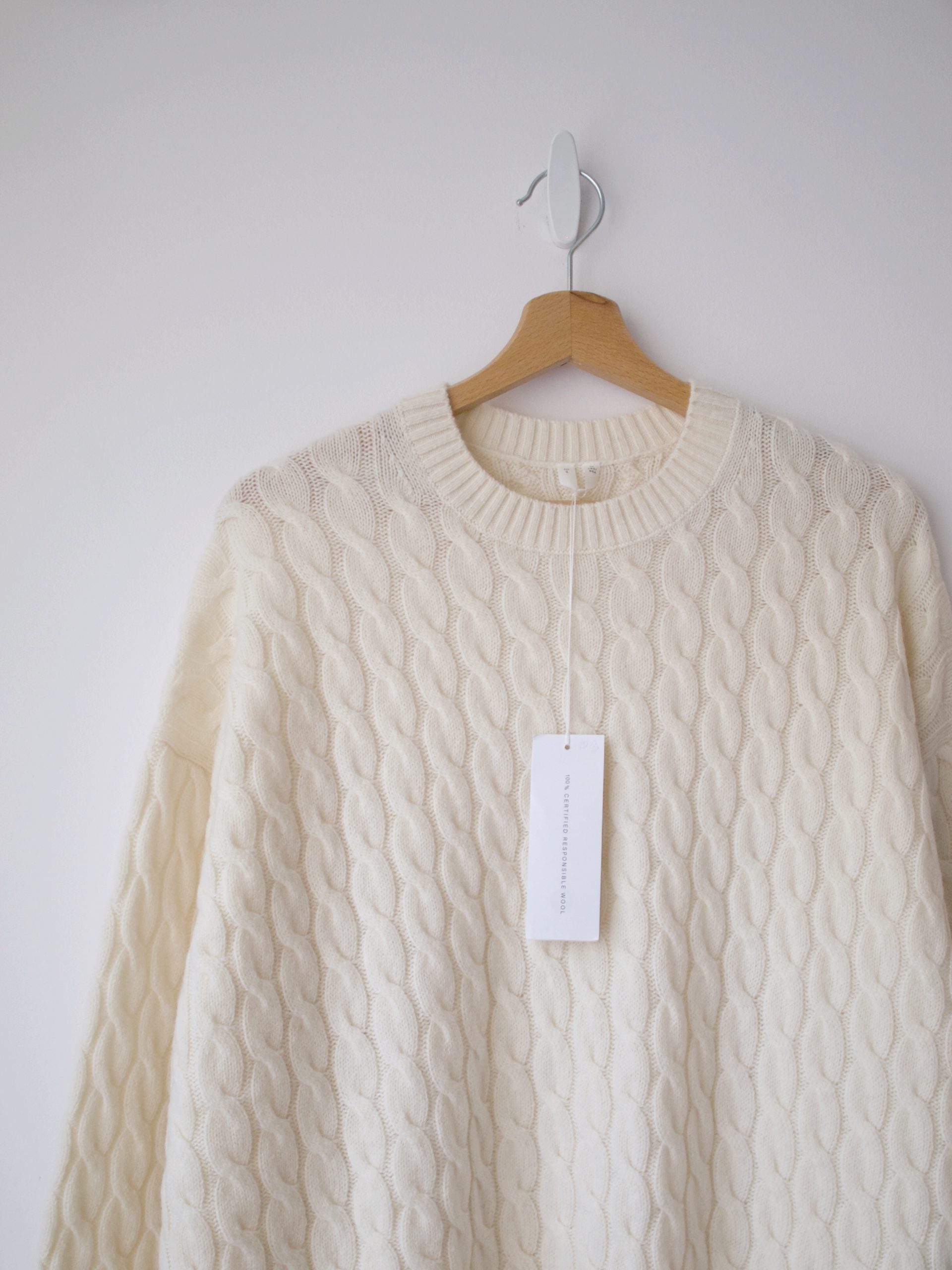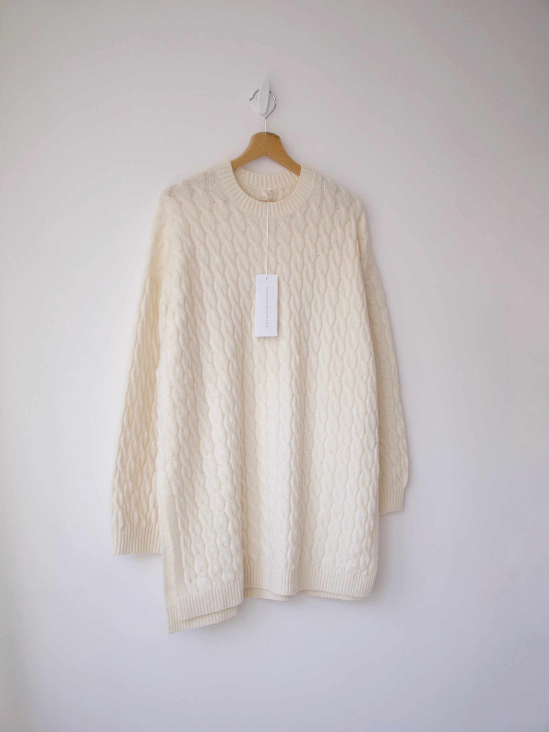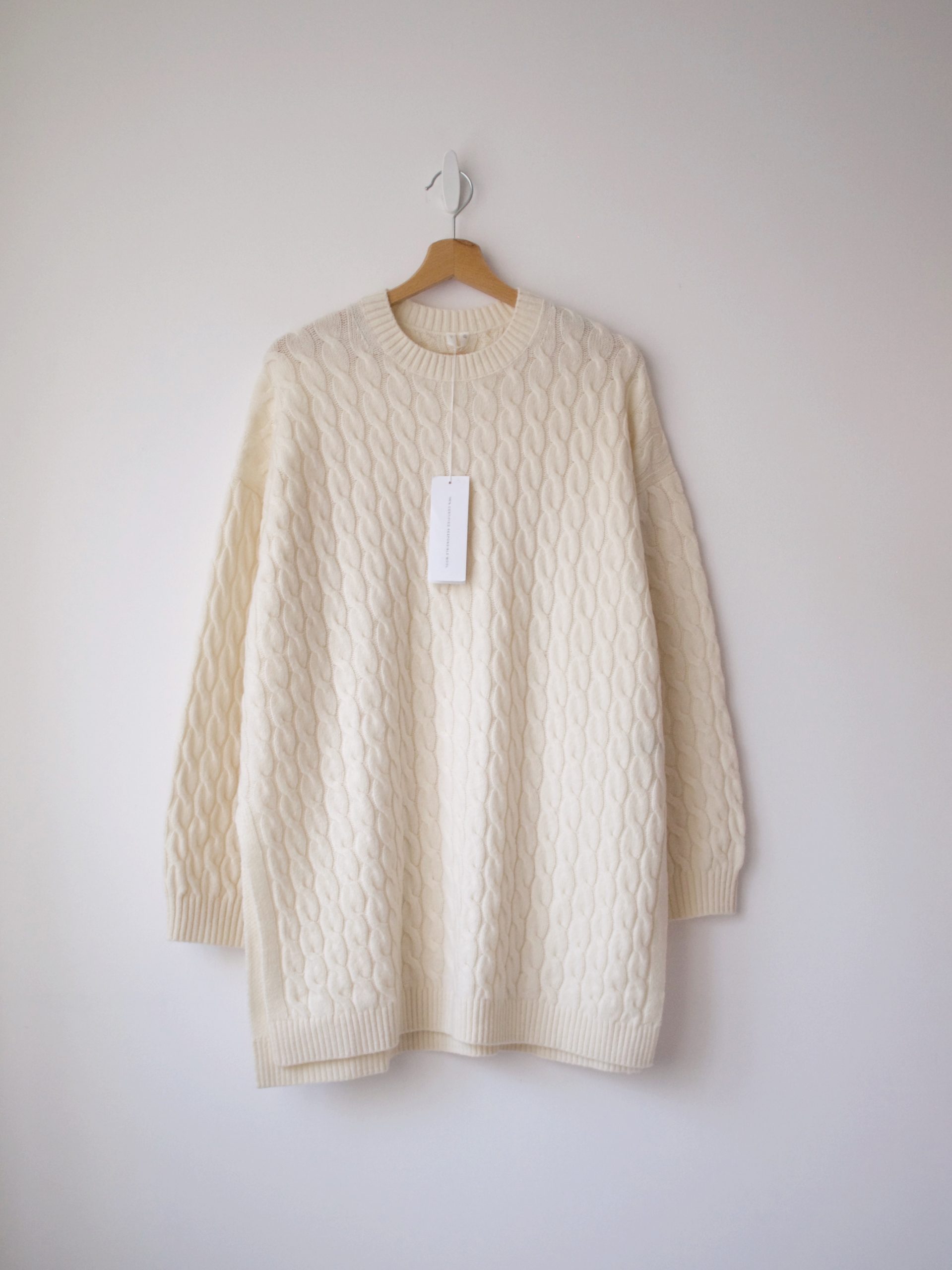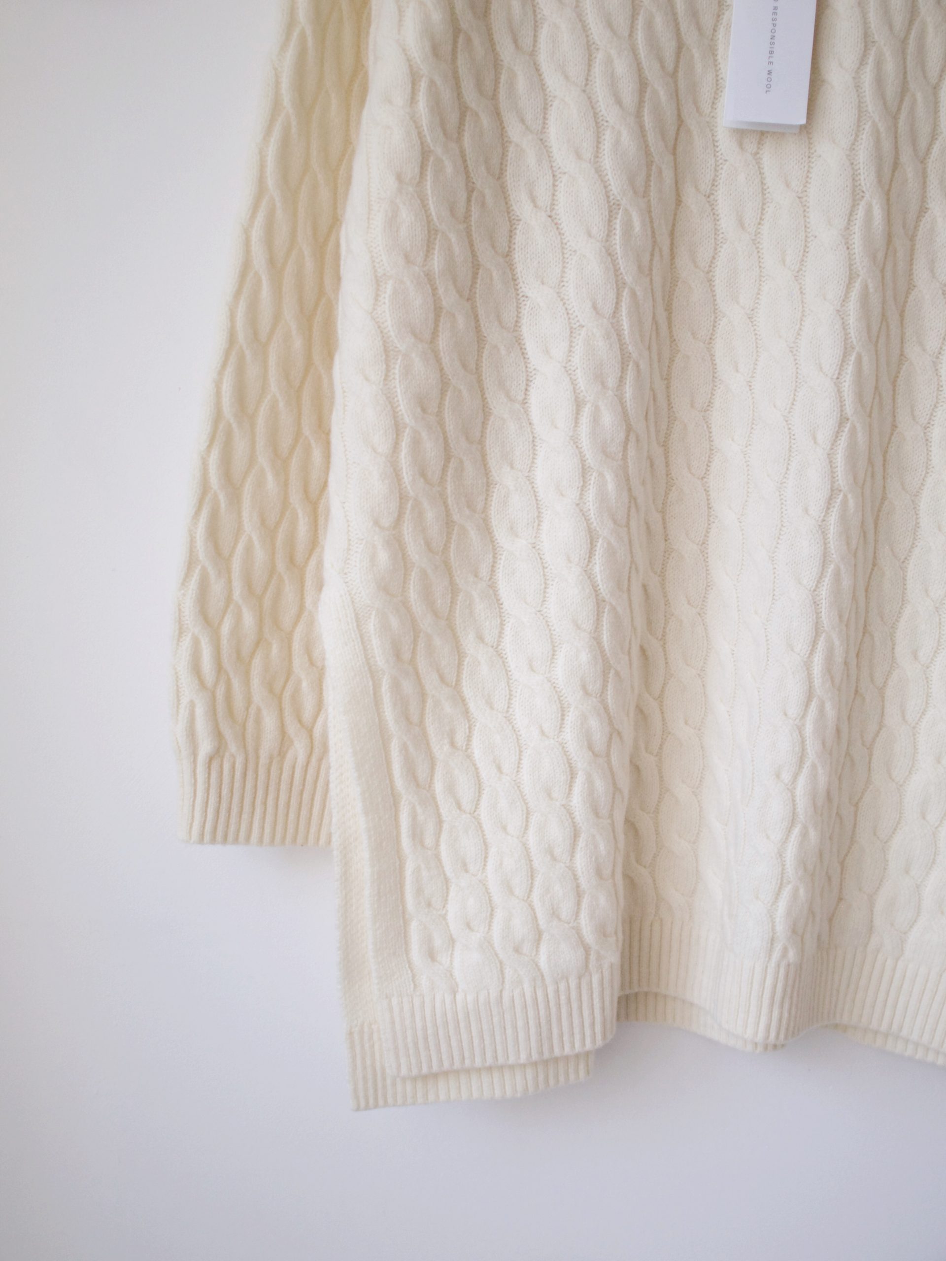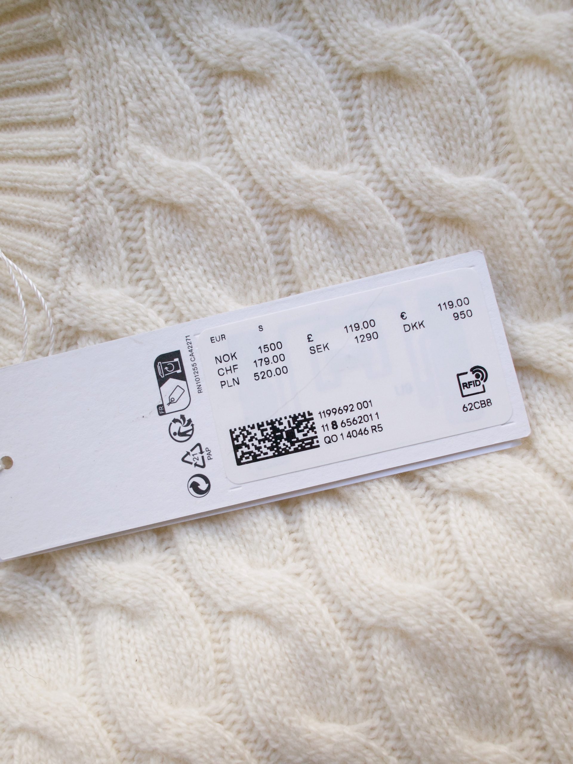 Sweter skandynawskiej marki Arket. Dłuższy fason, warkoczowy splot, w 100% wykonany z wełny z certyfikatem RWS.