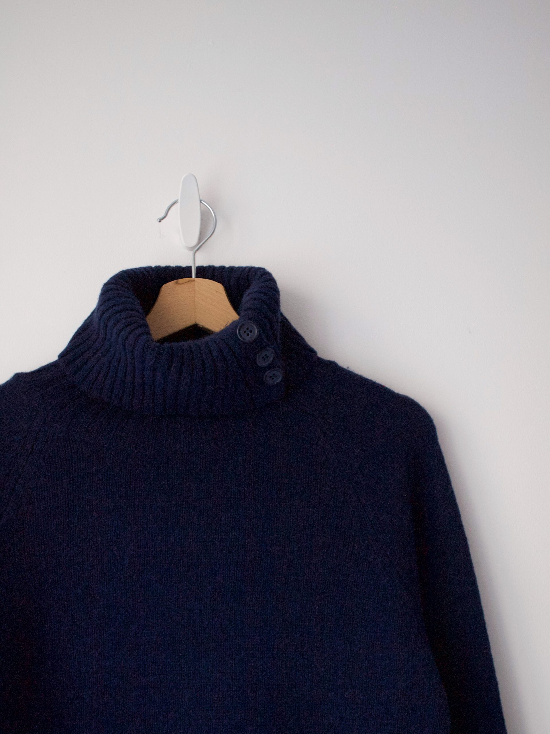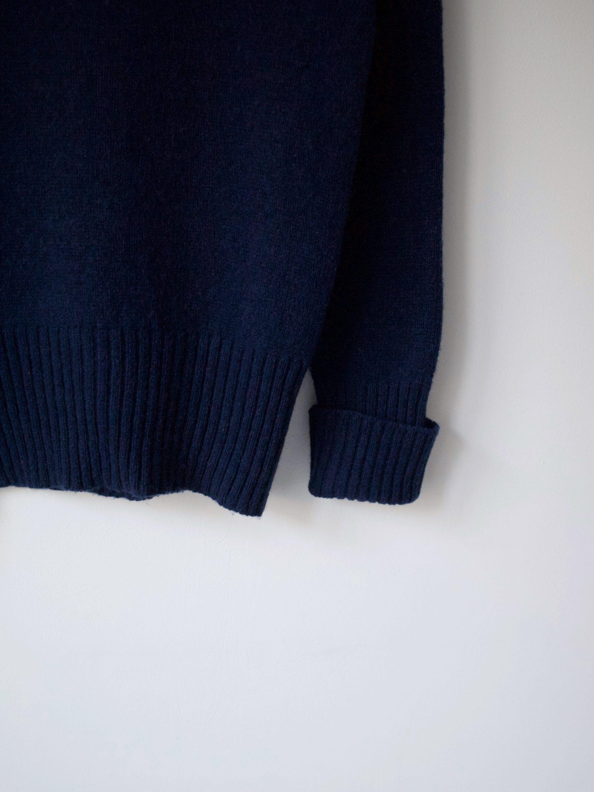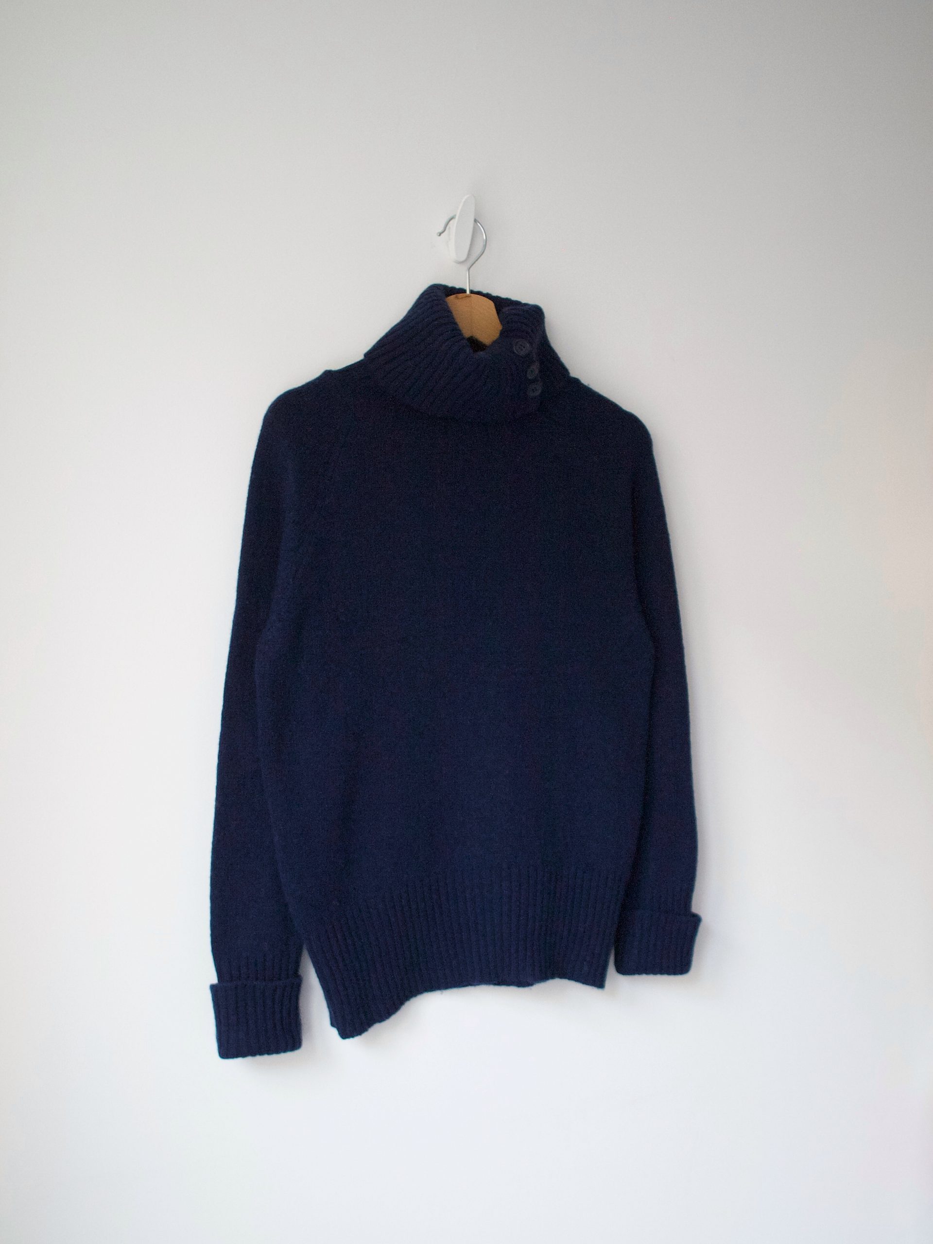 Granatowy golf marki Benetton, wykonany z grubej, ciepłej szetlandzkiej wełny. Rozmiar z metki: L Skład: 100% wełna Stan: bez wad Szerokość w klatce 47 cm Długośćcałkowita 61 cm