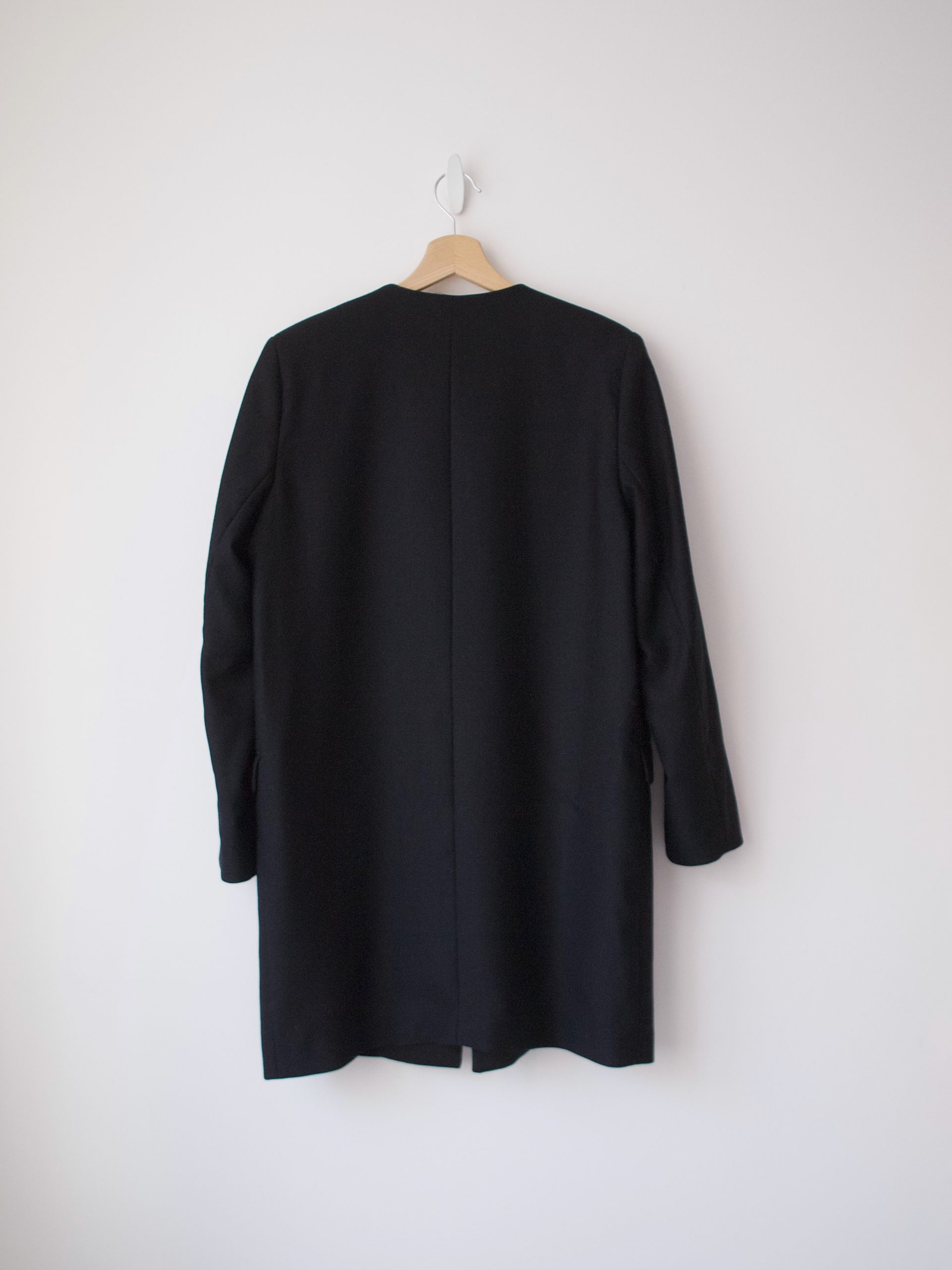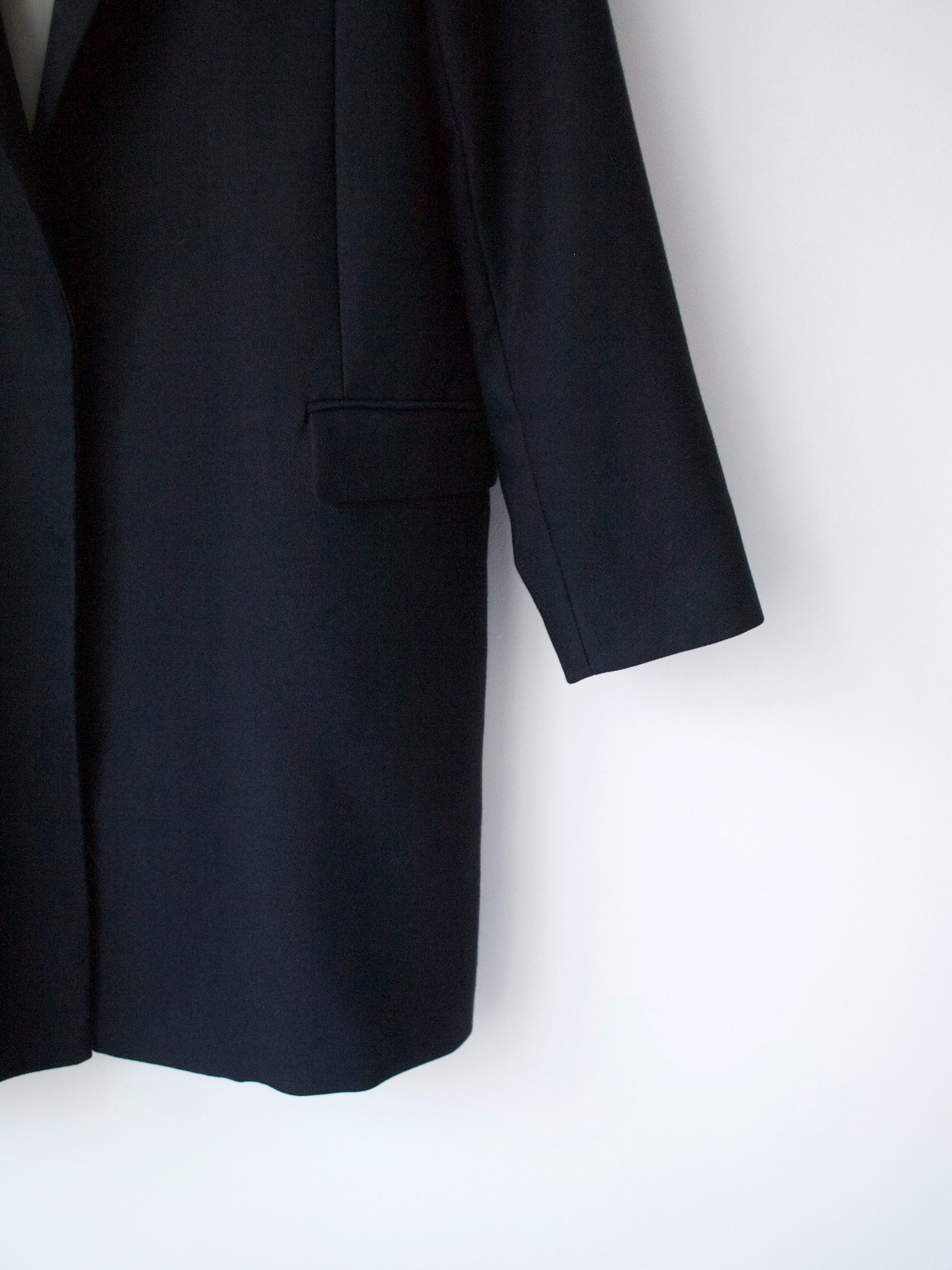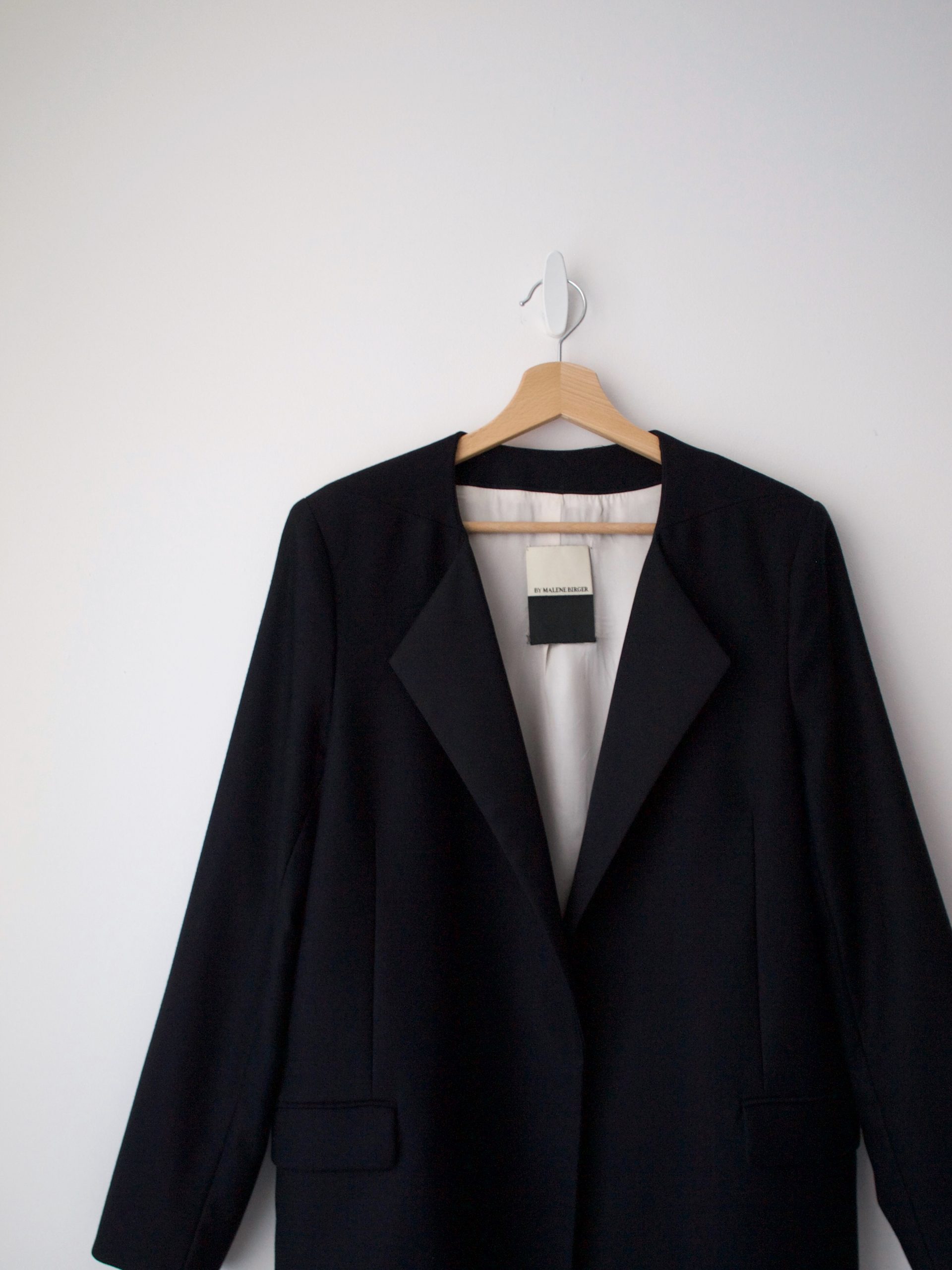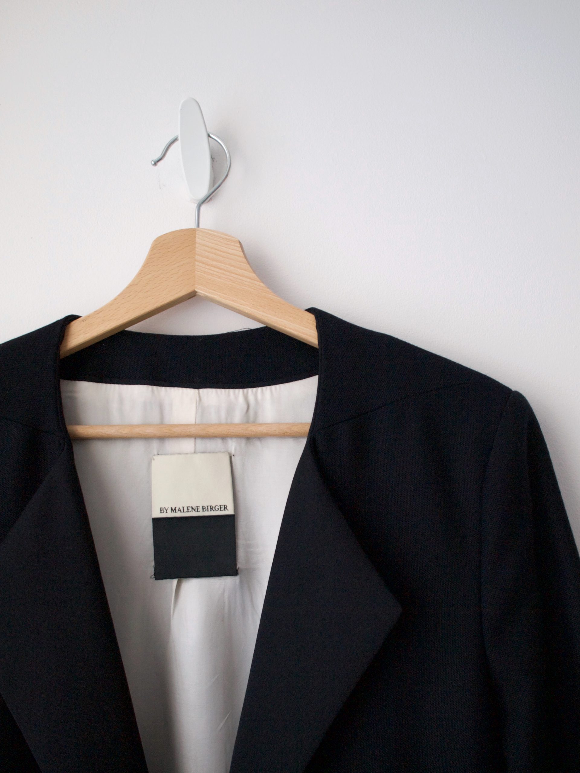 Elegancki płaszcz/marynarka o przedłużonym kroju luksusowej duńskiej marki By Malene Birger. Cena rynkowa nowych modeli tej marki to wydatek rzędu 1500–2000 zł. Model charakteryzuje się minimalistycznym fasonem, zapinanym na jeden ukryty guzik. Wykonany z dbałością o detale, z dwiema klasycznymi kieszeniami z klapami.