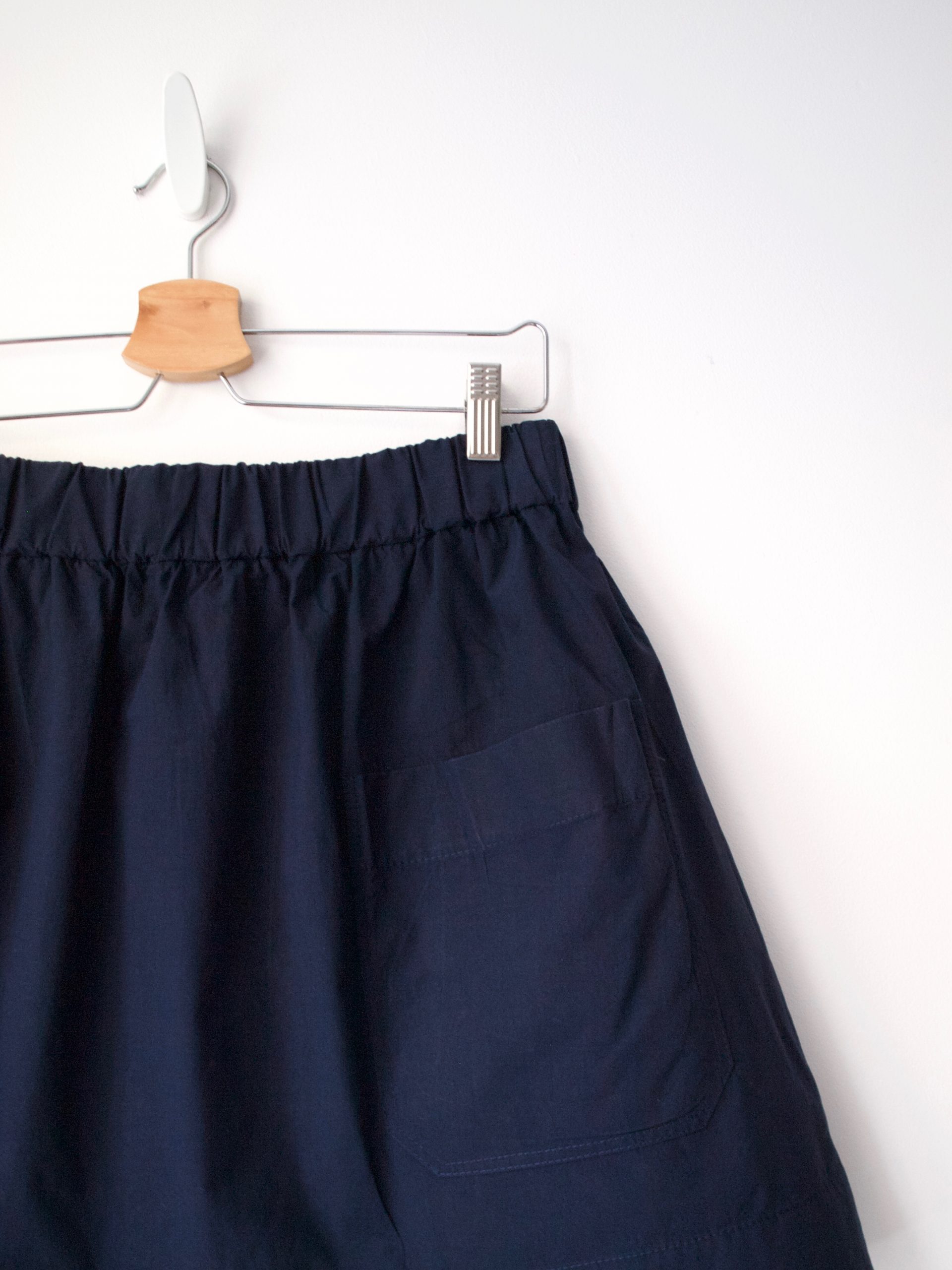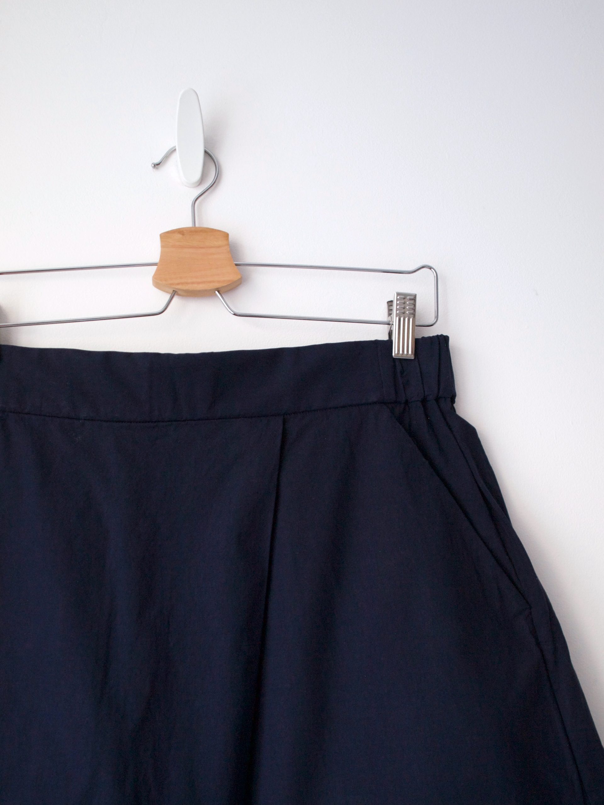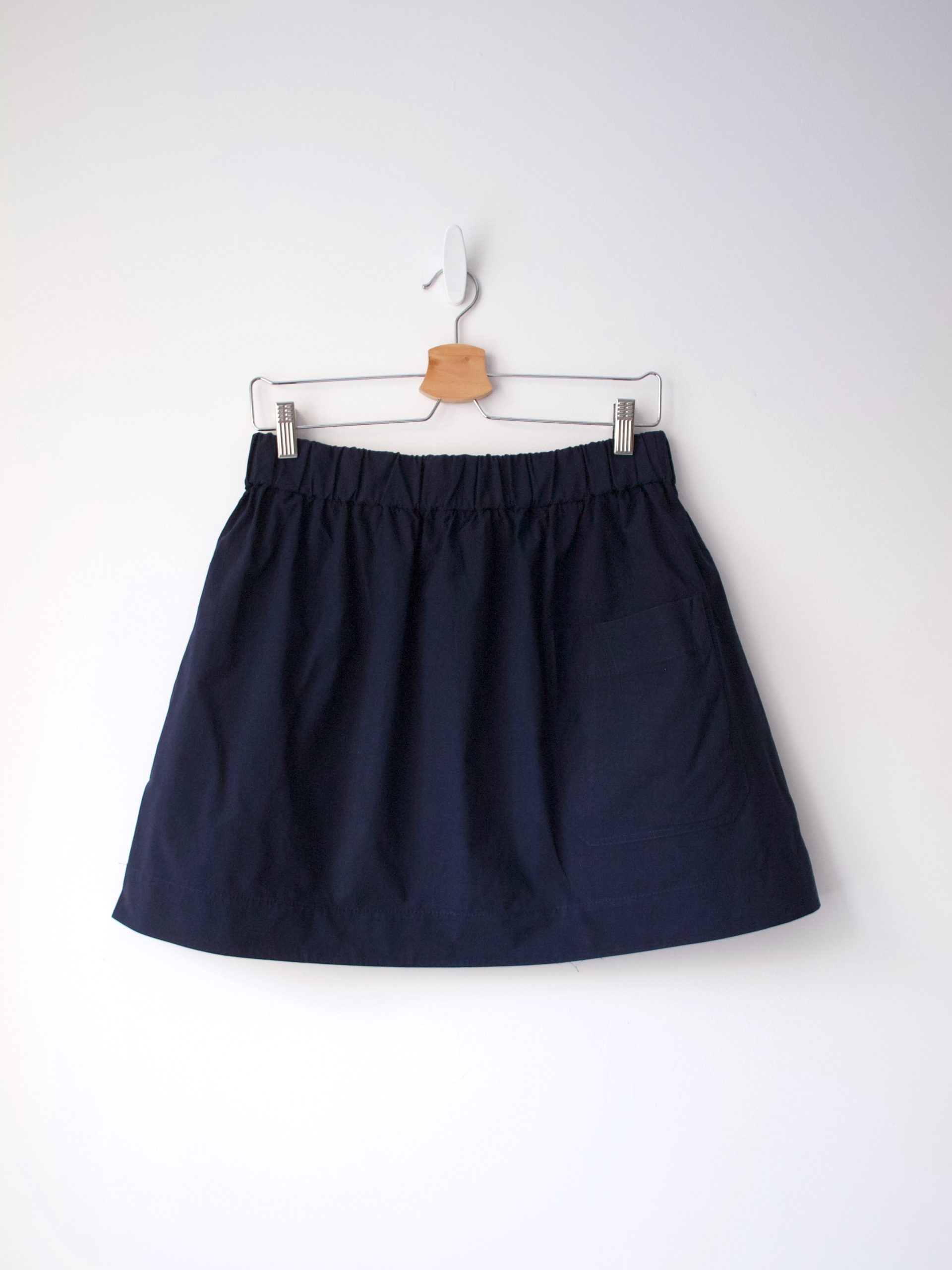 Spódnica o fasonie litery A, wyróżniająca się asymetryczną plisą z przodu. Wykonana z wysokiej jakości, sztywnej bawełny pima. Rozkloszowany krój uzupełnia częściowo elastyczny pas w talii, duże kieszenie boczne oraz naszywana kieszeń z tyłu. Kolor granatowy.