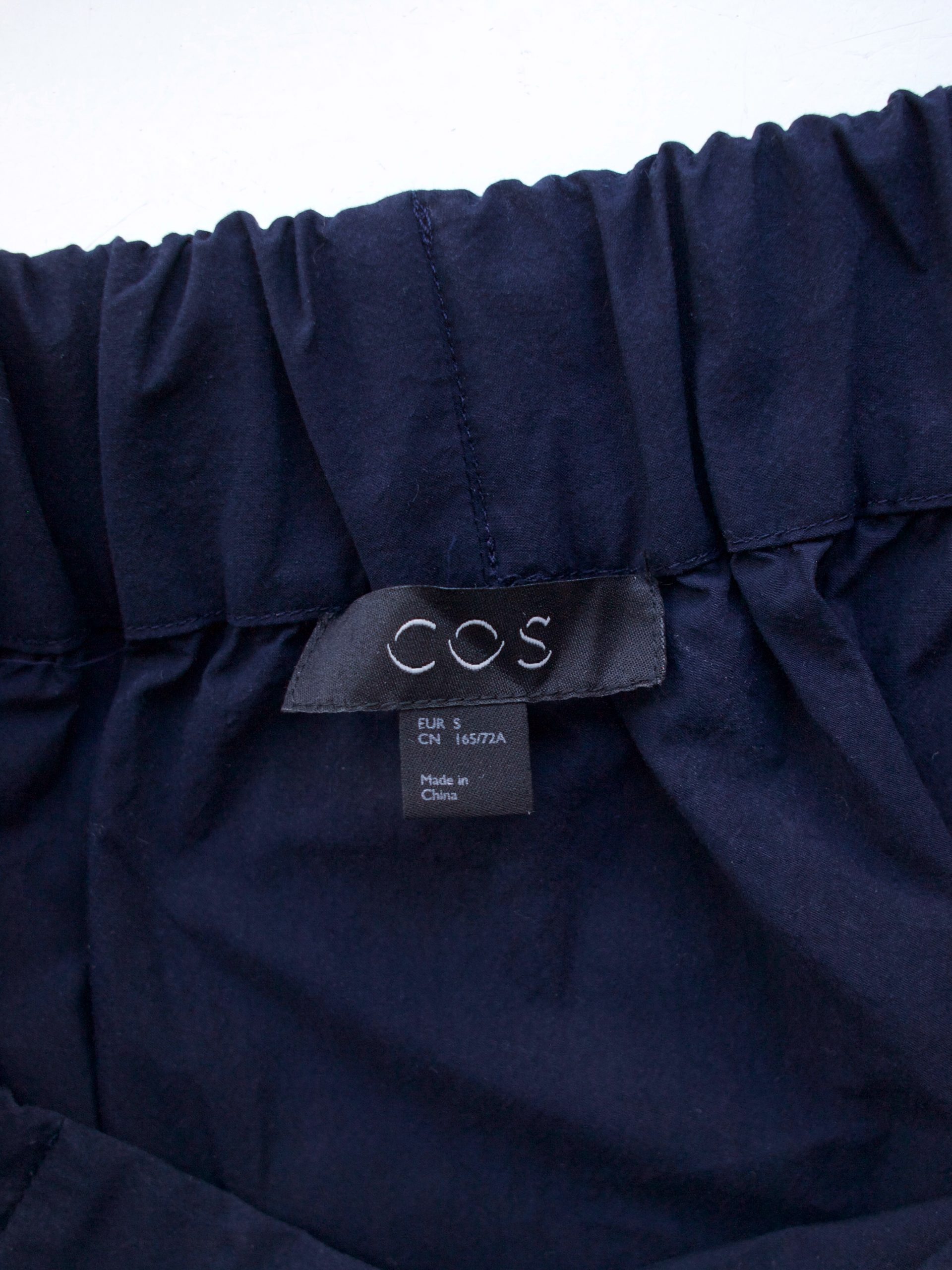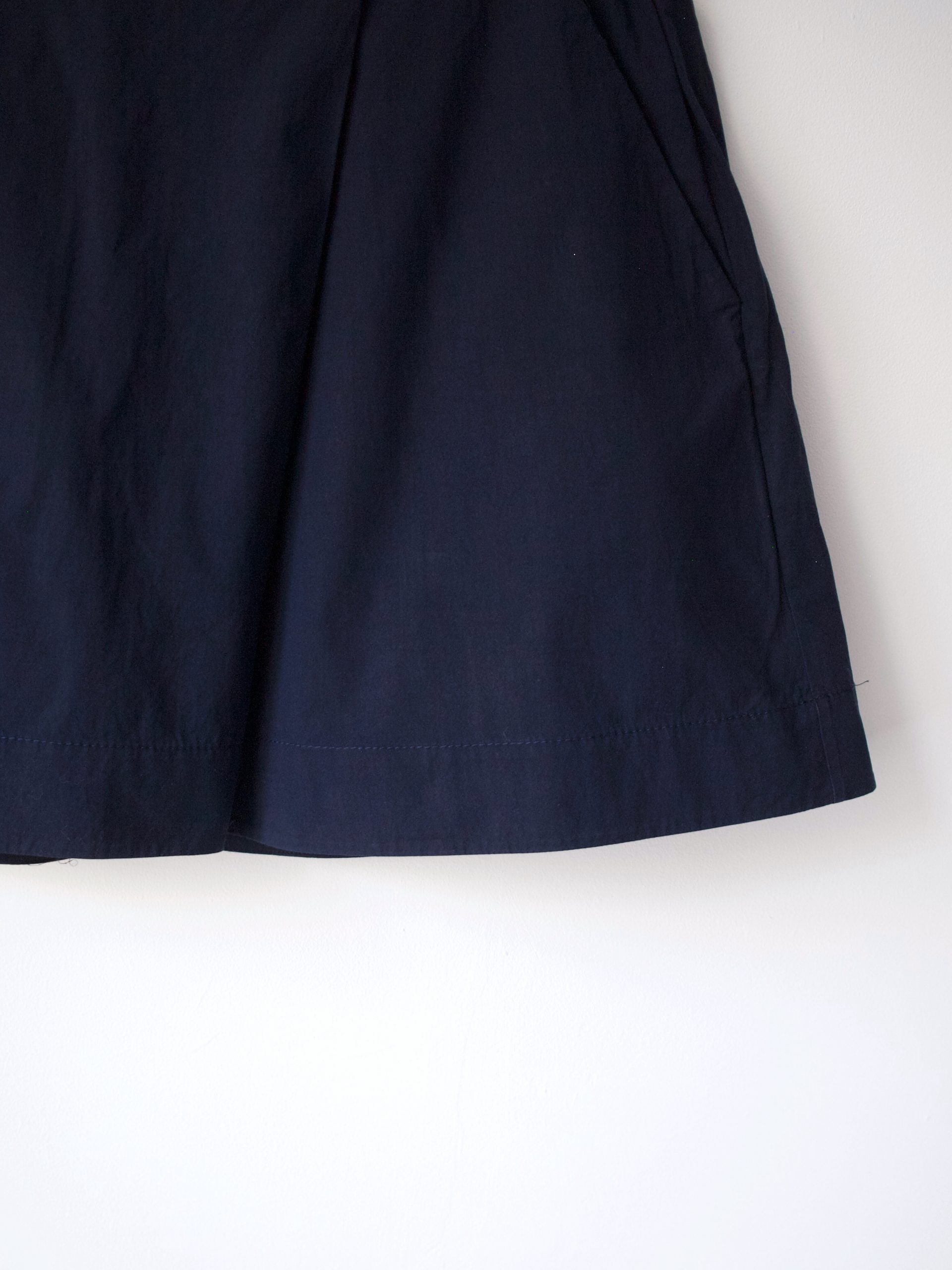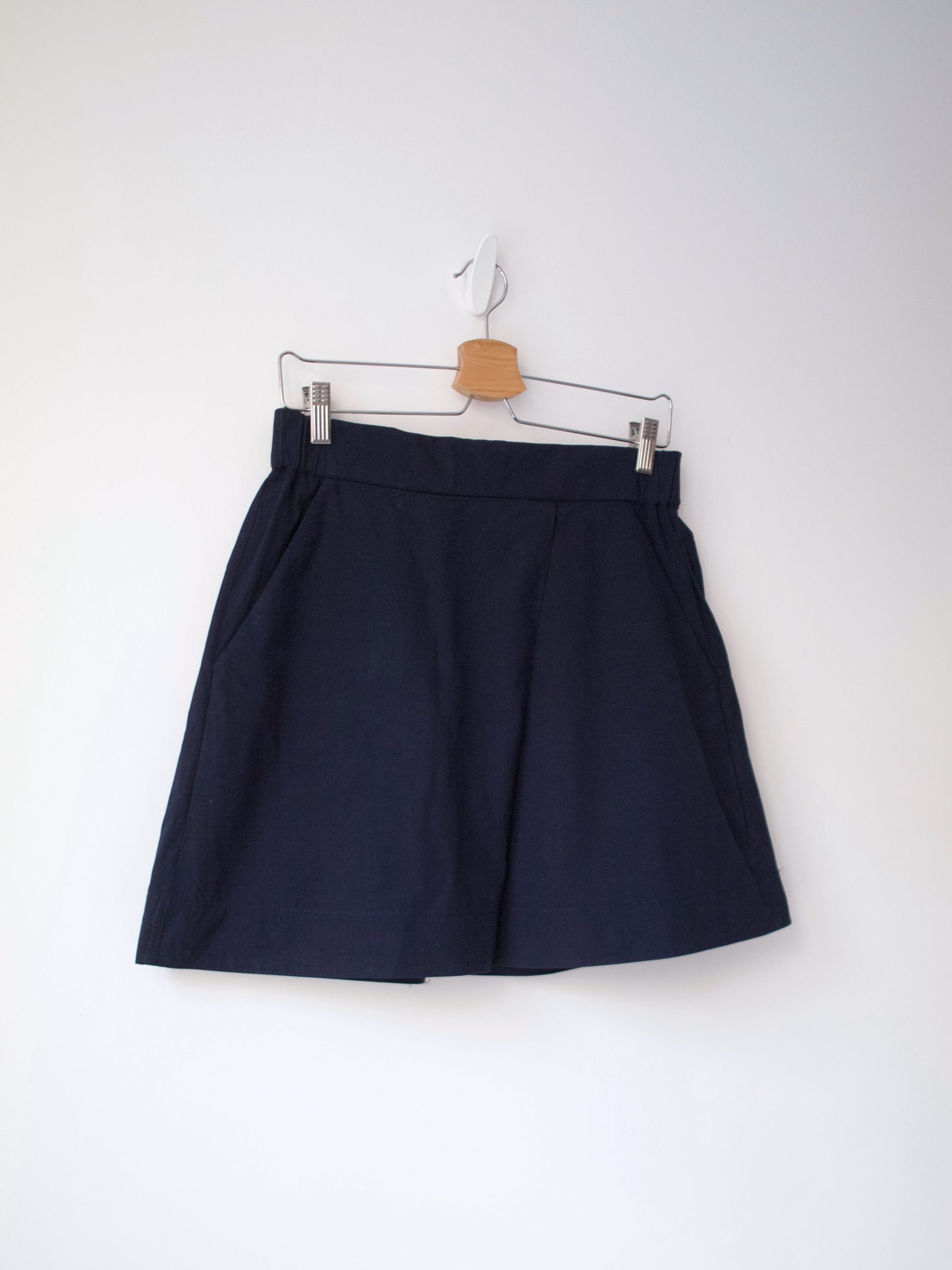 Spódnica o fasonie litery A, wyróżniająca się asymetryczną plisą z przodu. Wykonana z wysokiej jakości, sztywnej bawełny pima. Rozkloszowany krój uzupełnia częściowo elastyczny pas w talii, duże kieszenie boczne oraz naszywana kieszeń z tyłu. Kolor granatowy.