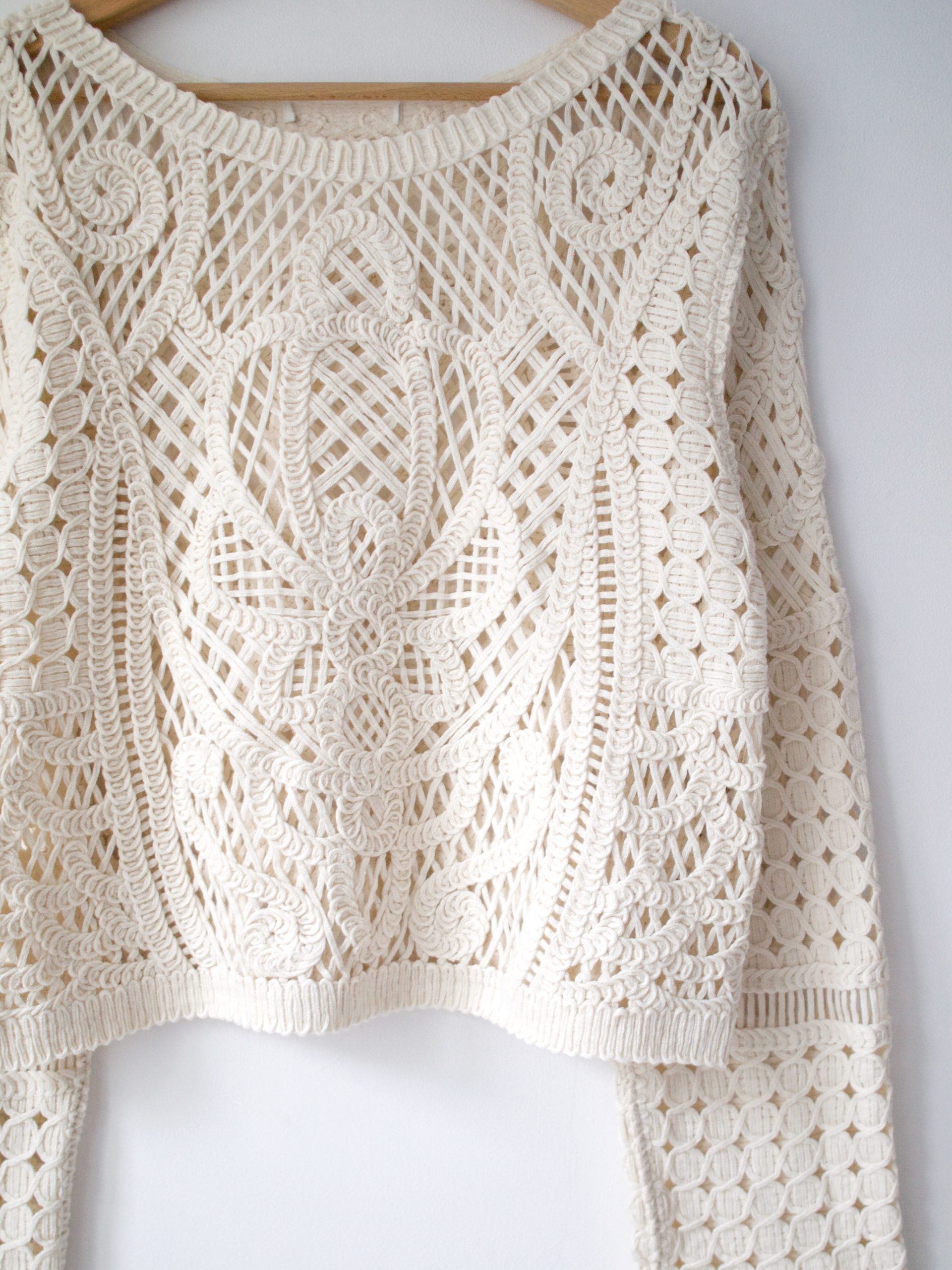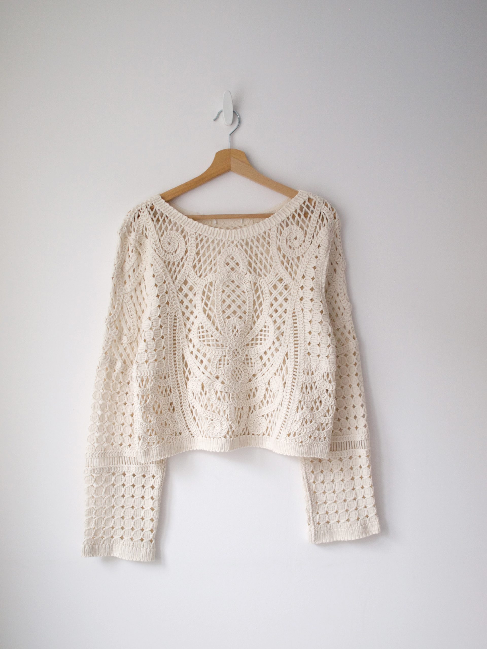 Sweter crochet w śmietankowym kolorze. Wszystkie metki zostały wycięte. Rozmiar z metki: brak Skład: brak metki, bawełna Stan: bez wad Szerokość w klatce 46 cm Długośćcałkowita 50 cm