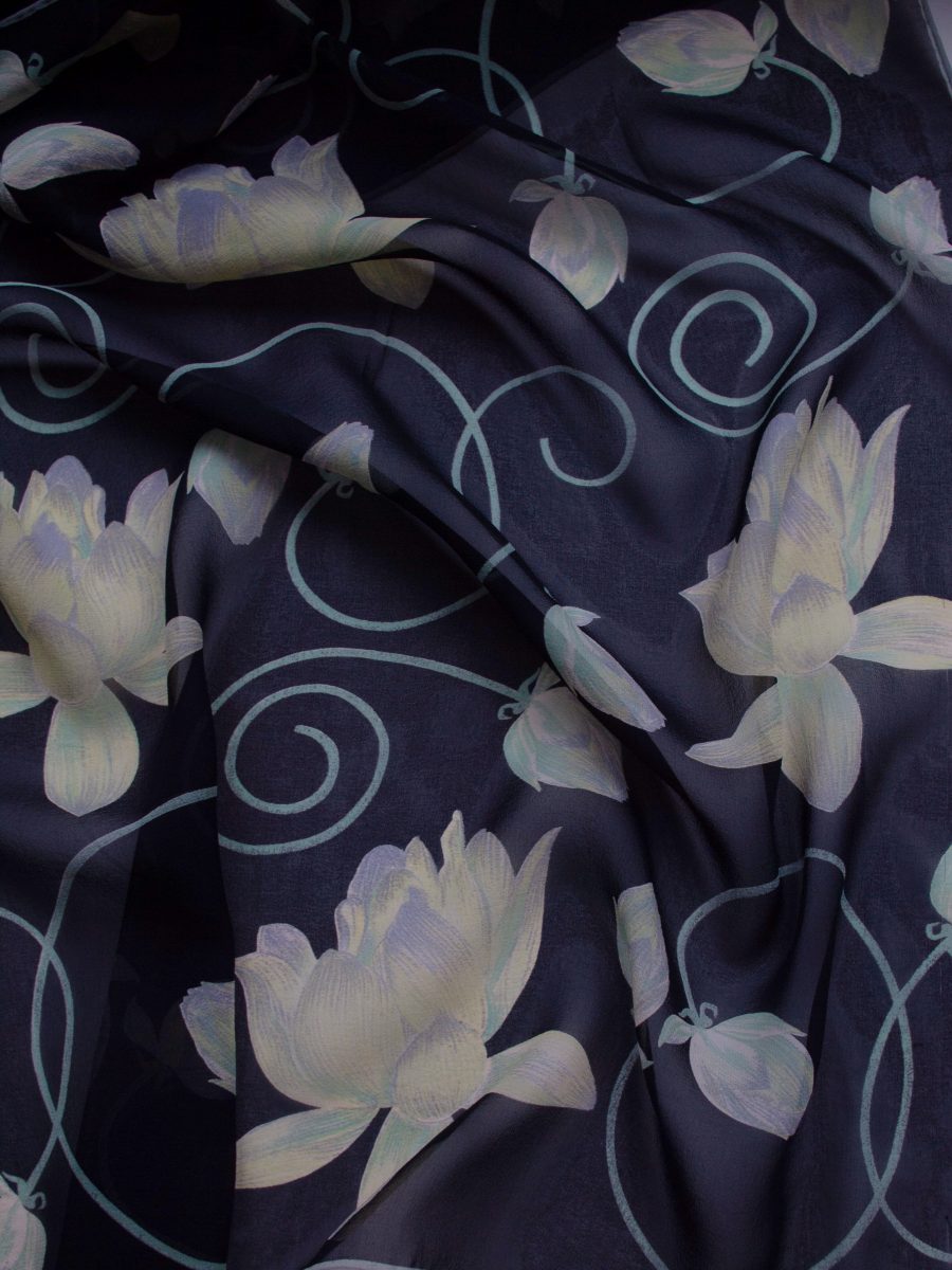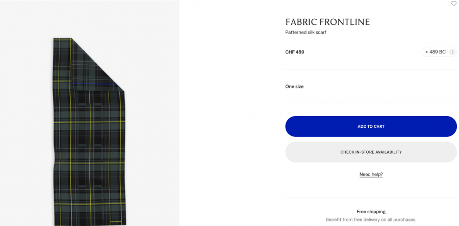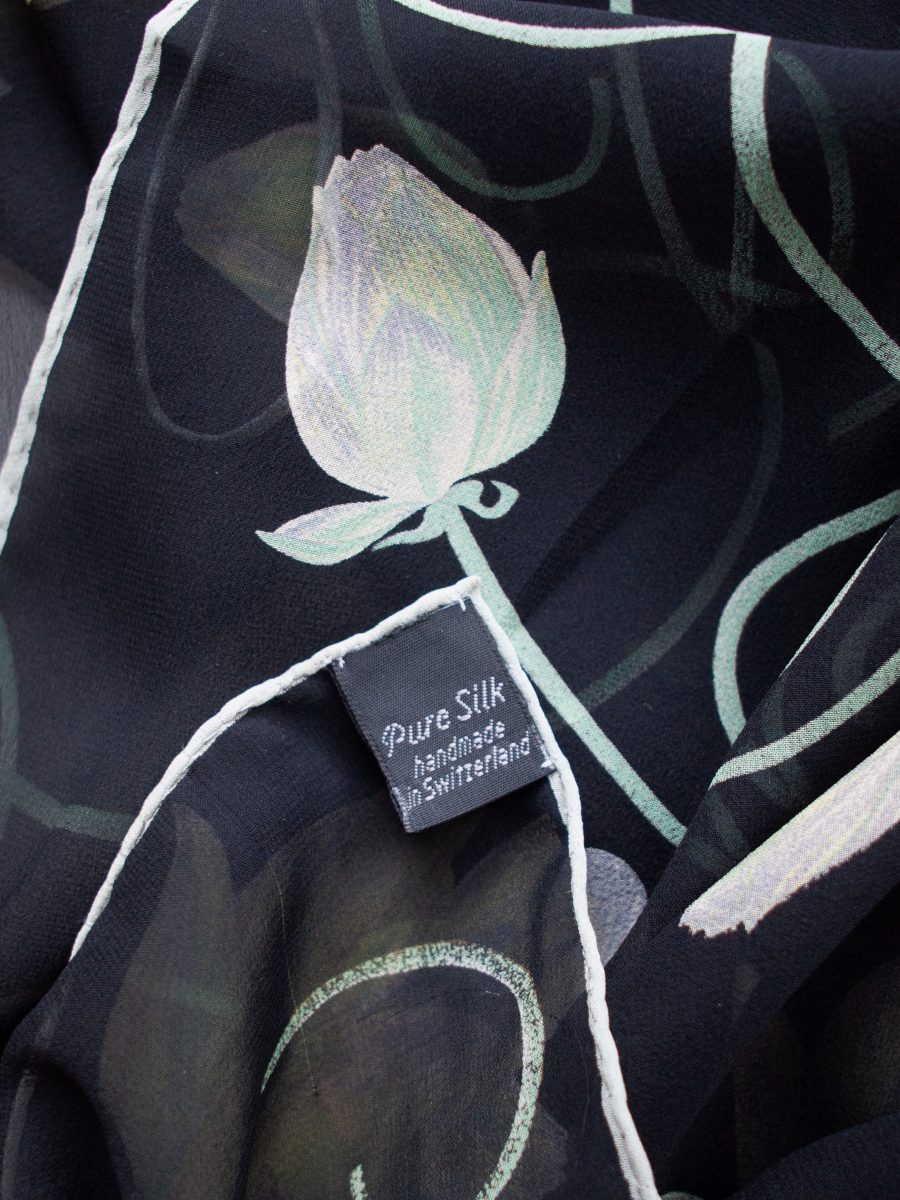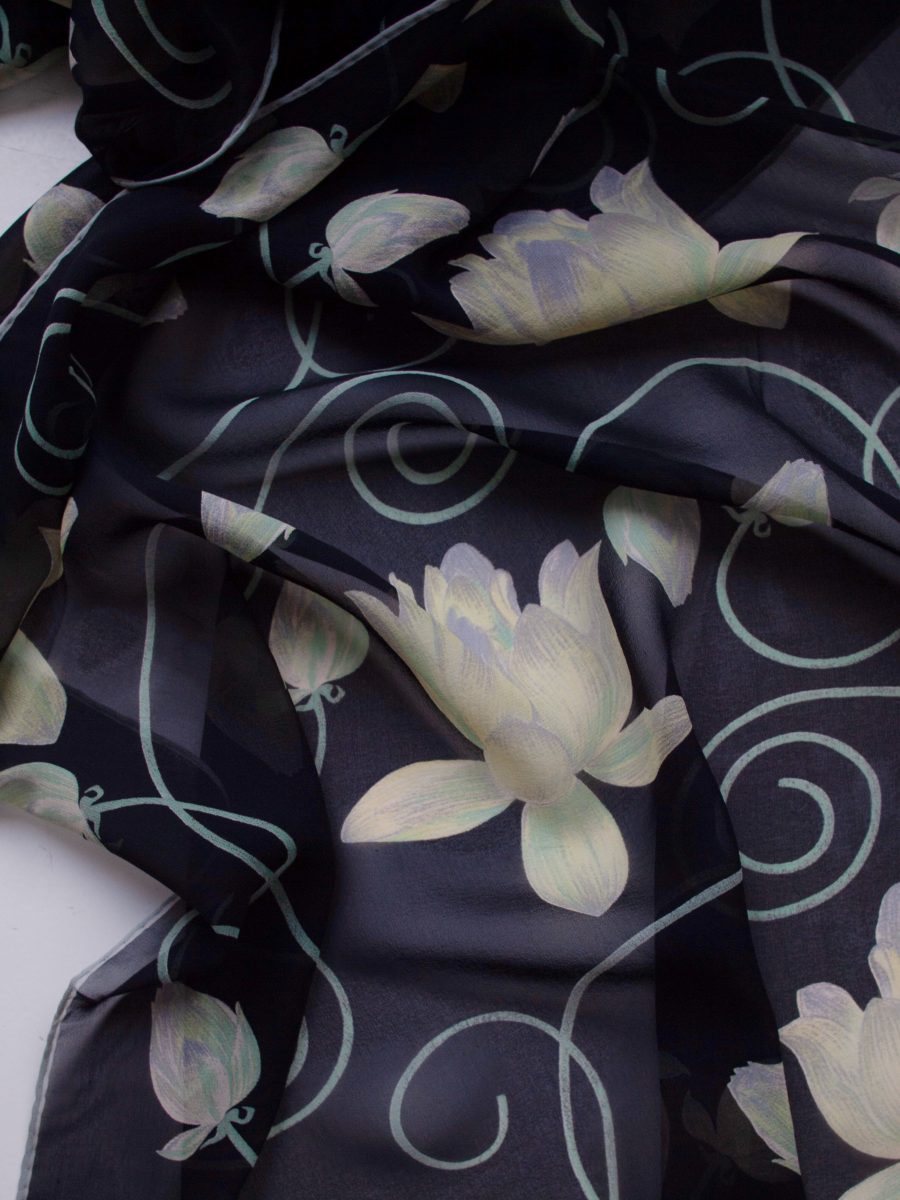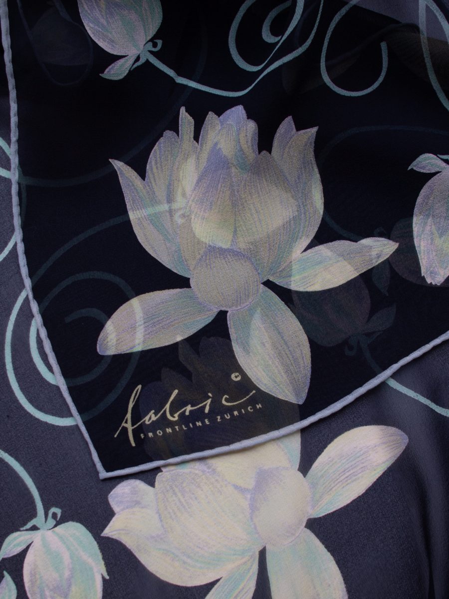 Szal luksusowej szwajcarskiej marki Fabric Frontline Zurich, znanej z produkcji najwyższej jakości dodatków z jedwabiu i wełny. Model wykonany z cienkiego, delikatnego jedwabiu w kwiatowy motyw. Ręcznie rolowane brzegi, wyprodukowany w Szwajcarii. Nowe jedwabne szale tej marki kosztują około 489 CHF, czyli ponad 2200 zł.