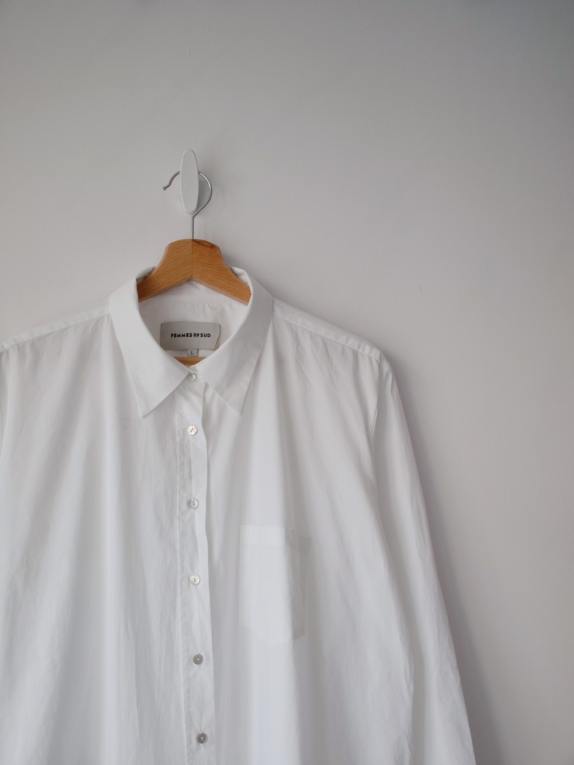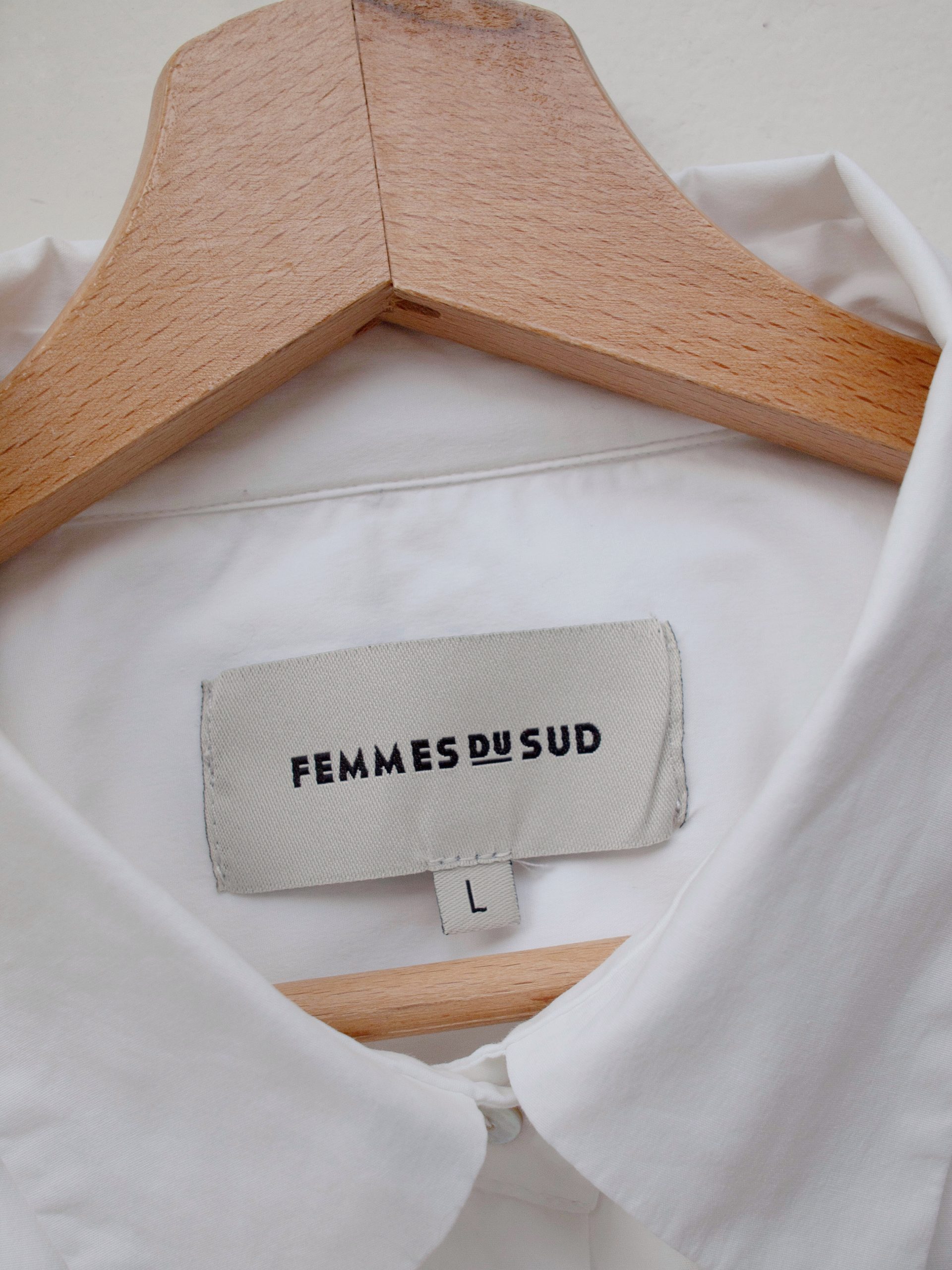 Koszula ekskluzywnej holenderskiej marki Femmes du Sud. Luźny fason, zapinana na guziki z naturalnej muszli.