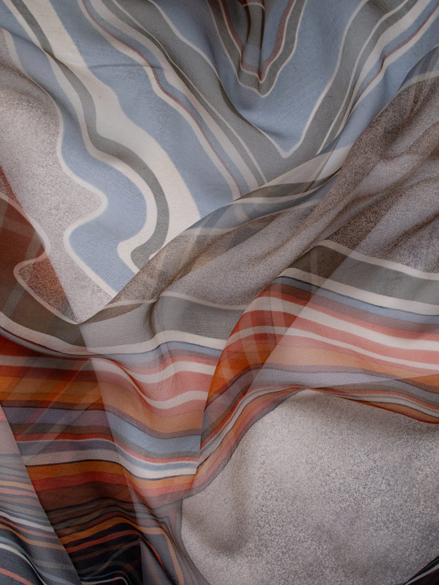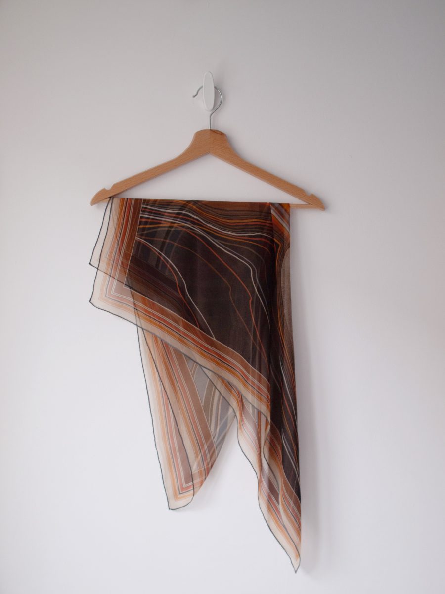 Chusta vintage szwajcarskiej marki Fisba Stoffels, wykonana z cienkiego jedwabnego szyfonu w abstrakcyjny wzór. Ręcznie rolowane brzegi. Stan: bardzo dobry Wymiary:79×79 cm