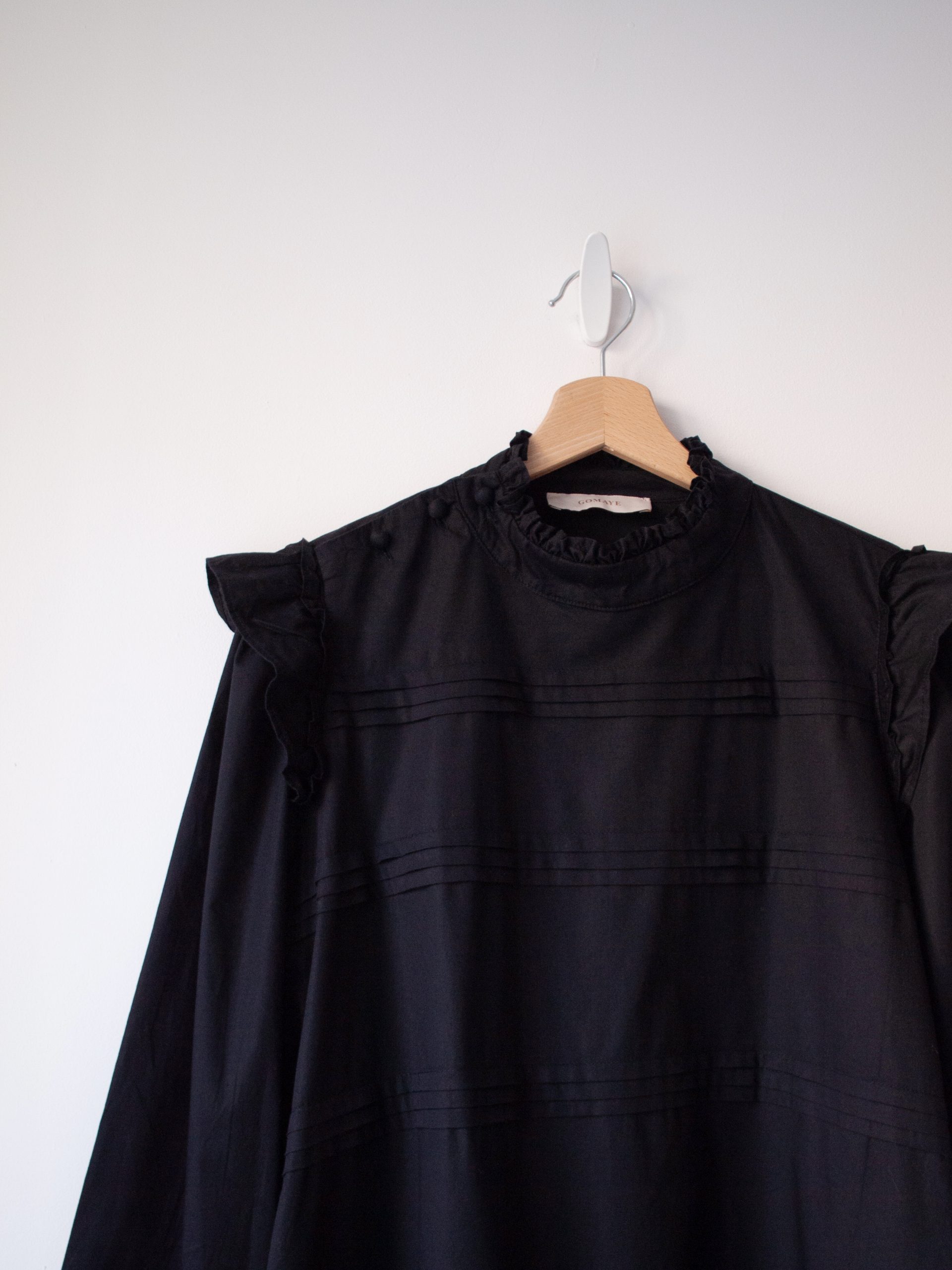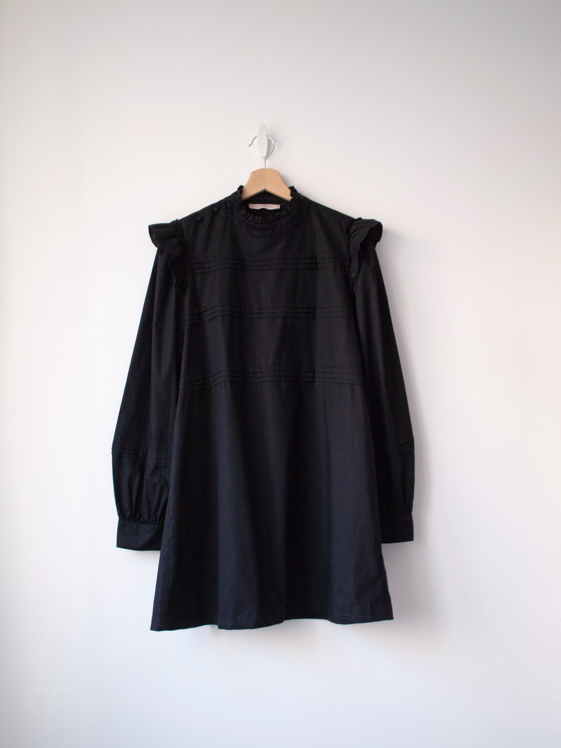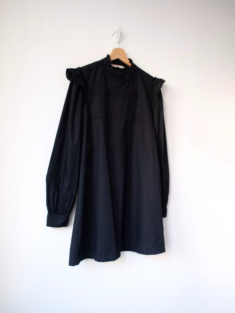 Sukienka skandynawskie marki Gomaye o luźnym kroju, z długimi rękawami zakończonymi mankietami. Ozdobiona subtelnymi falbanami przy ramionach i dekolcie oraz delikatnymi przeszyciami z przodu.