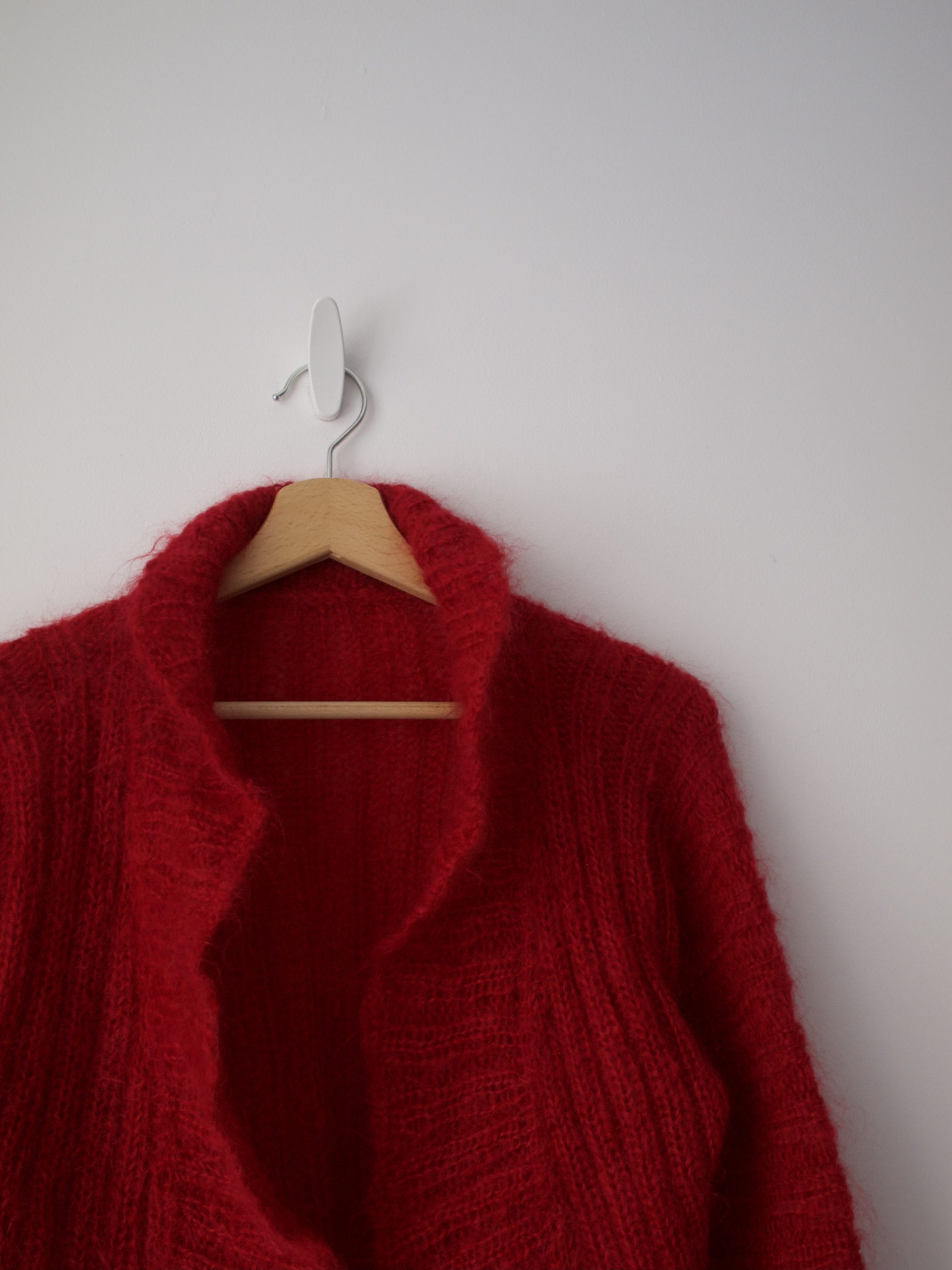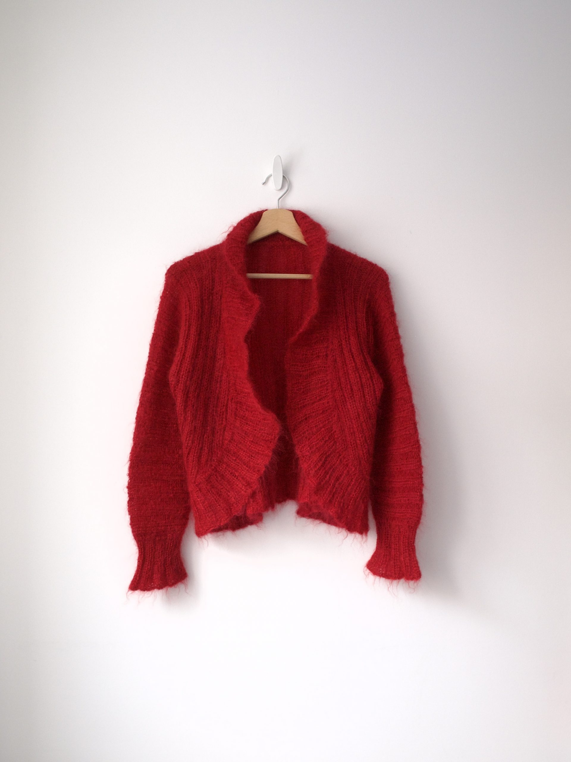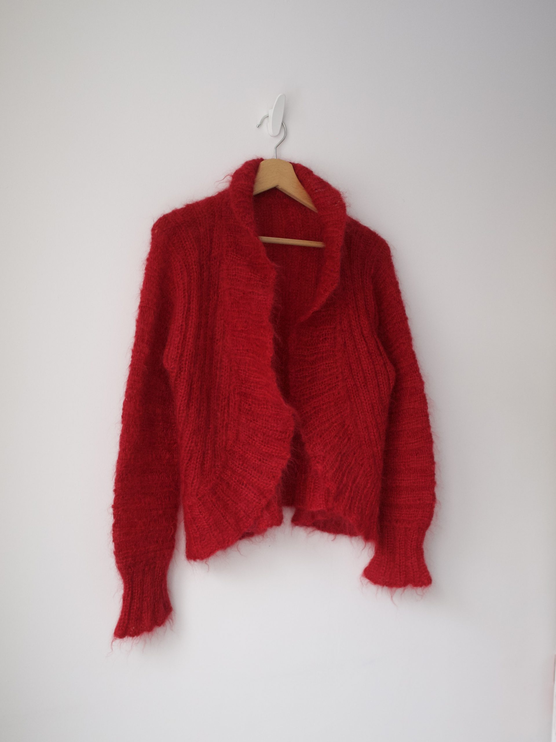 Unikatowy, bardzo puszysty kardigan hand made. Rozmiar z metki: brak, polecam na xs-s Skład: brak metki, moher Stan: bez wad Szerokość w klatce ok 43 cm Długośćcałkowita 53 cm