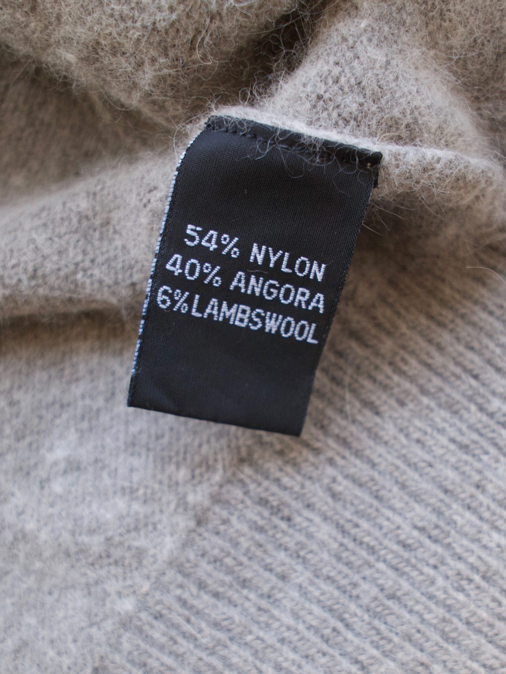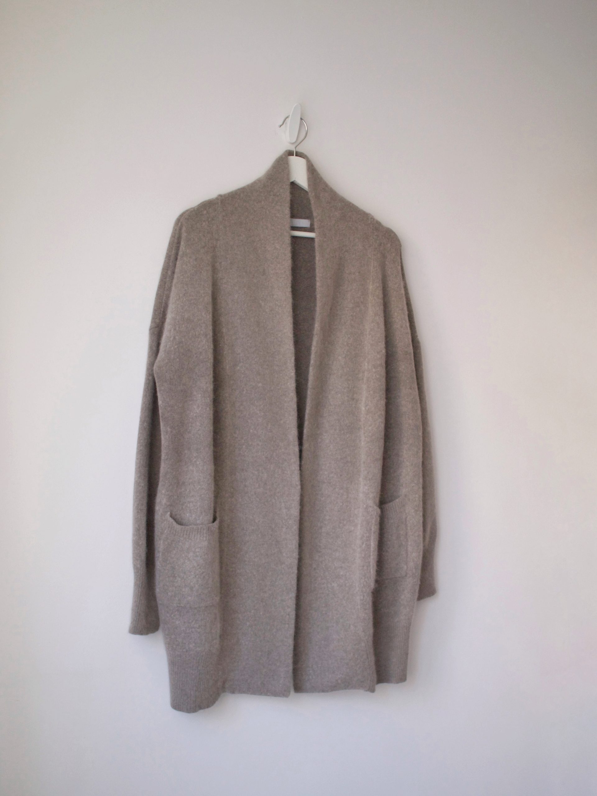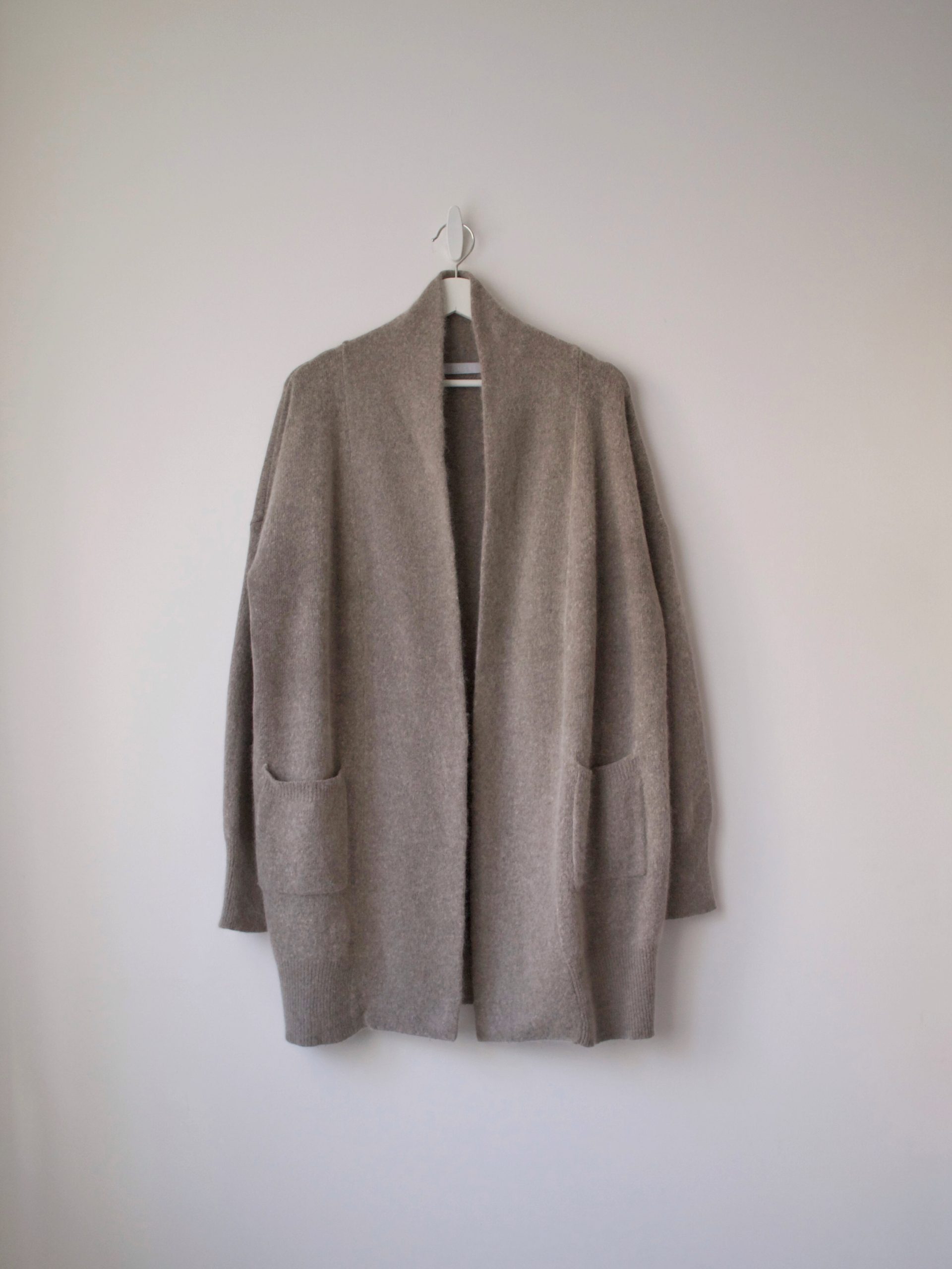 Bardzo puszysty kardigan norweskiej marki Haust, wykonany z materiału z dodatkiem angory. Kolor: taupe/szaro-beżowy.