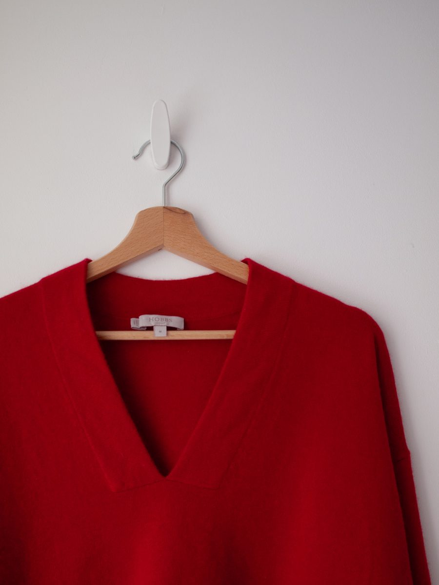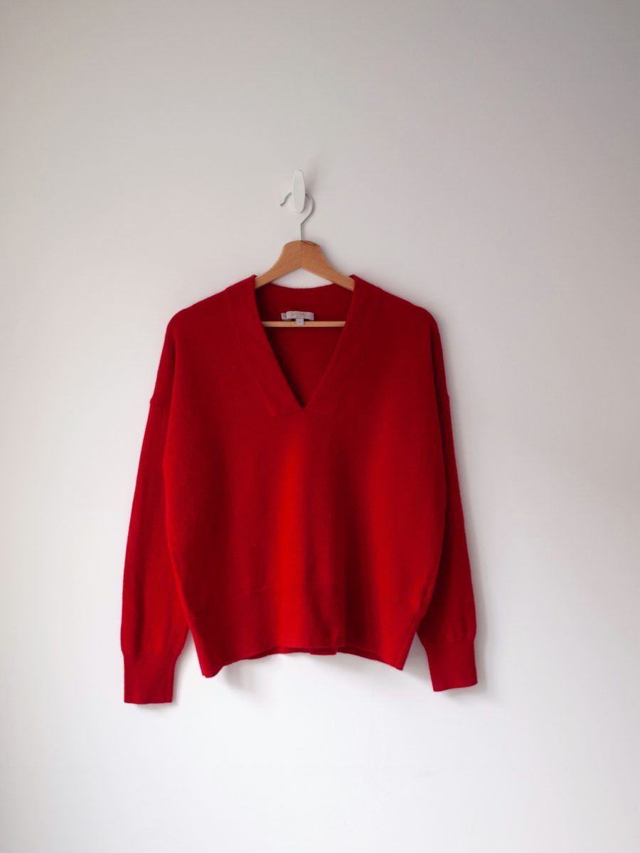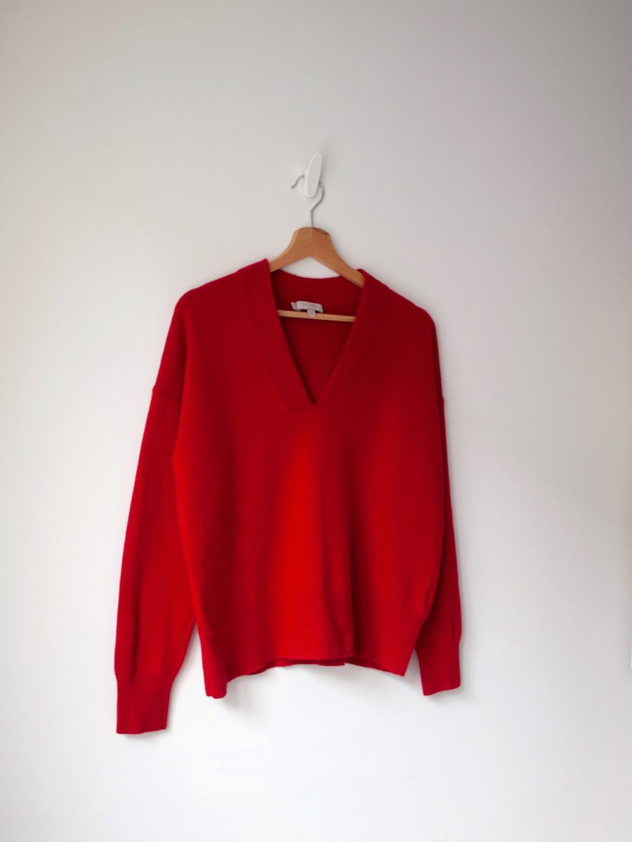 Klasyczny sweter M&S z dekoltem w serek. Skład to 100% kaszmir, bardzo dobry stan, jest minimalnie sfilcowany, nie jest to zauważalne, po prostu jest trochę sztywniejszy.