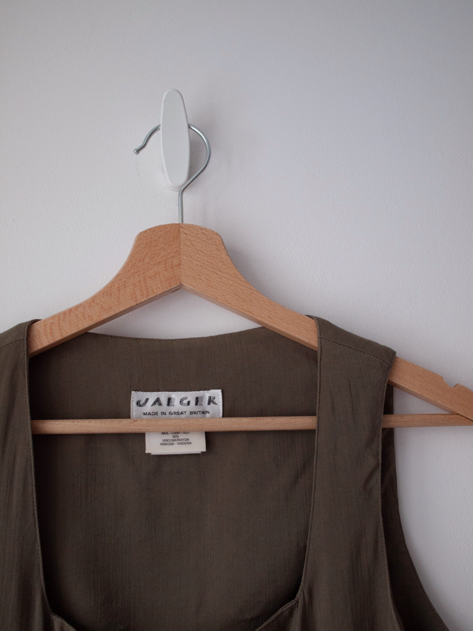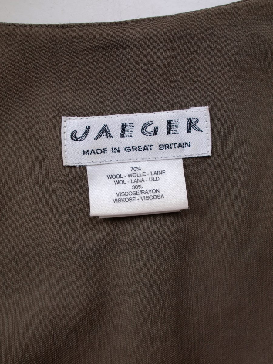 Sukienka brytyjskiej marki Jaeger, wykonana z materiału z dużym dodatkiem wełny. Idealna do noszenia z cienkim golfem. Rozmiar z metki: 12 Skład: 70% wełna, 30% wiskoza Stan: bez wad Szerokość w klatce 45 cm Długośćcałkowita 90 cm