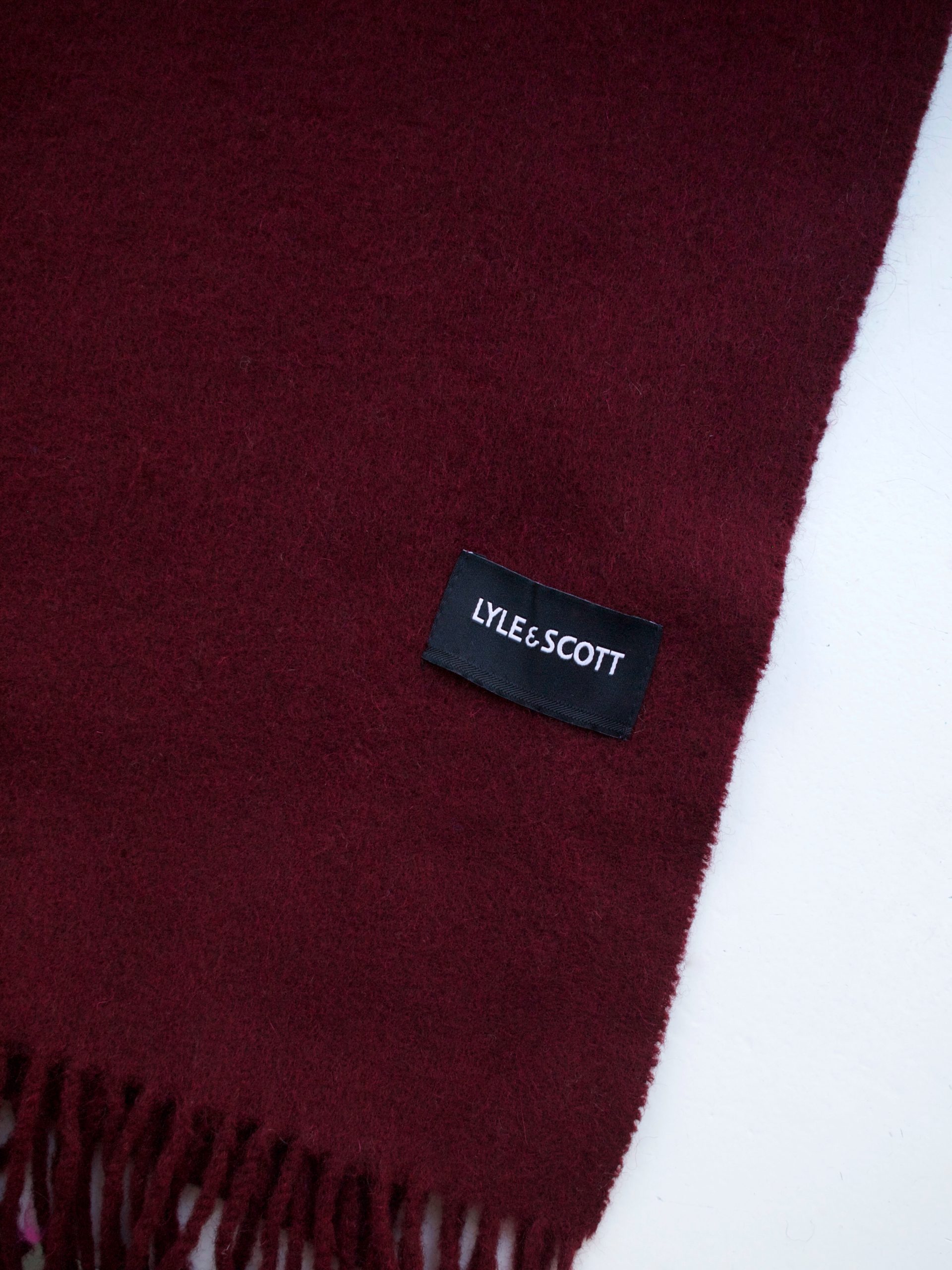 Burgundowy wełniany szalik szkockiej marki Lyle & Scott, cenionej za najwyższą jakość i rzemiosło. Skład: brak metki, 100% wełna Stan: bez wad Wymiary bez frędzli 178*31 cm