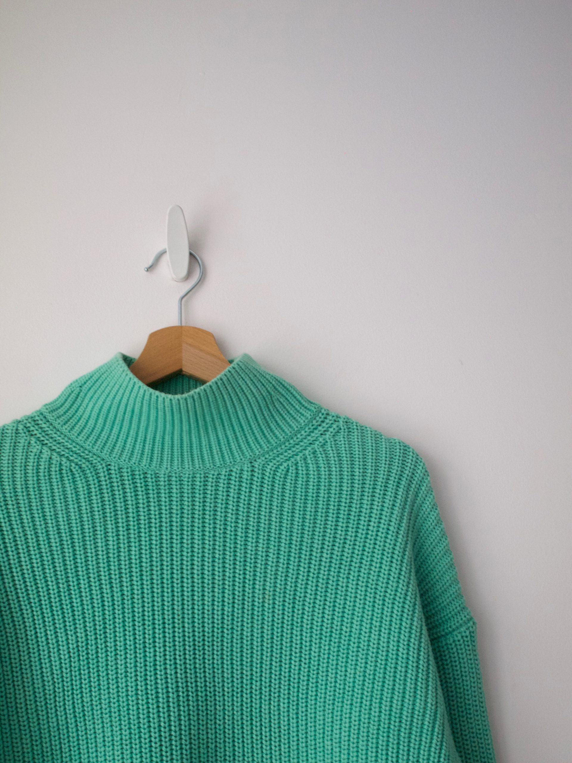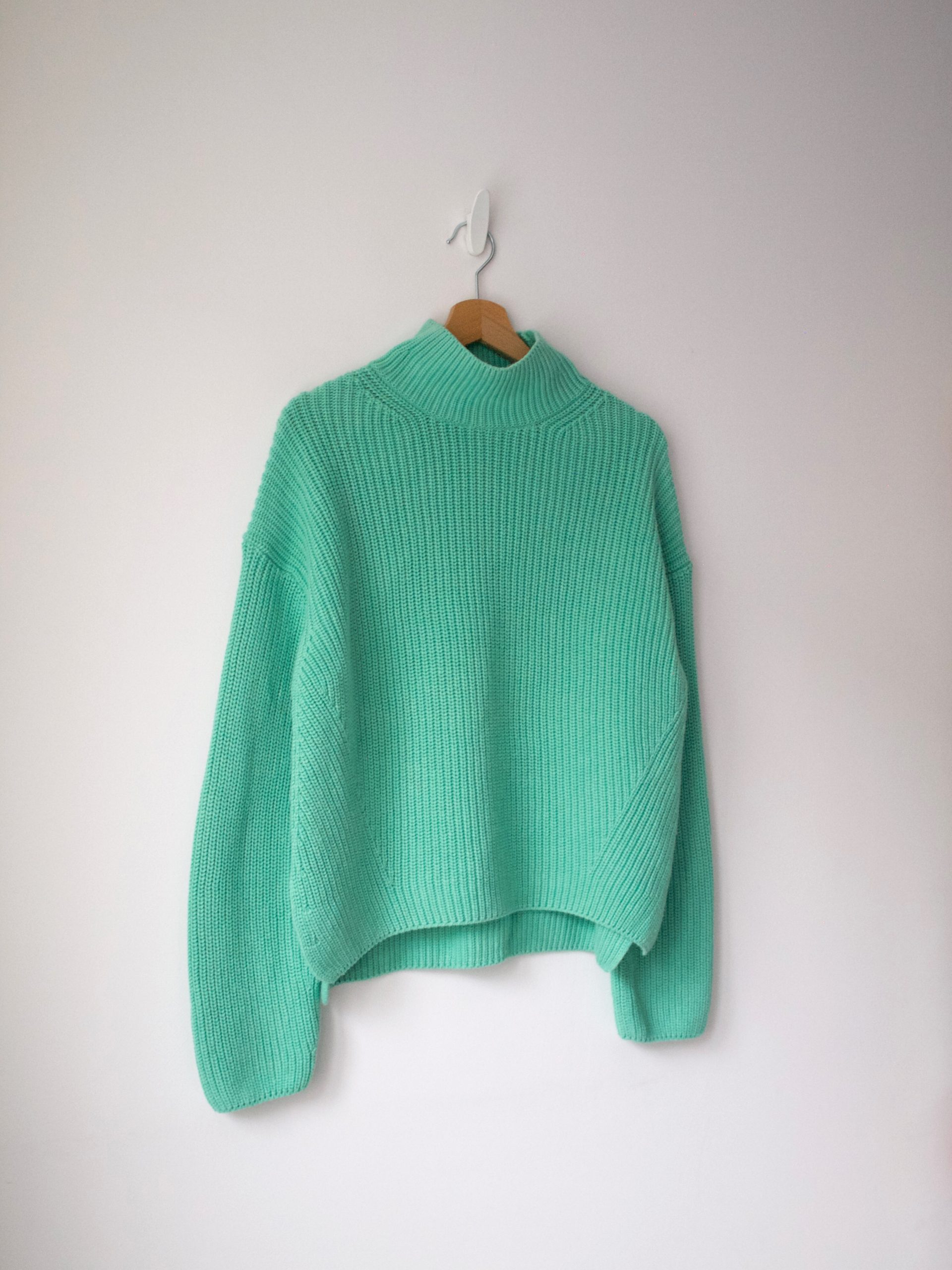 Minimalistyczny wełniany sweter z golfem. Idealny stan, materiał nie gryzie. Brak metki z rozmiarem, na oko jest to L, na mniejsze rozmiary idealny jako oversize (proszę sprawdzać wymiary).