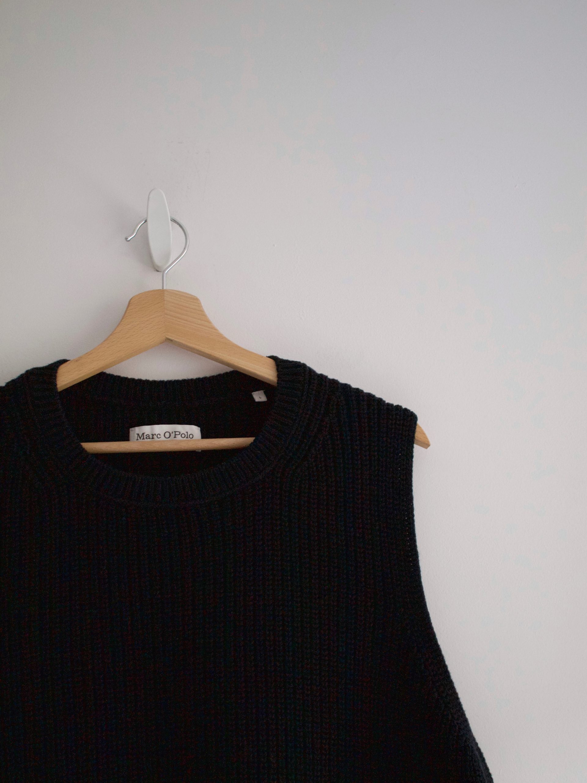 Bezrękawnik marki Marc O’Polo o grubym splocie. Rozmiar z metki: L Skład: brak metki, bawełna z dodatkiem wełny Stan: bez wad Szerokość w klatce 55 cm Długośćcałkowita 56 cm