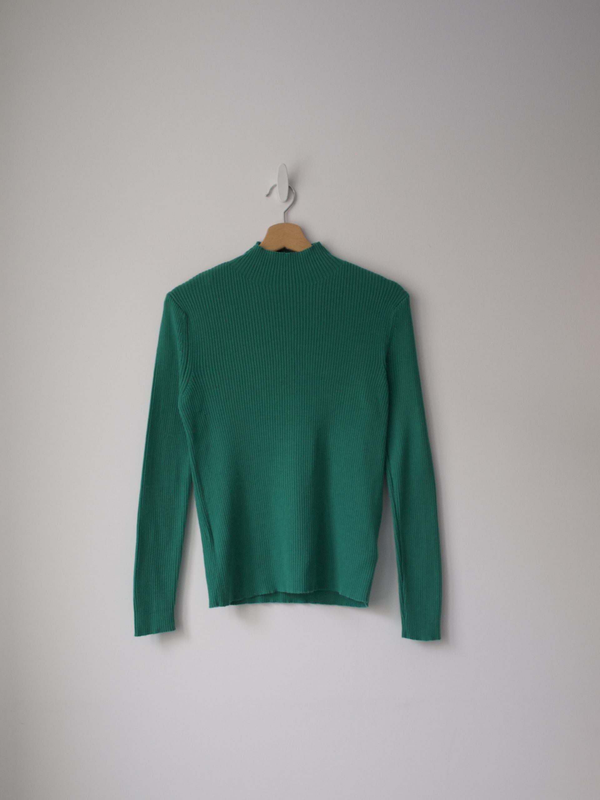 Minimalistyczny wełniany sweter z golfem. Idealny stan, materiał nie gryzie. Brak metki z rozmiarem, na oko jest to L, na mniejsze rozmiary idealny jako oversize (proszę sprawdzać wymiary).