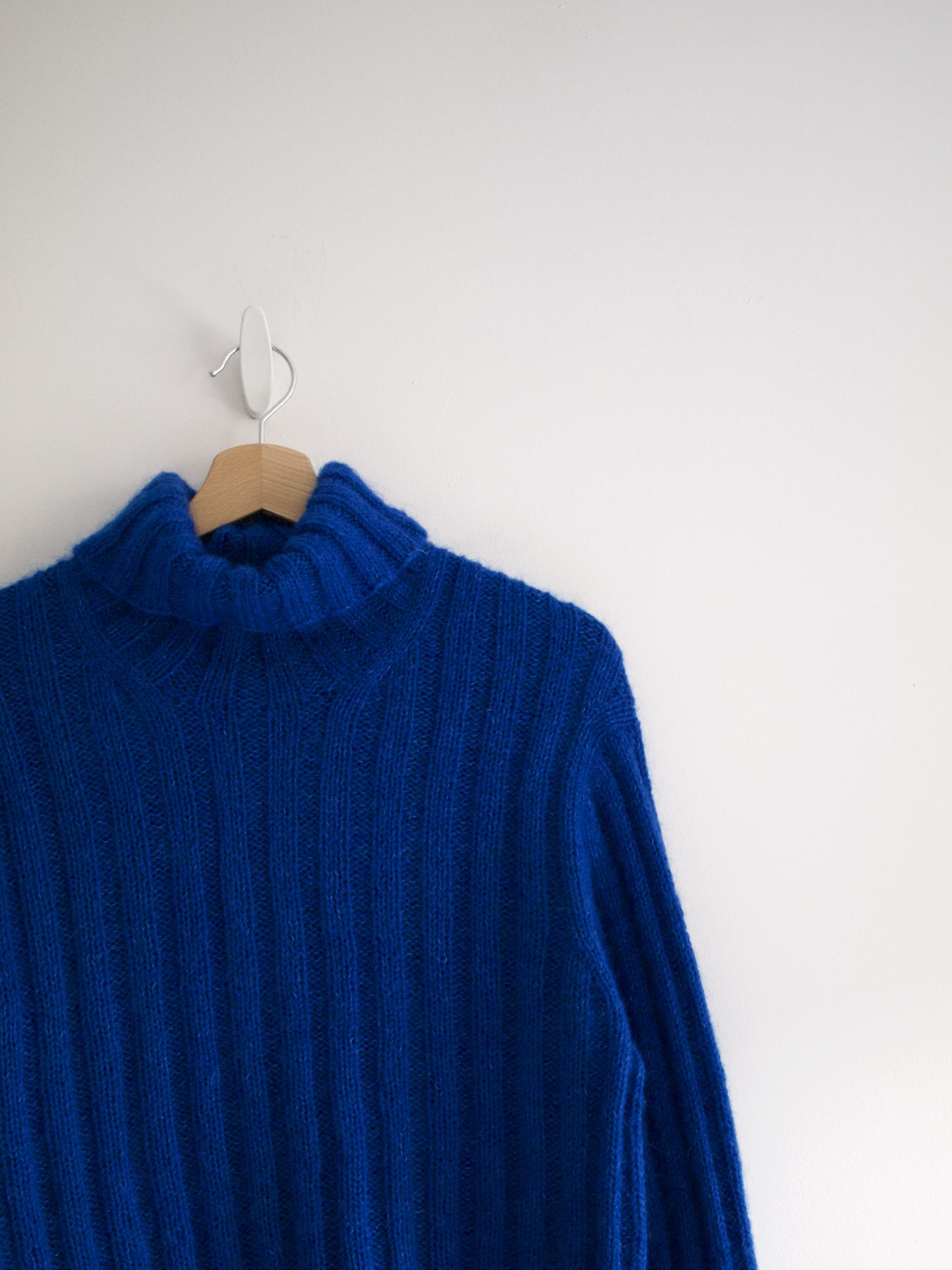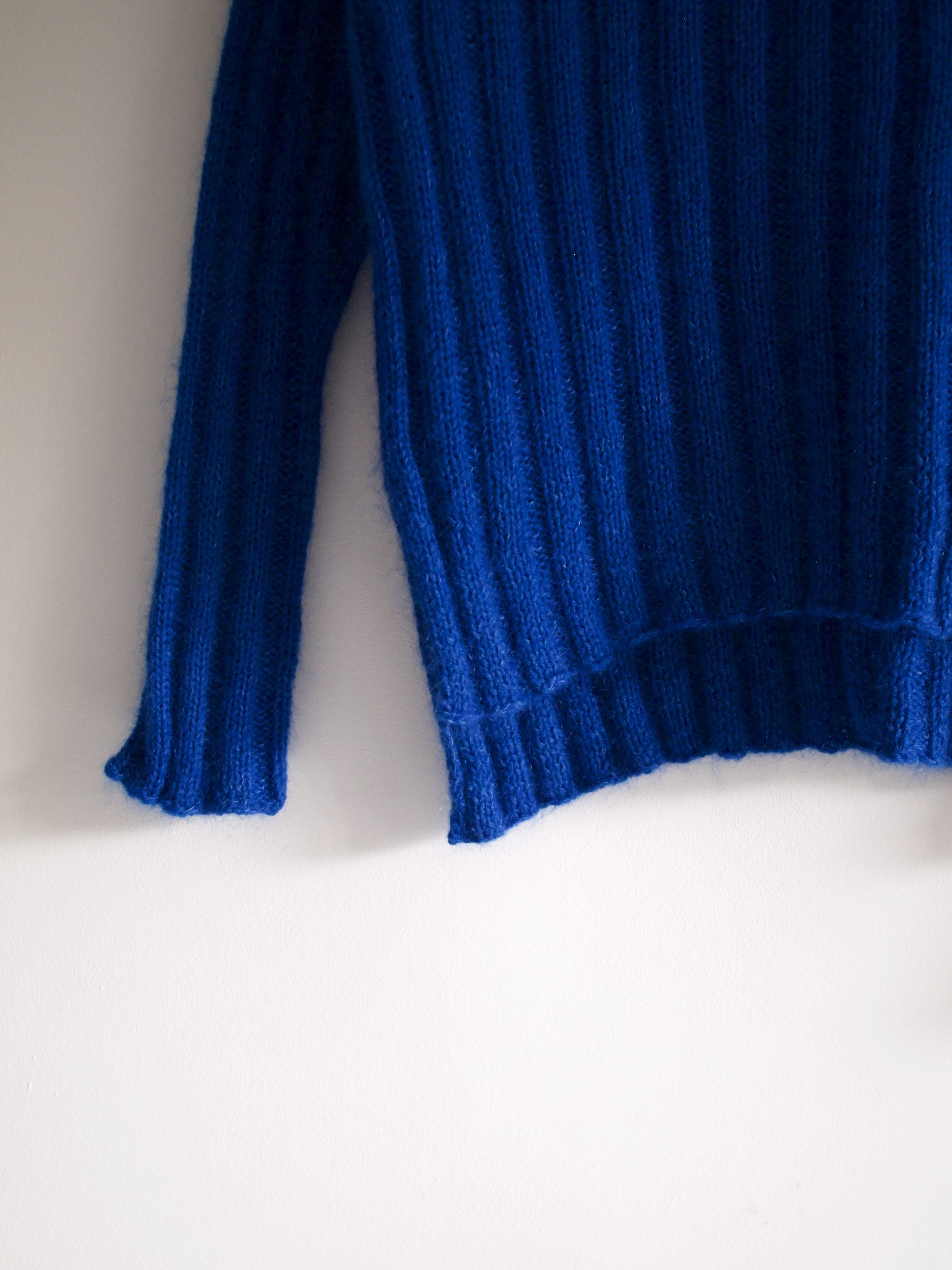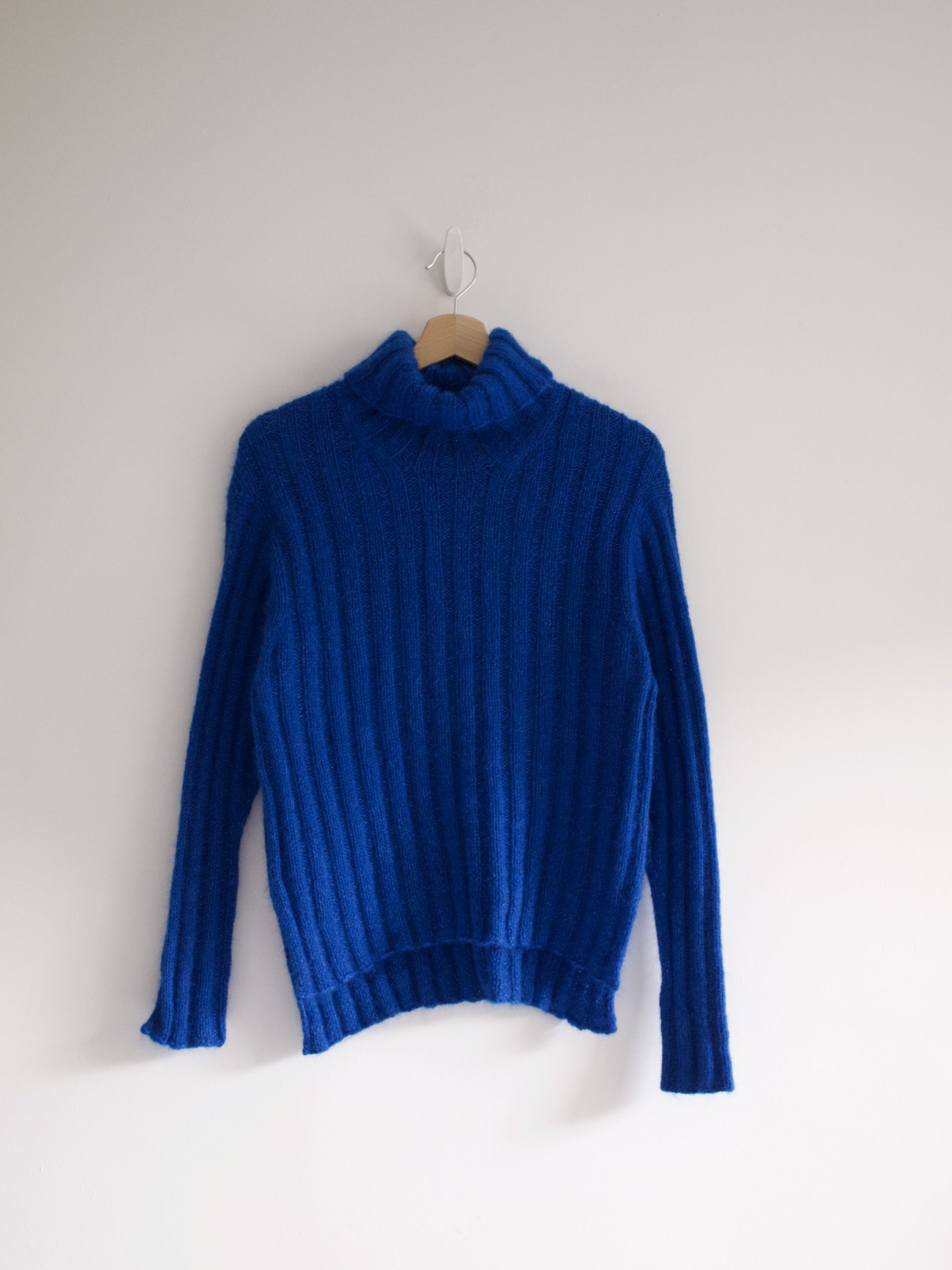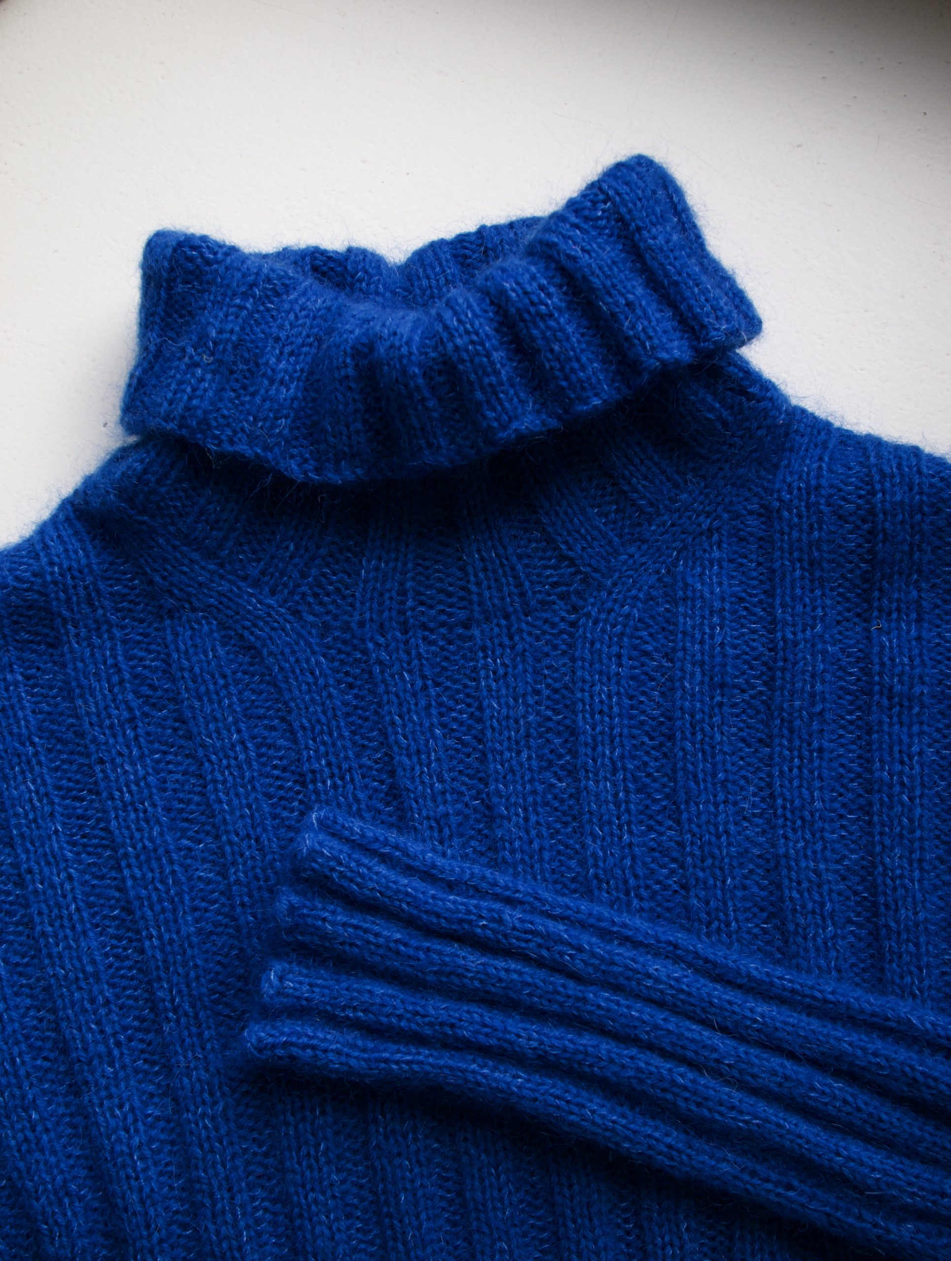 Puszysty sweter w intensywnym kobaltowym kolorze. Rozmiar z metki: brak Skład: brak, wełna+moher Stan: bez wad Szerokość w klatce 48 cm Długośćcałkowita 52-58 cm
