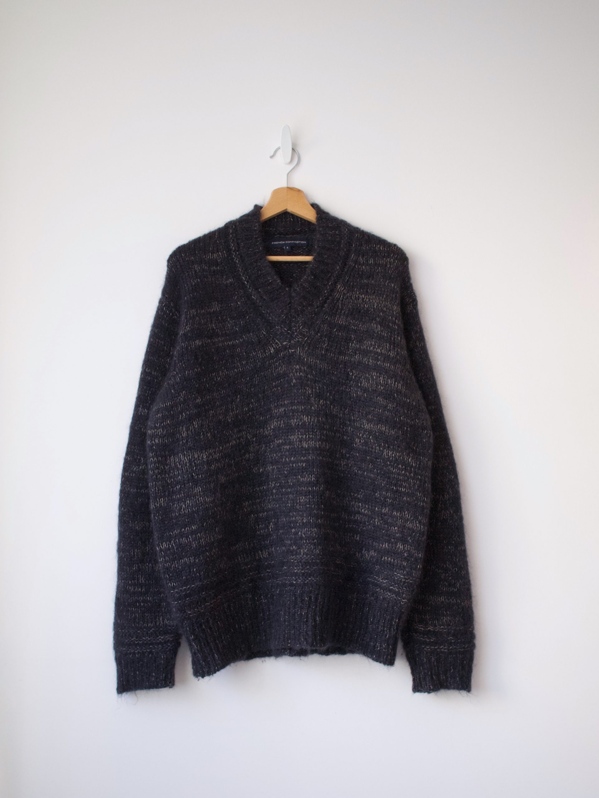 Klasyczny sweter M&S z dekoltem w serek. Skład to 100% kaszmir, bardzo dobry stan, jest minimalnie sfilcowany, nie jest to zauważalne, po prostu jest trochę sztywniejszy.