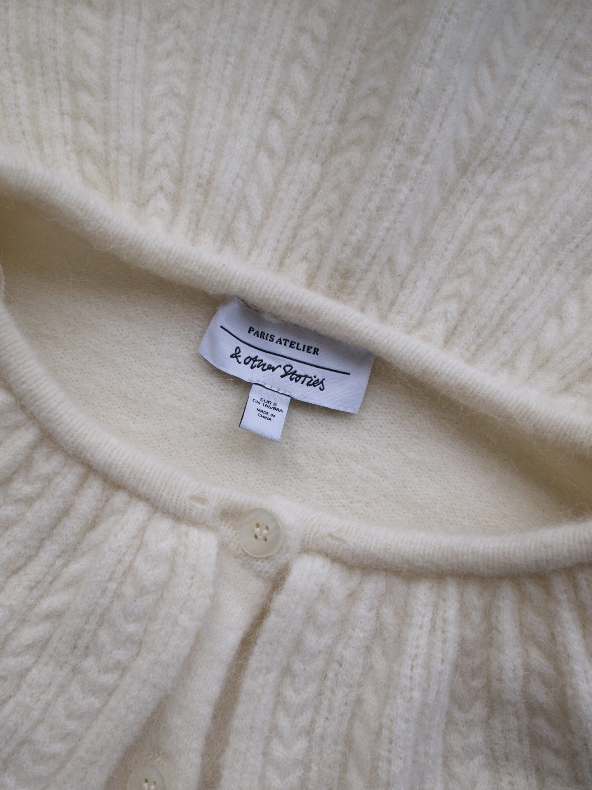 Puszysty kardigan marki Other Stories. Rozmiar z metki: S Skład: 33% alpaka, 32% wełna, 33 poliamid, 3 elastan Stan: bez wad Szerokość w klatce 45 cm Długośćcałkowita 50 cm