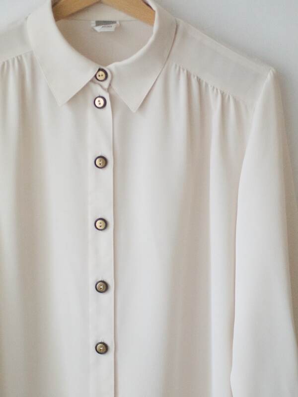 Bluzka vintage, wykonana z bawełnianej popeliny. Dekolt w łódkę, z tyłu wycięcie w formie łezki, rękaw 3/4.