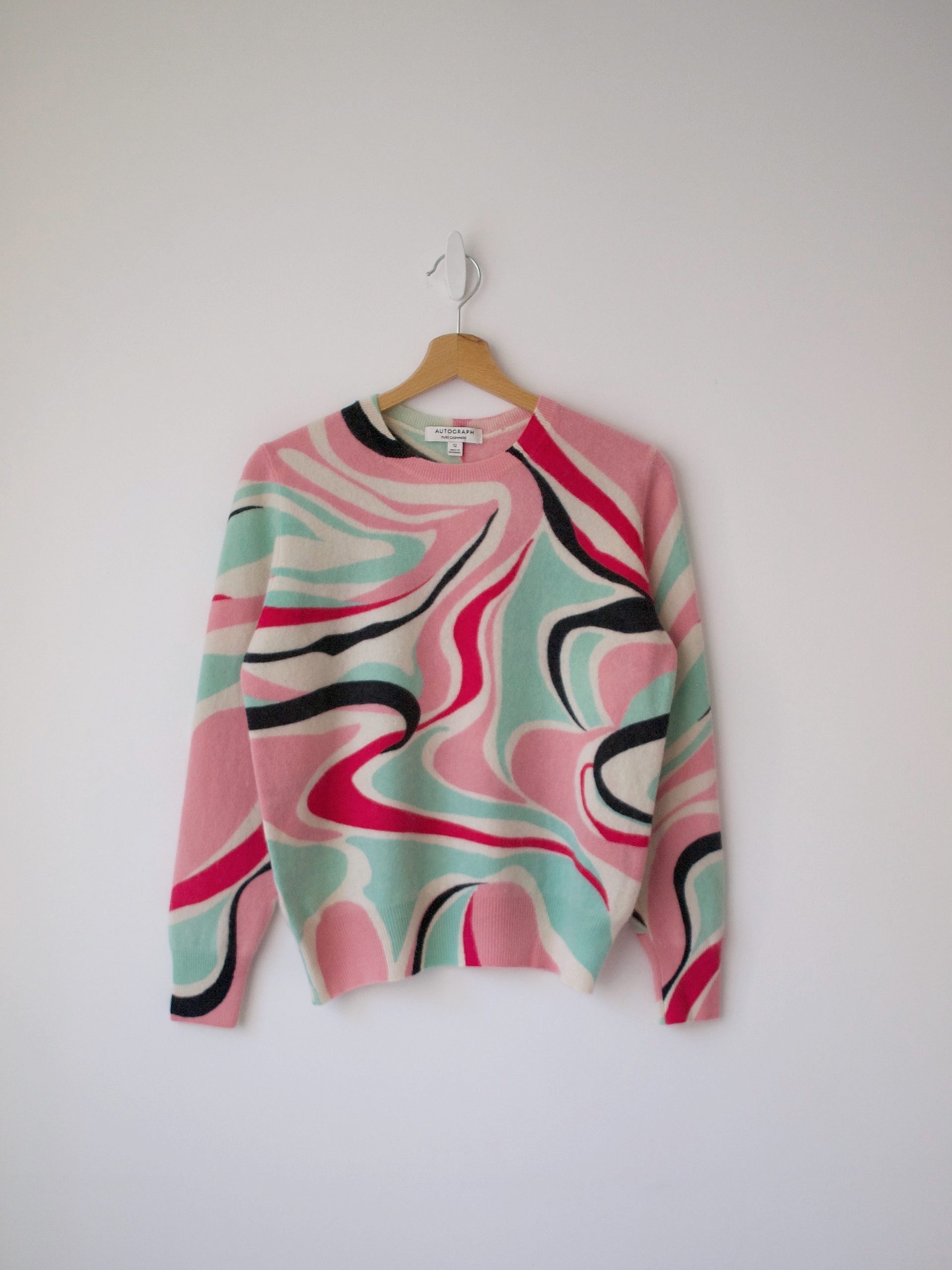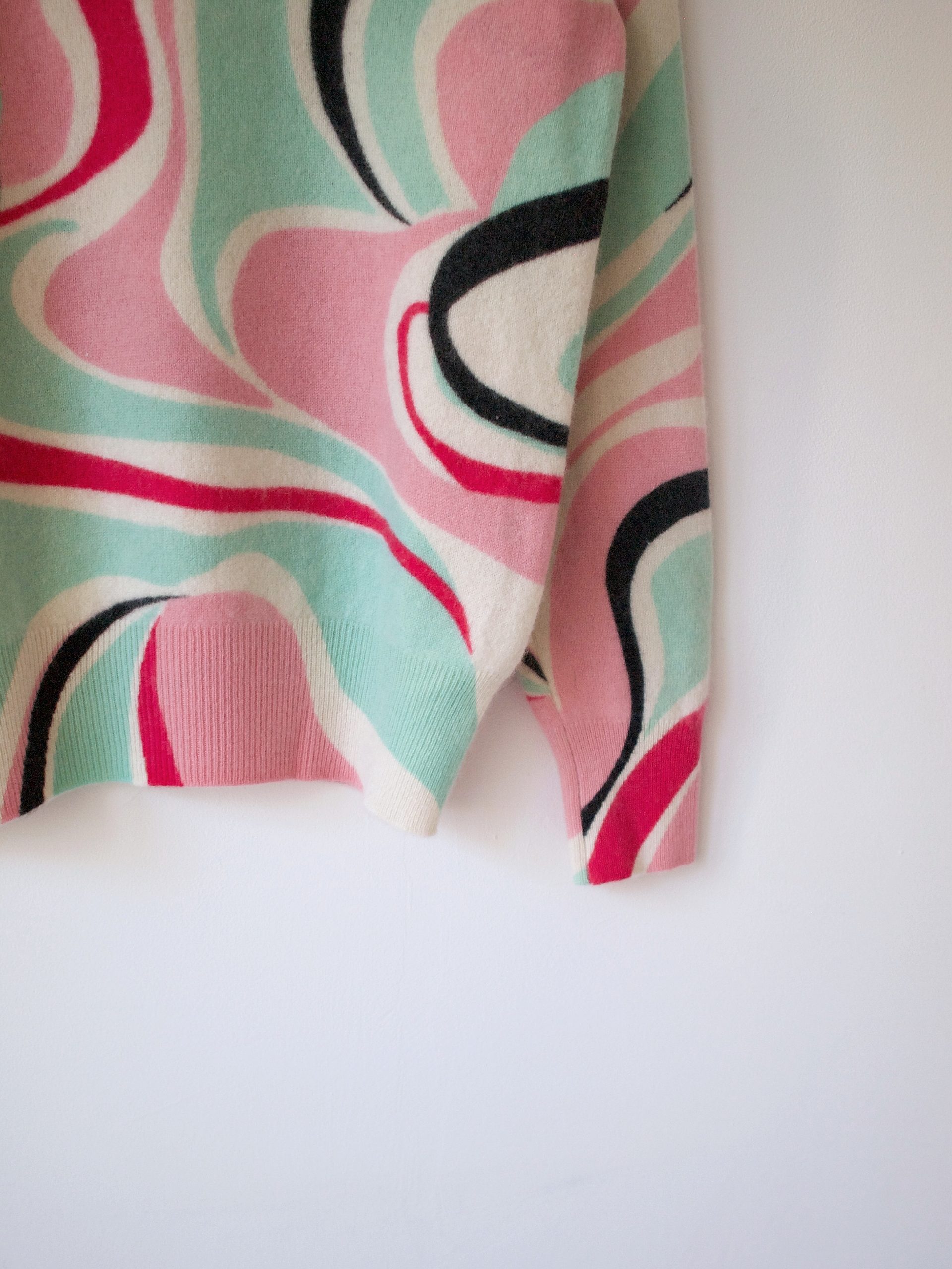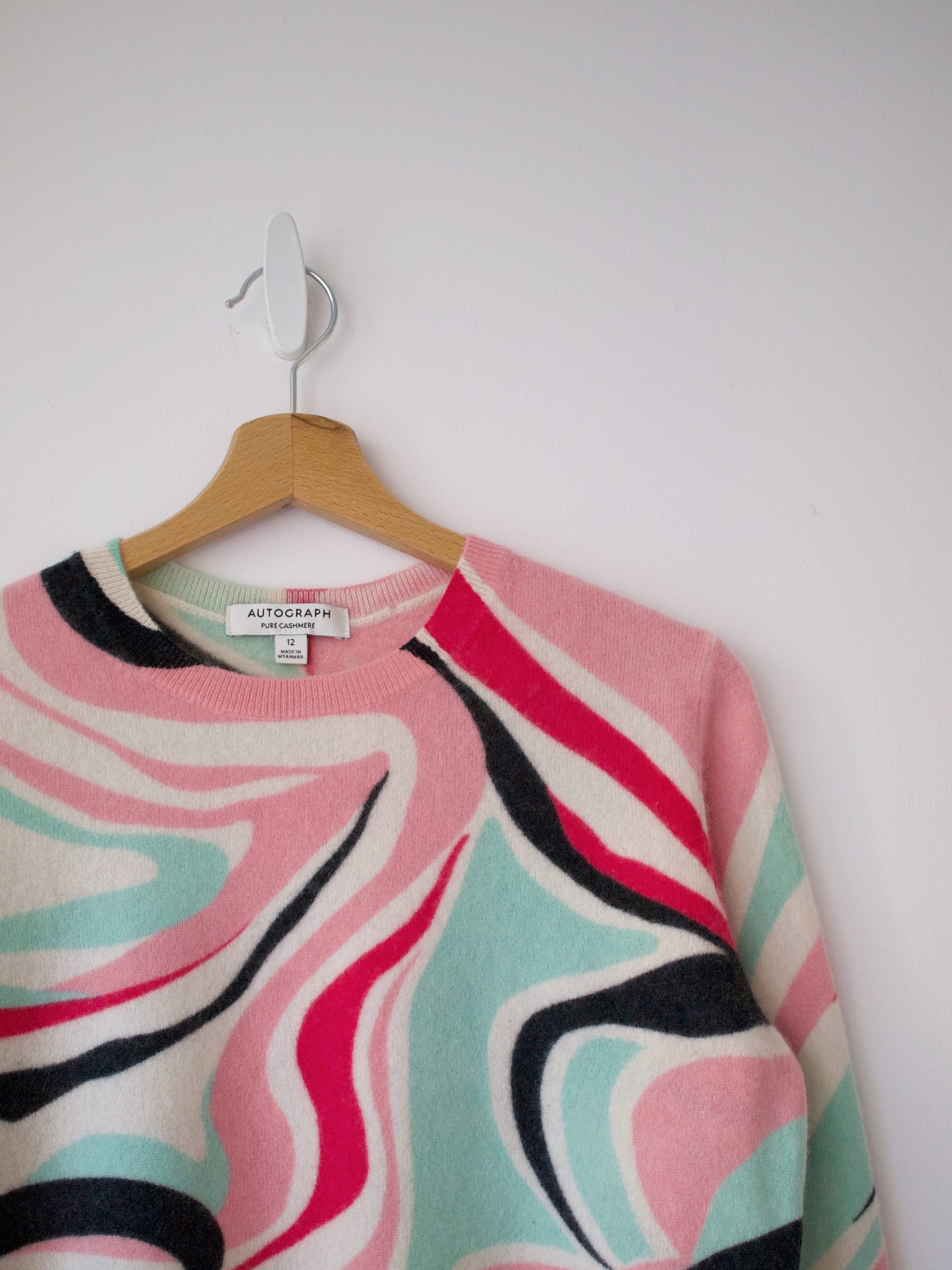 Klasyczny sweter M&S z dekoltem w serek. Skład to 100% kaszmir, bardzo dobry stan, jest minimalnie sfilcowany, nie jest to zauważalne, po prostu jest trochę sztywniejszy.