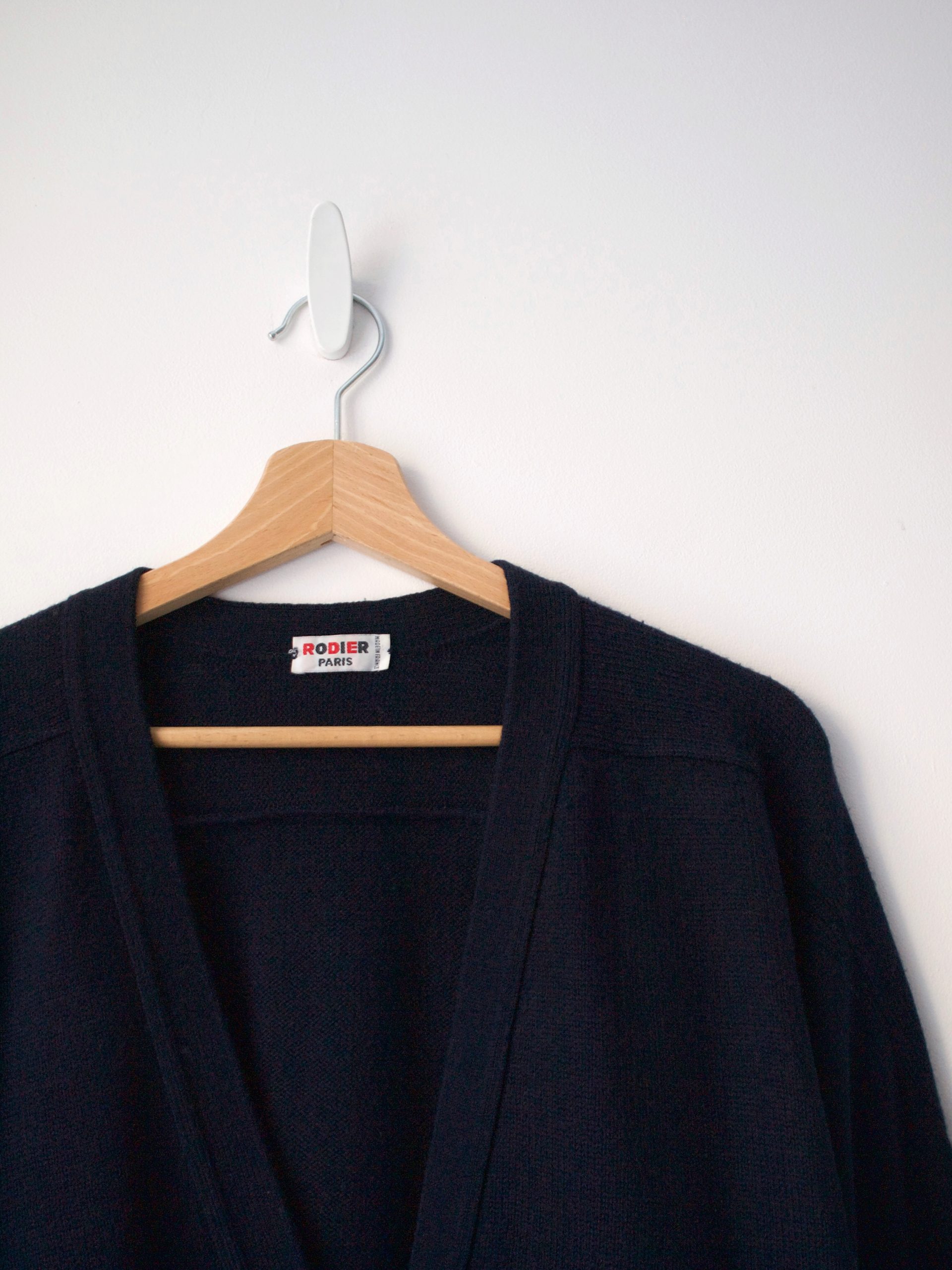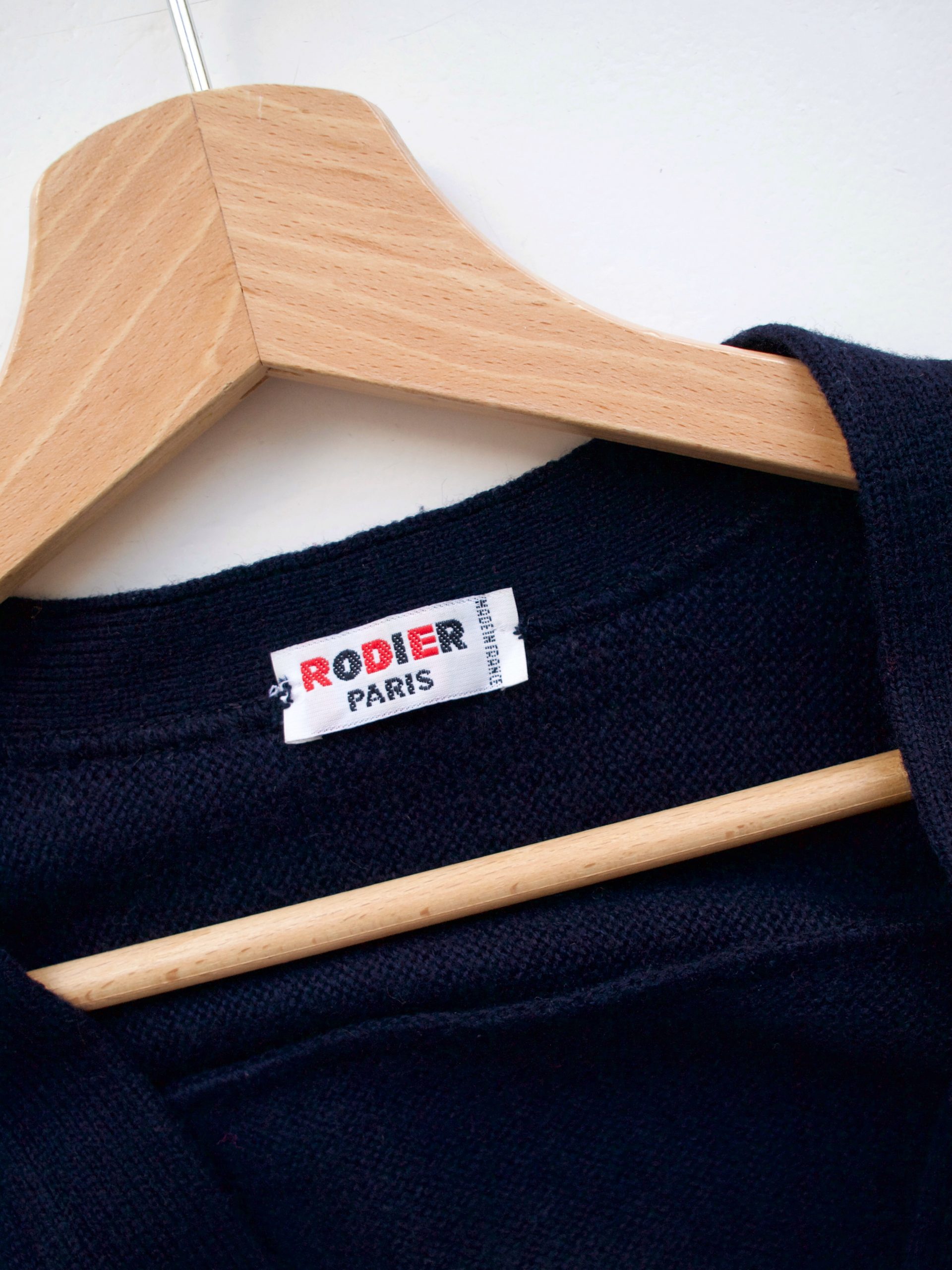 Kardigan ekskluzywnej francuskiej marki Rodier, słynącej z najwyższej jakości dzianin i eleganckiej odzieży damskiej. Model vintage, wyprodukowany we Francji. Kolor granatowy.