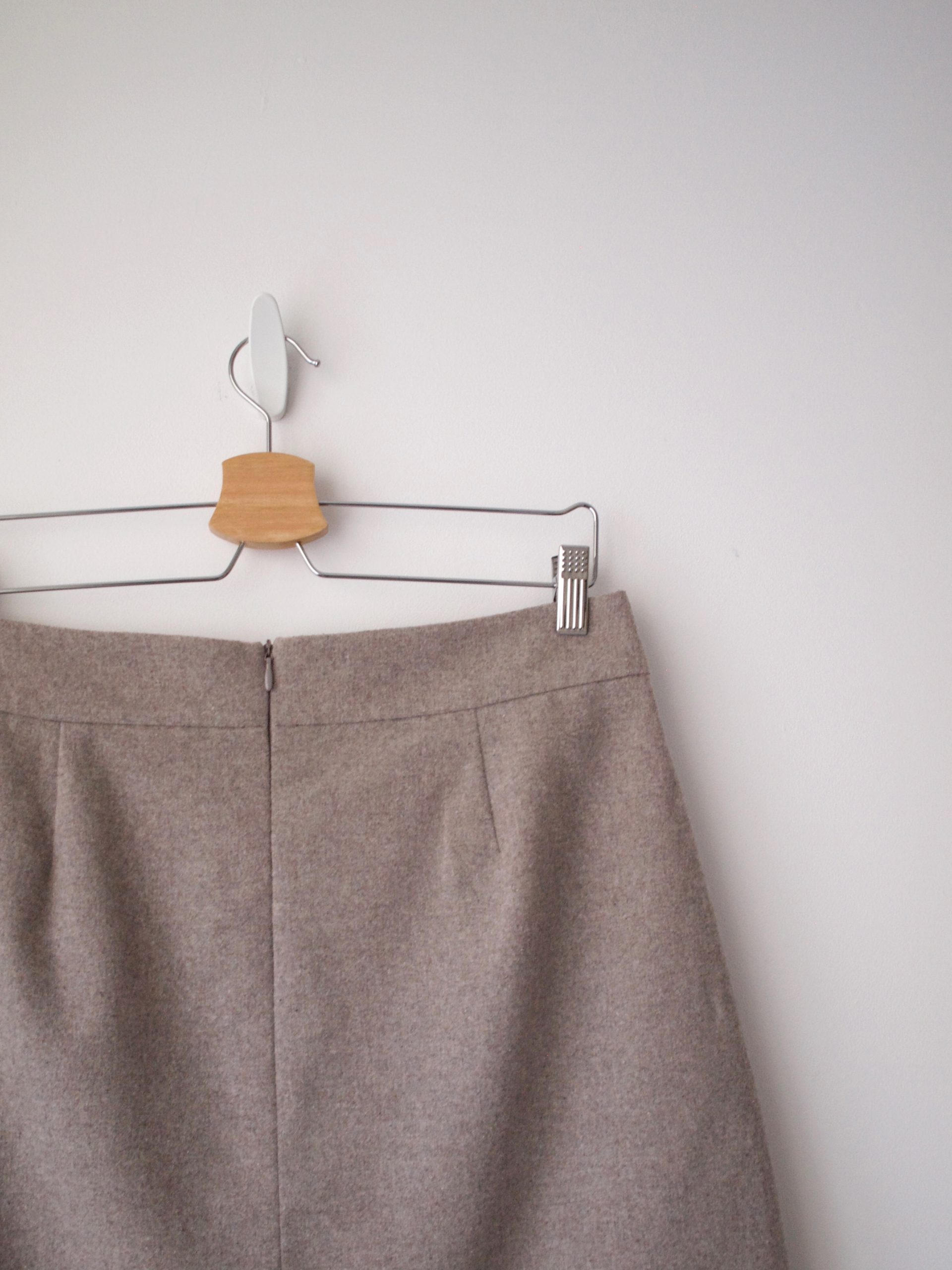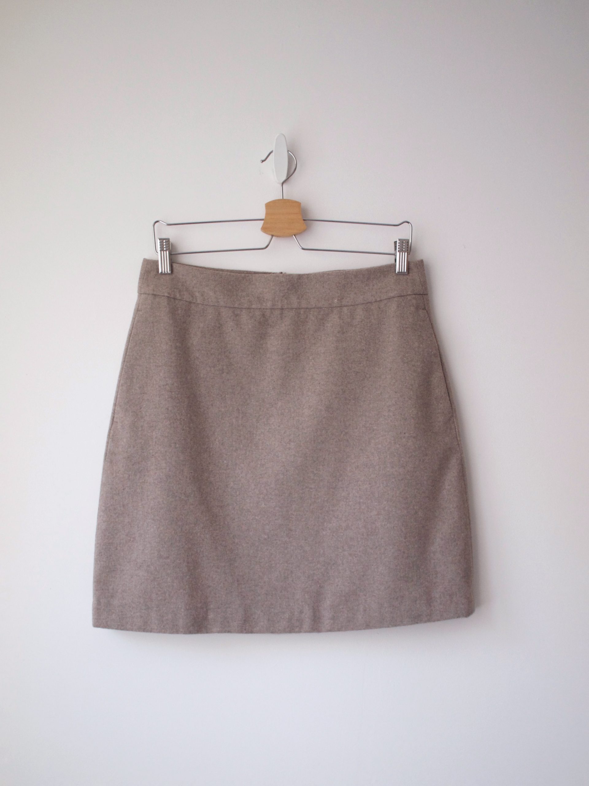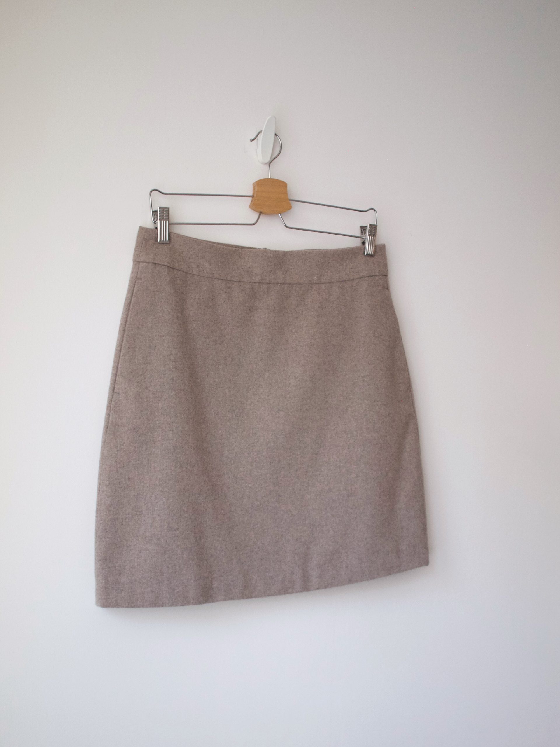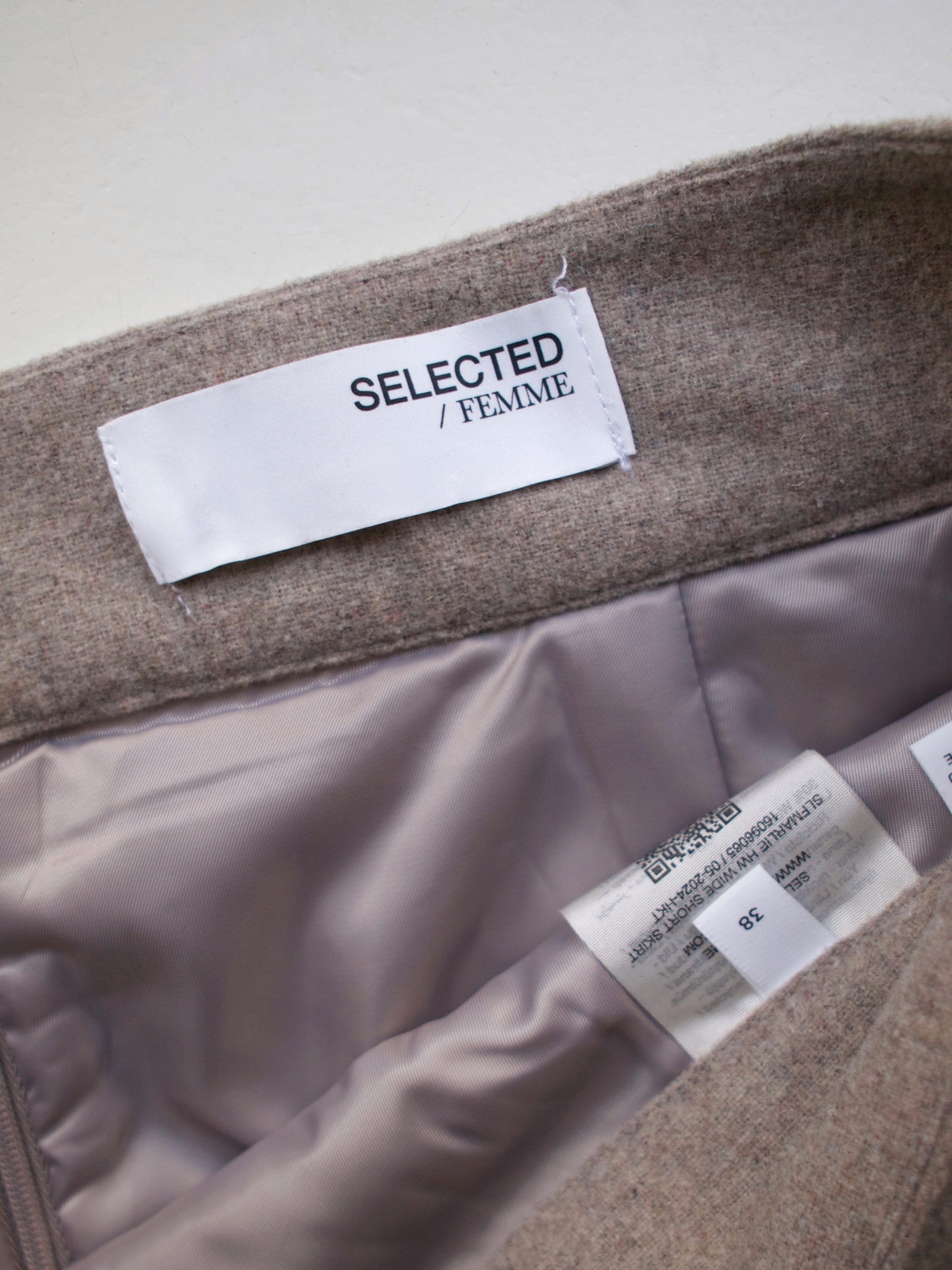 Spódnica w szarobeżowym kolorze skandynawskiej marki Selected. Wykonana z materiału z dodatkiem wełny. Posiada boczne kieszenie, podszewkę oraz ukryty zamek z tyłu.