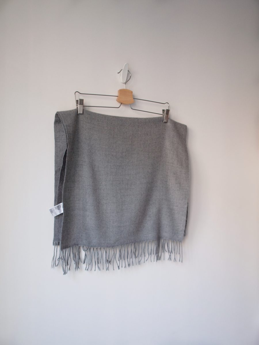 Duży szal marki Uniqlo, wykonany w technologii Heattech. Dzięki specjalnym mikrowłóknom przechwytującym wilgoć i przekształcającym ją w energię cieplną, materiał utrzymuje komfort termiczny, jednocześnie pozostając oddychający i elastyczny.