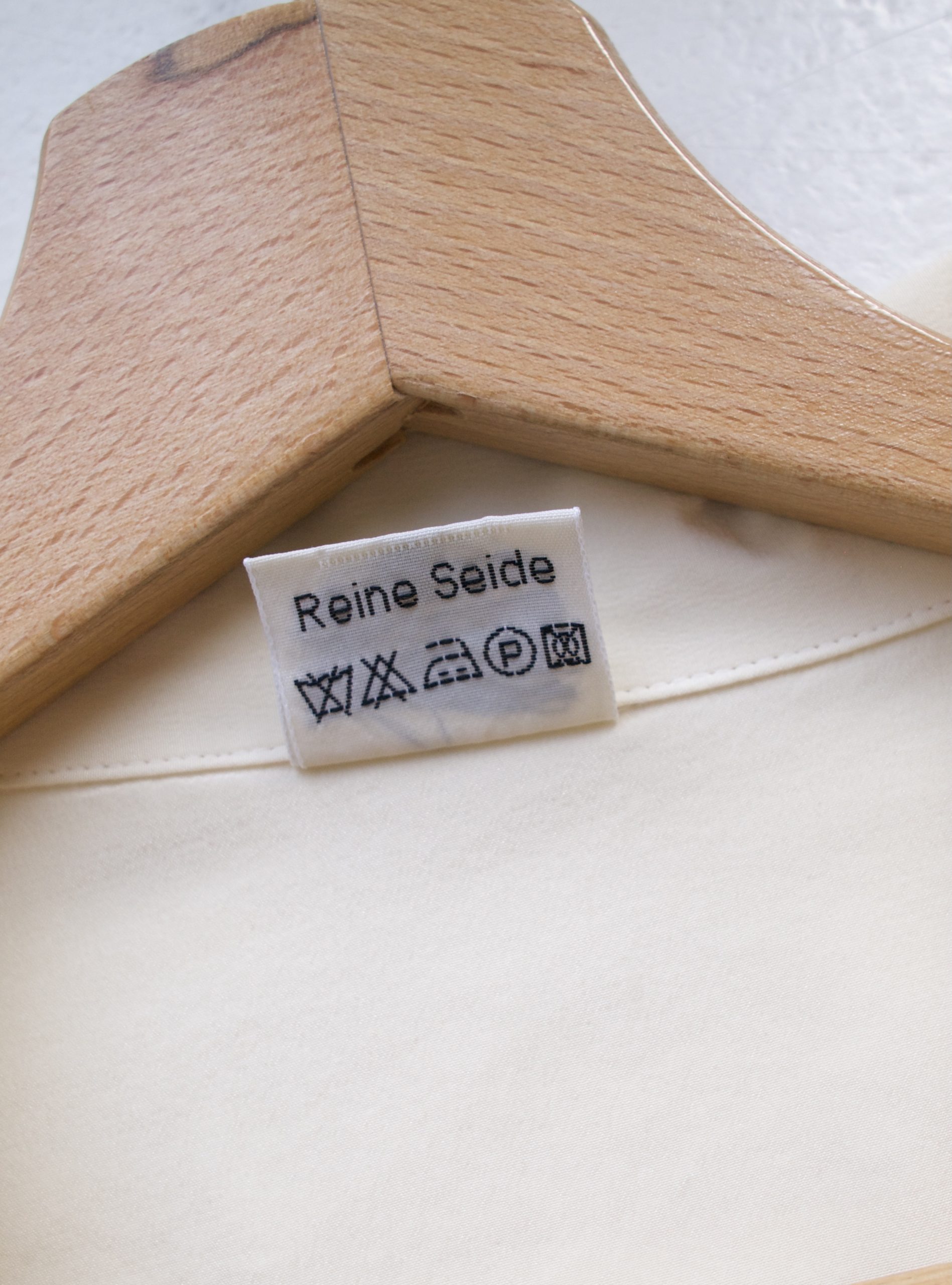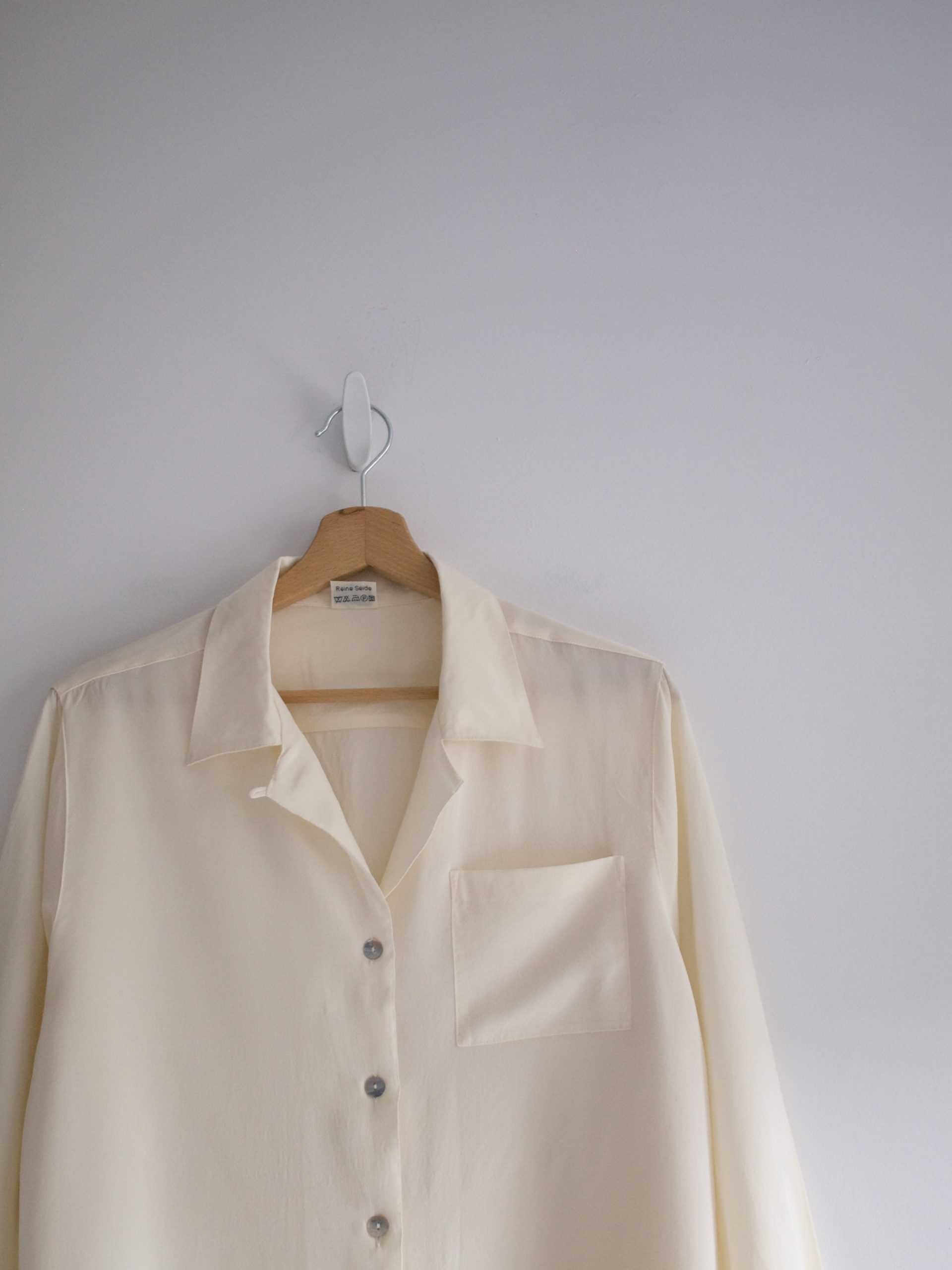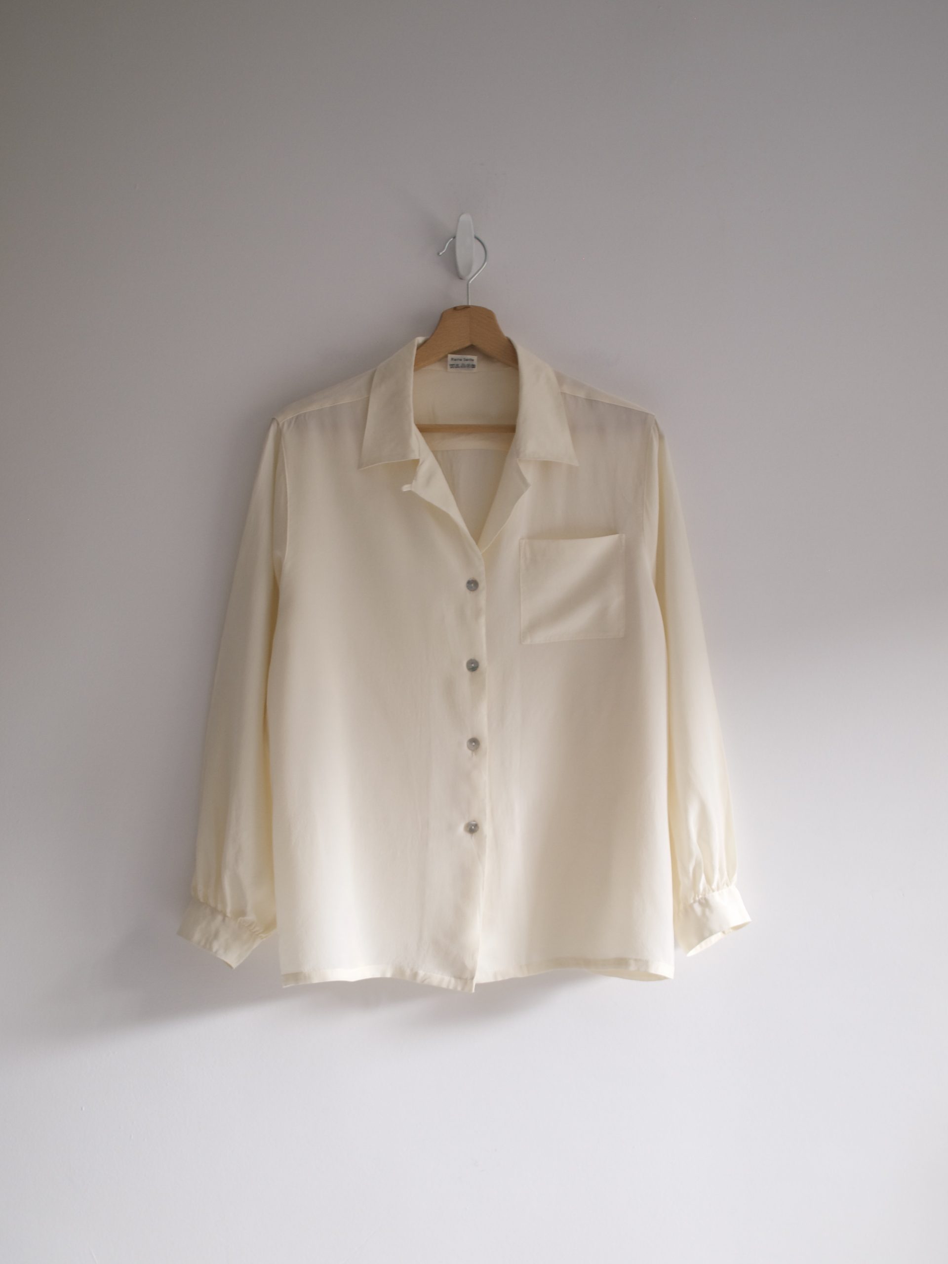 Koszula vintage, w 100% wykonana z jedwabiu, zapinana na guziki z naturalnej muszli. Rozmiar z metki: 42 Skład: jedwab Stan: bez wad Szerokość w klatce 52 cm Długośćcałkowita 61 cm