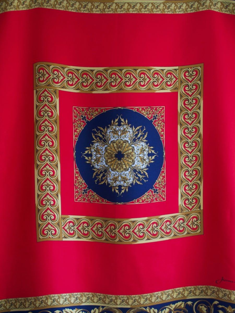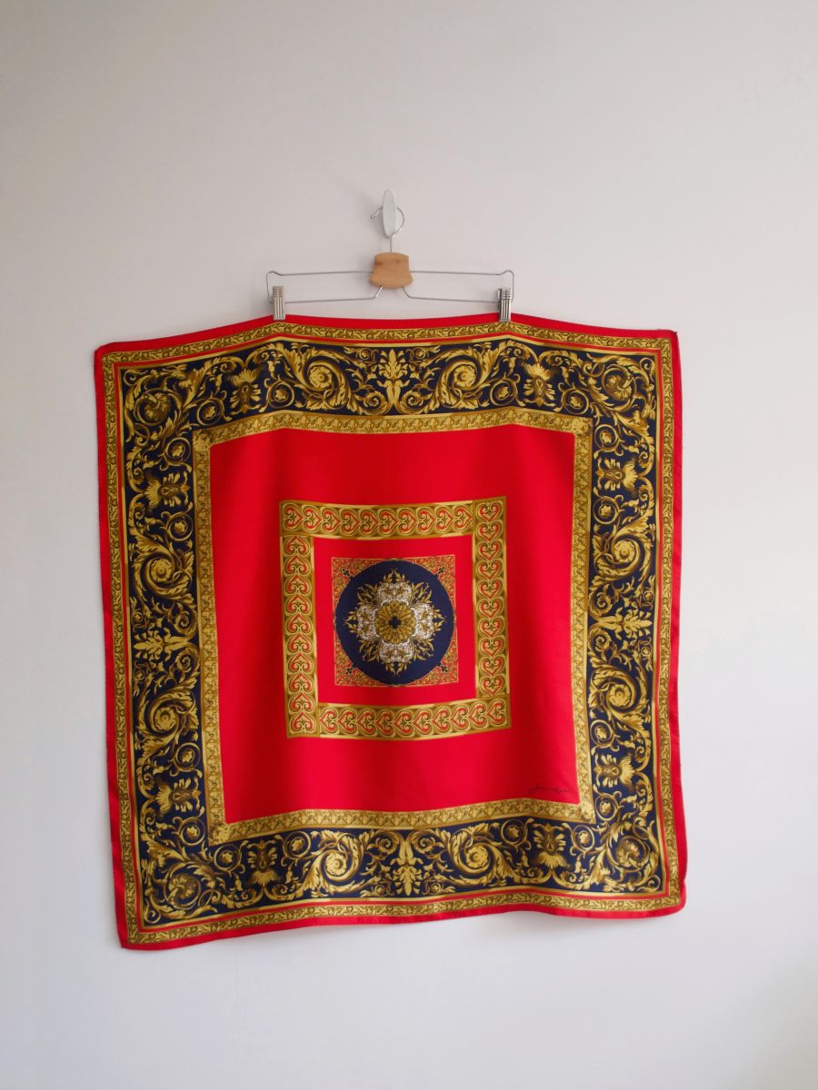 Duża jedwabna chusta vintage. Wykonana gęstego jedwabiu typu twill w intensywnej czerwieni z bogatym ornamentem w odcieniach złota i granatu. Ręcznie rolowane brzegi. Bez wad.