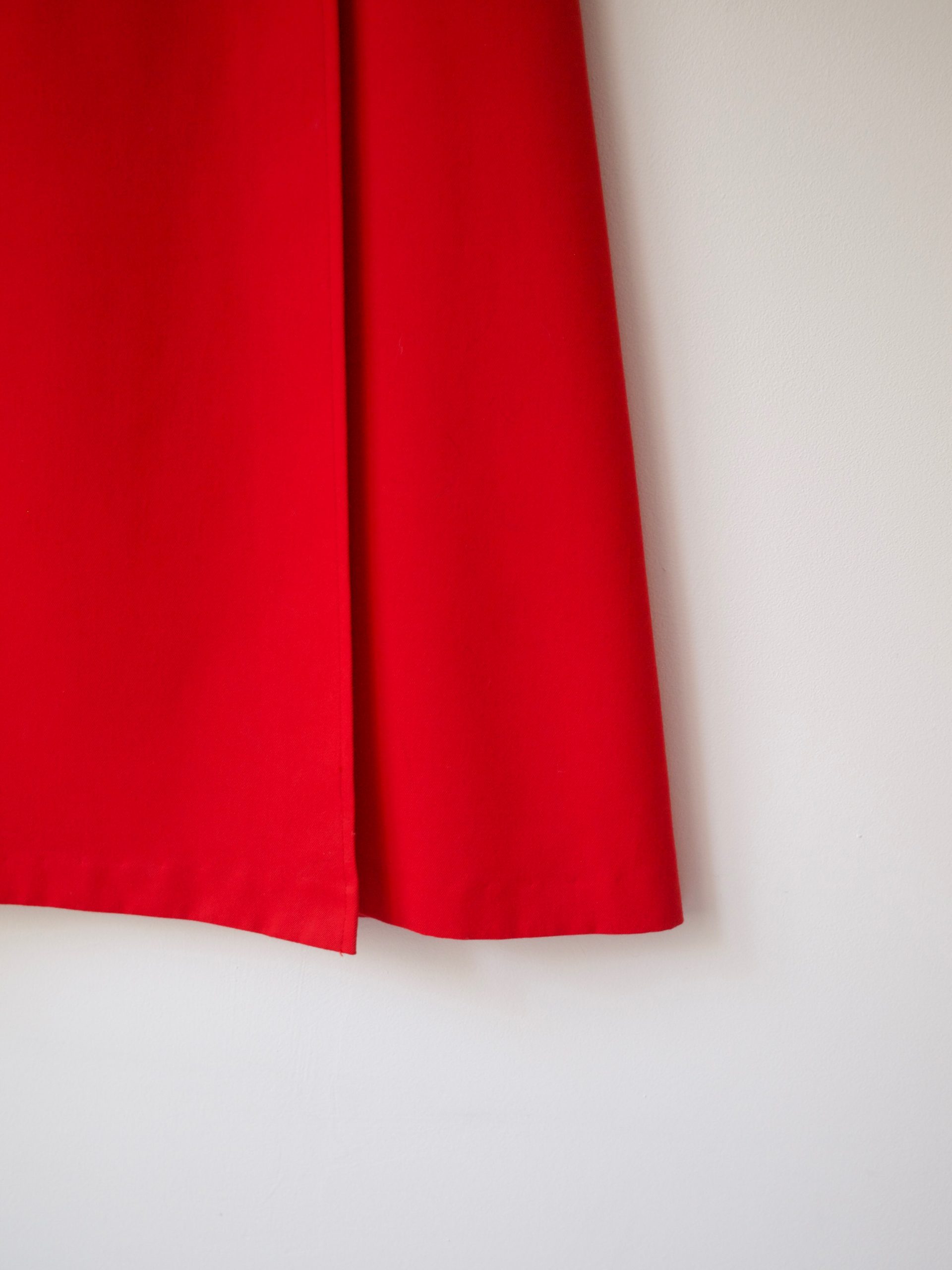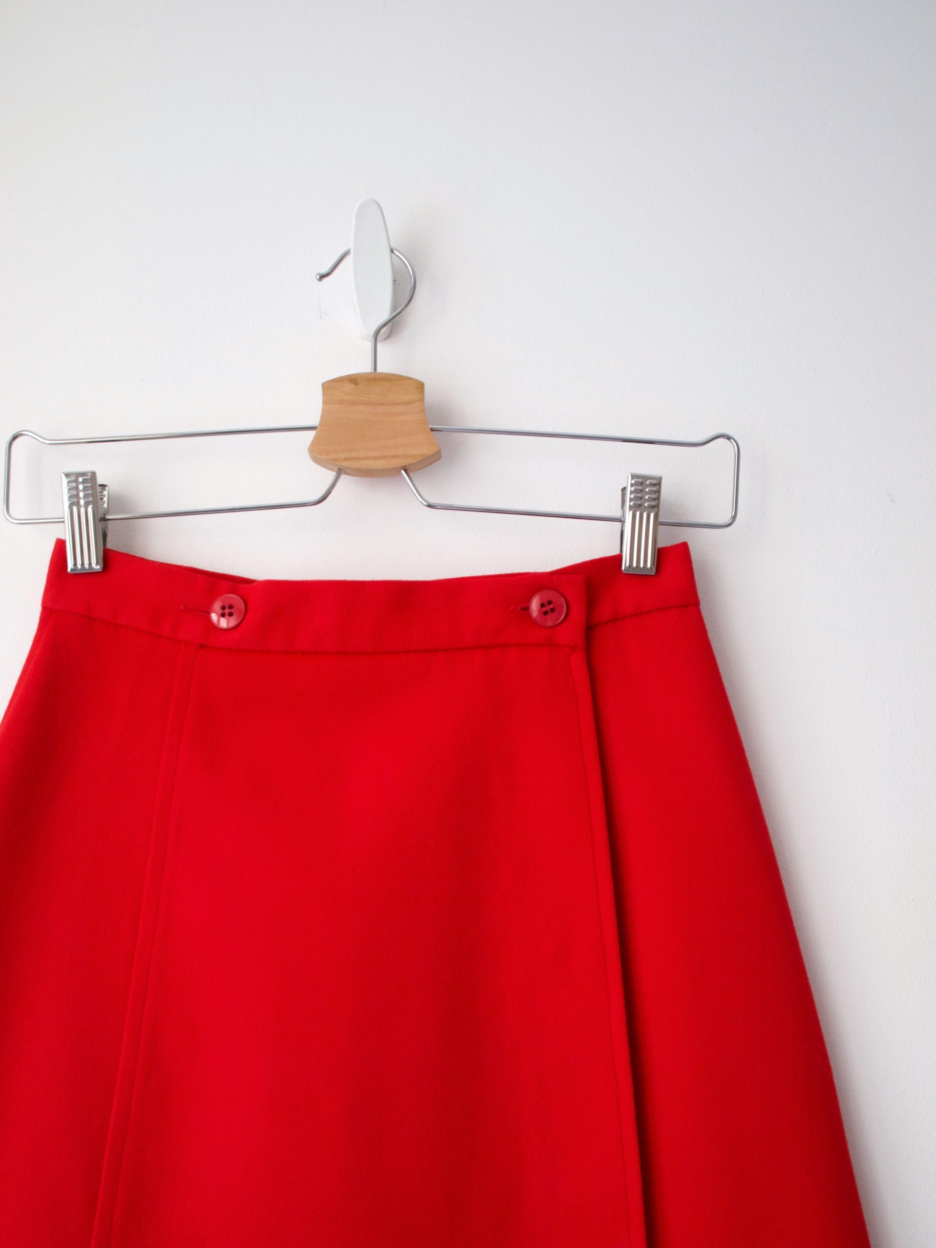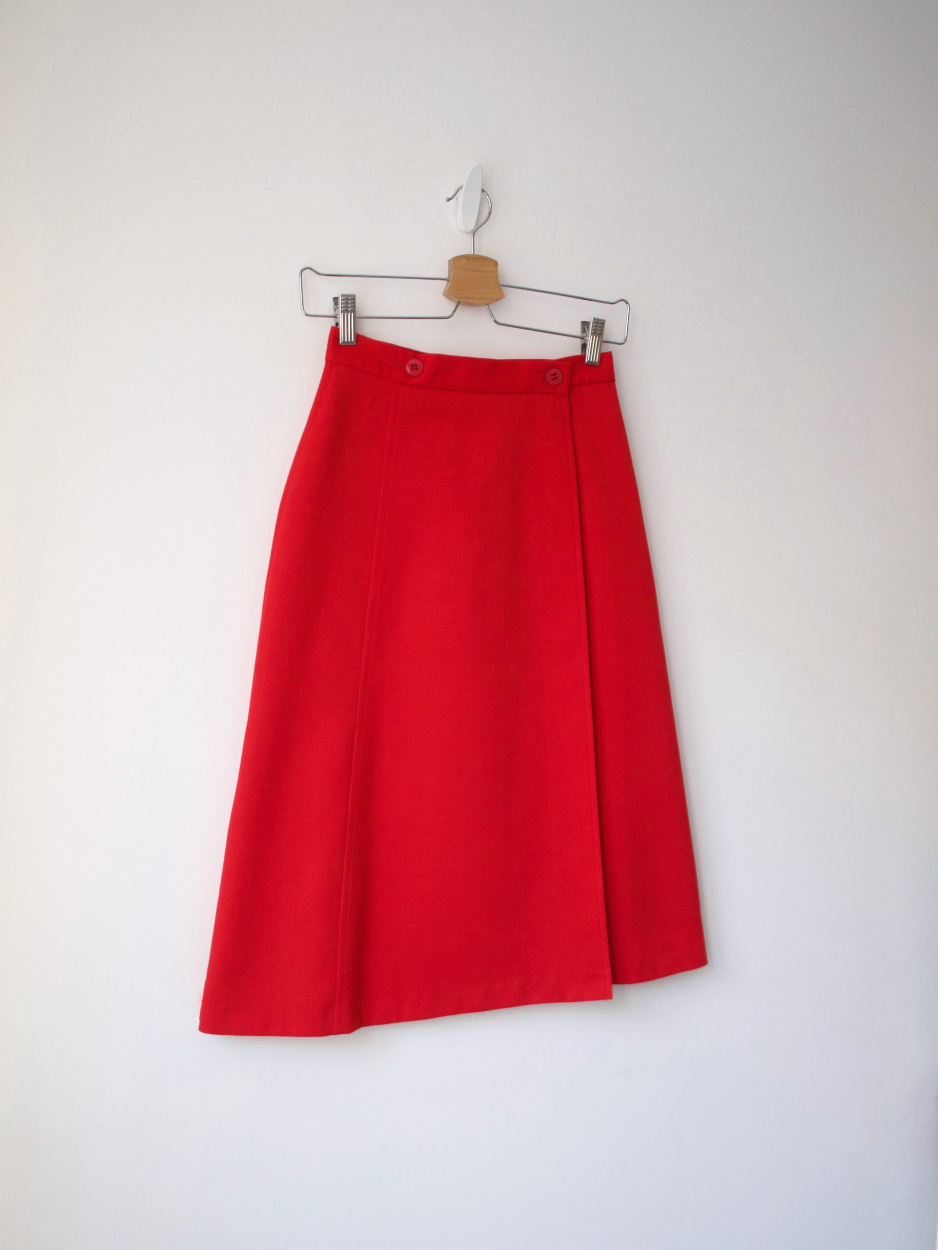 Unikatowa spódnica vintage o kroju trapezowym (A-line). Wykonana z grubszej, strukturalnej tkaniny, z ozdobnym zapięciem na dwa guziki w pasie. Bardzo klasyczny i ponadczasowy fason, który świetnie podkreśla talię.