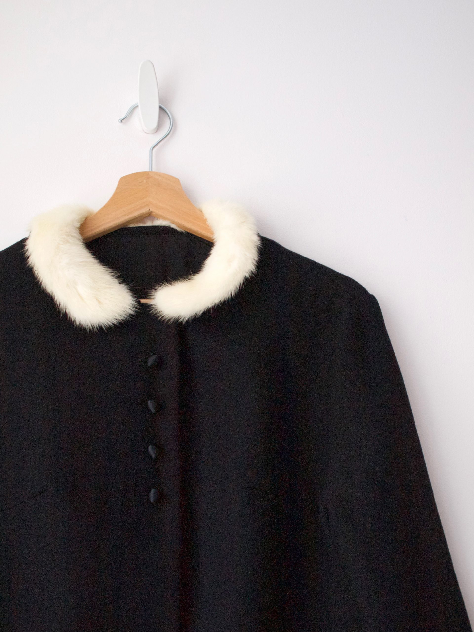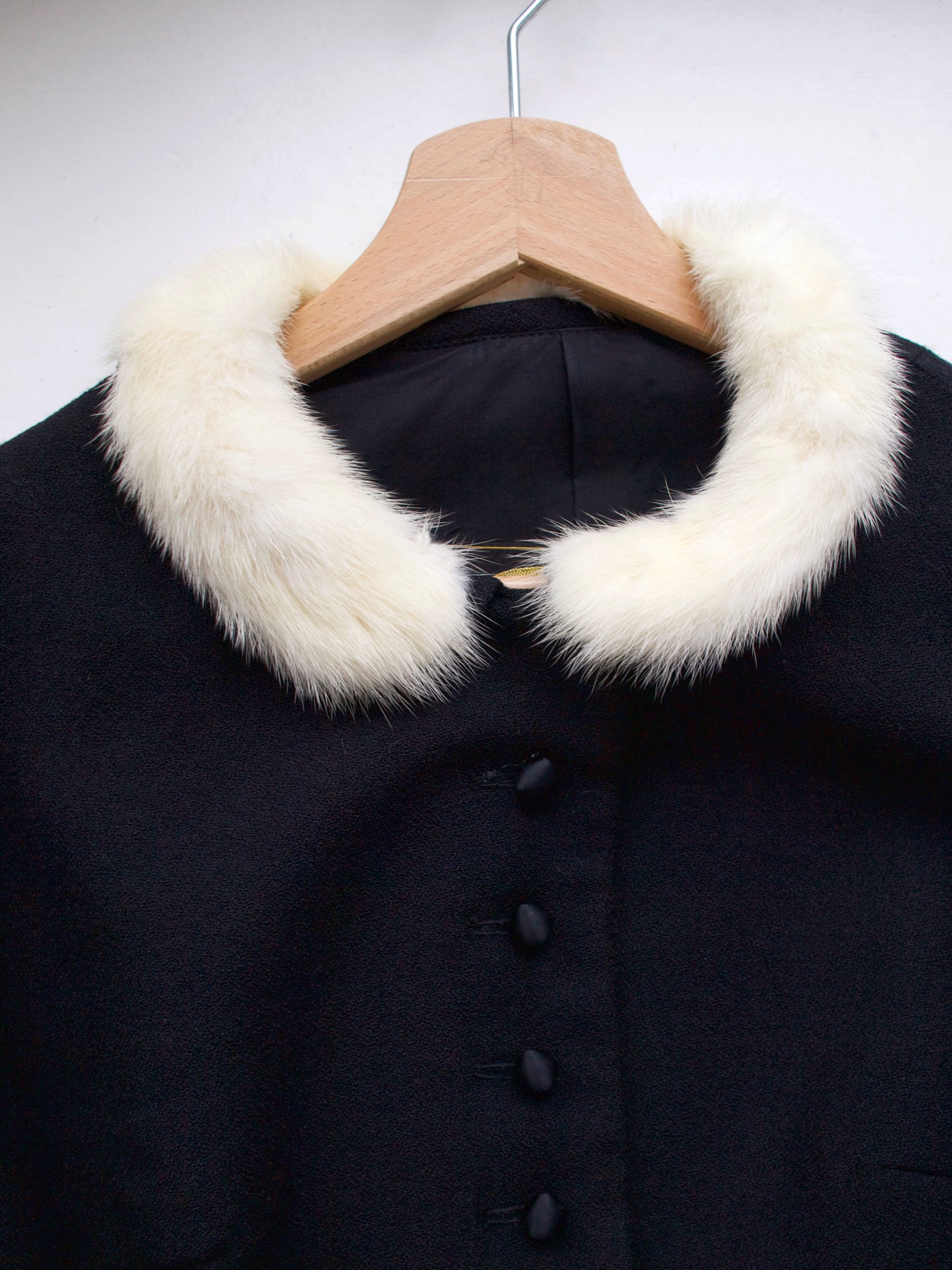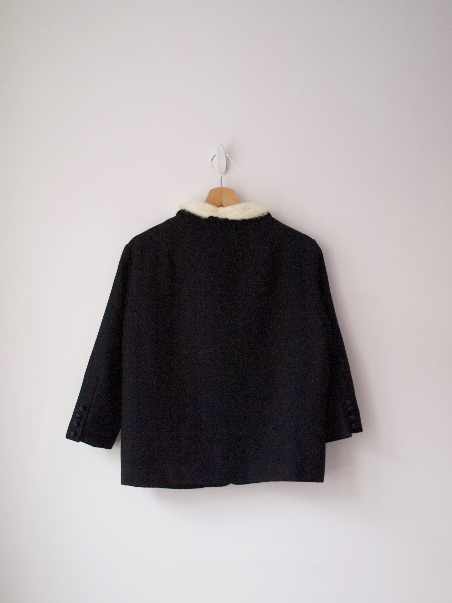 Unikatowa marynarka vintage wykonana w bardzo modnym obecnie stylu japońskim. Zapinana na guziki powlekane satynowym materiałem, zdobiona sztucznym futerkiem. Wyprodukowana w Szwajcarii.