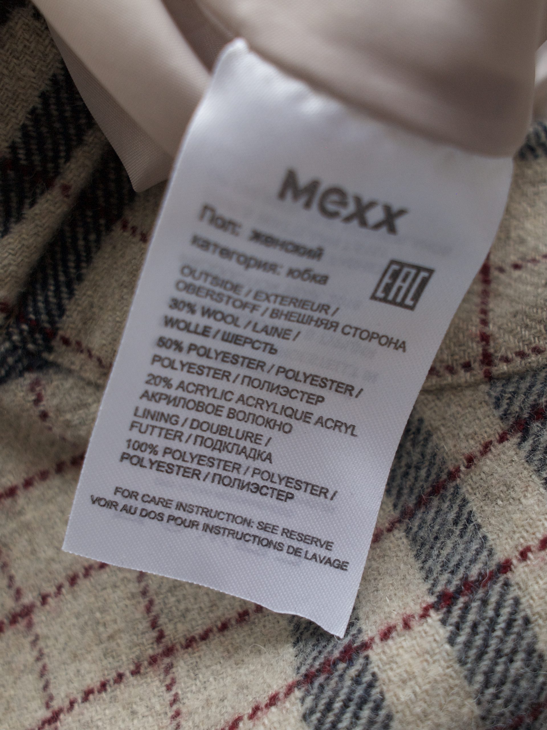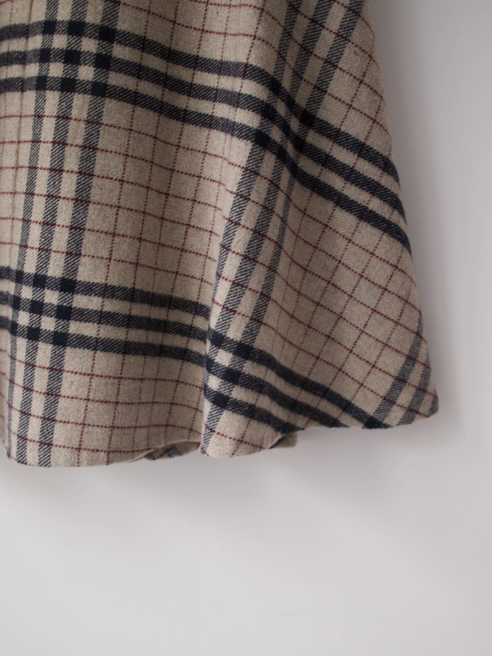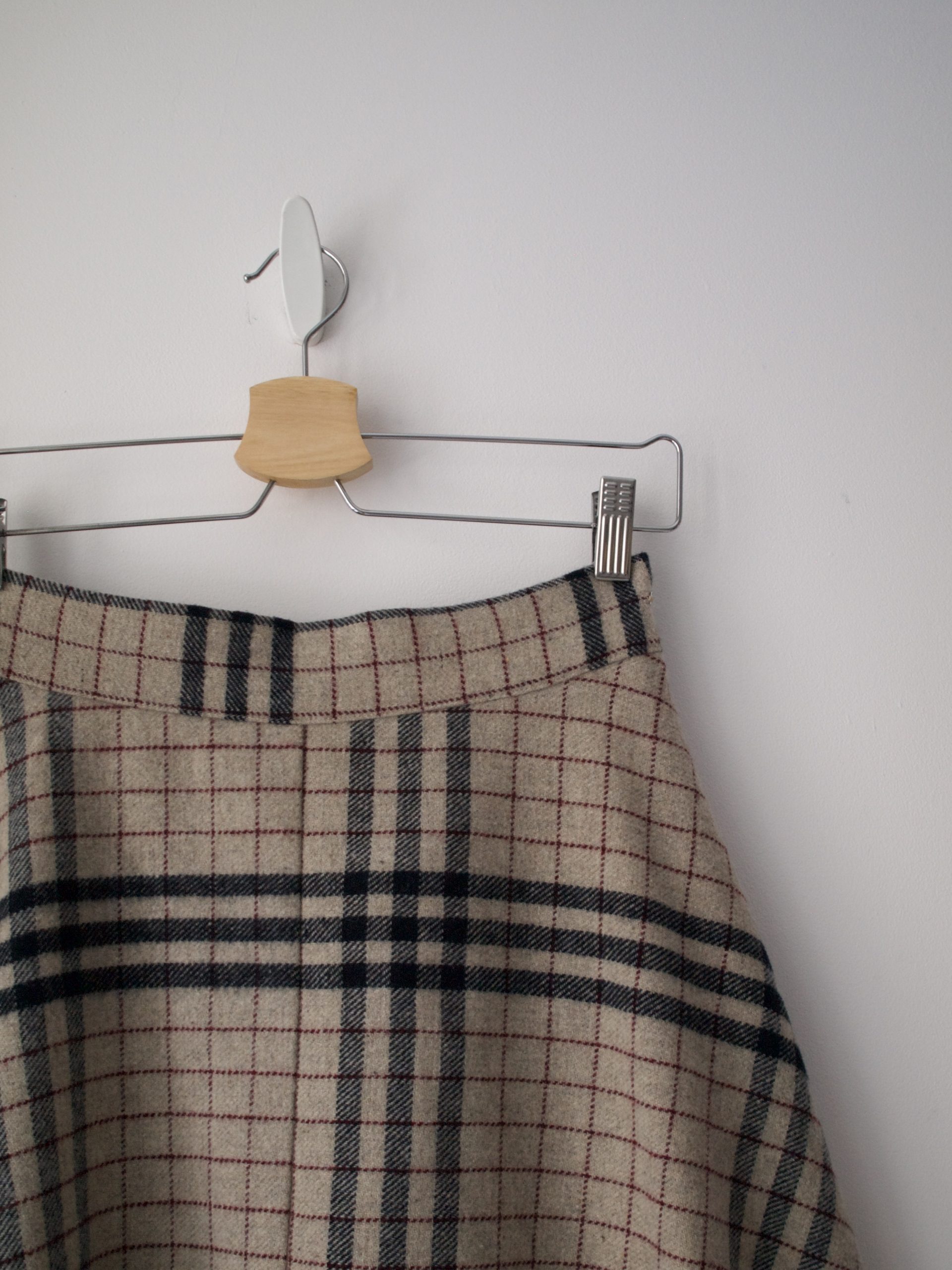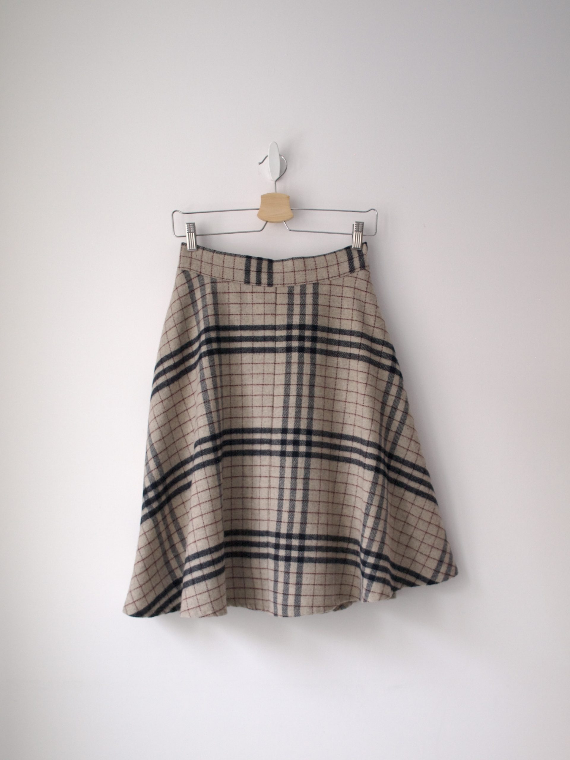 Spódnica w kratę, wykonana z materiału z dodatkiem wełny. Z podszewką. Rozmiar z metki: 36 Skład: na zdjęciu Stan: idealny Szerokość w pasie 33-36 cm Długość całkowita 61 cm
