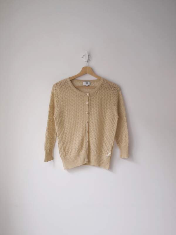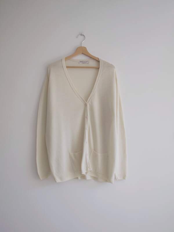 Kardigan vintage, w 100% wykonany z gładkiej i niegryzącej wełny. Rozmiar z metki: brak, duży Skład: 100% wełna jagnięca Stan: bez wad Szerokość w klatce 67 cm Długośćcałkowita 73 cm