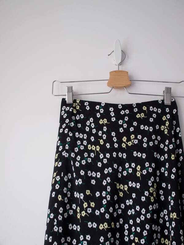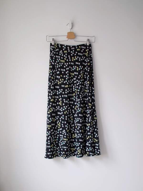 Rozmiar z metki: 38 Skład: 100% wiskoza, podszewka poliester Stan: idealny Szerokość w pasie 35,5 cm Szerokość w biodrach 50 cm Długość całkowita 86 cm