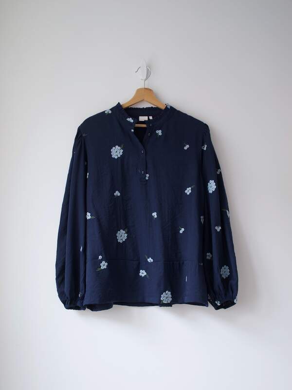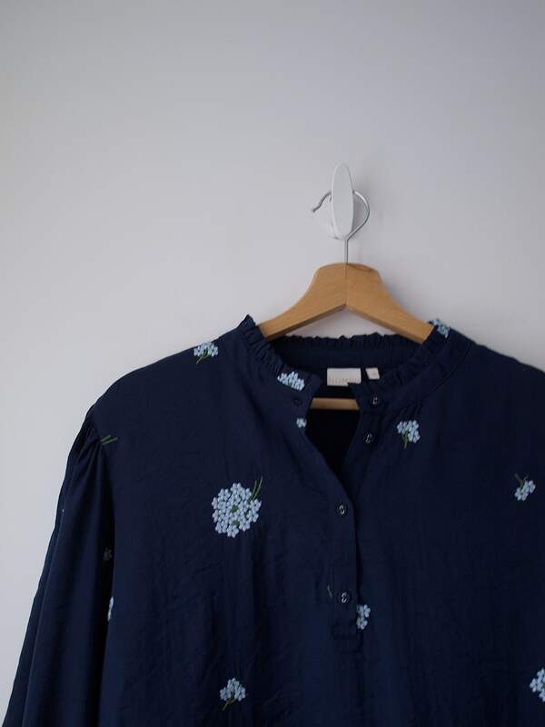 Bluzka duńskiej marki Nümph w haftowane kwiaty. Bluzka ma luźny fason oraz bufiaste rękawy. Rozmiar z metki: 40, luźny Skład: brak metki, wiskoza Stan: bez wad Szerokość w klatce 57 cm Długośćcałkowita 66 cm