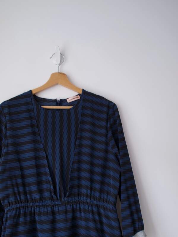Sukienka ekskluzywnej duńskiej marki Custommade. Z tyłu zapinana na zamek, w pasie gumka. Rozmiar z metki: 40 Skład: 100% jedwab, podszewka jedwab+bawełna Stan: bardzo dobry Szerokość w klatce 49 cm Szerokość w pasie 38-44 cm Długośćcałkowita 93 cm