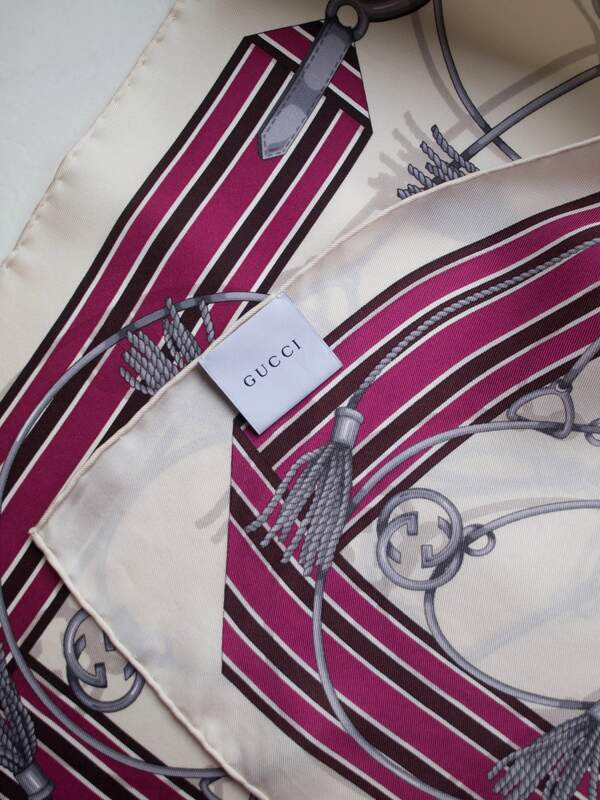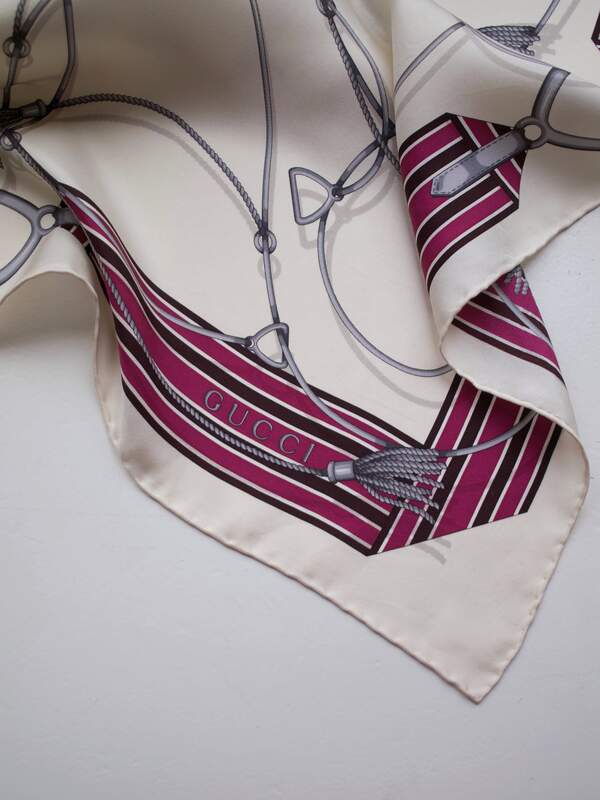 550,00 złJedwabna chusta domu mody GUCCI. Wykonana z gęstego jedwabiu w kolorze ecru, ręcznie rolowana. Kolory są soczyste i nie są wyblakłe. Wyprodukowana we Włoszech. Stan idealny.