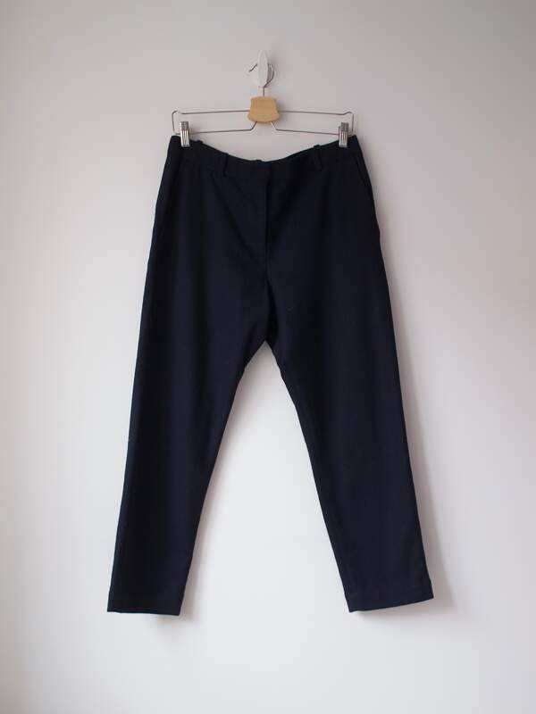 150,00 złGranatowe spodnie marki COS. Wykonane z tkaniny z dużym dodatkiem wełny. UWAGA, na metce rozmiar 36, w rzeczywistości pasują na znacznie większy, proszę sprawdzić wymiary.