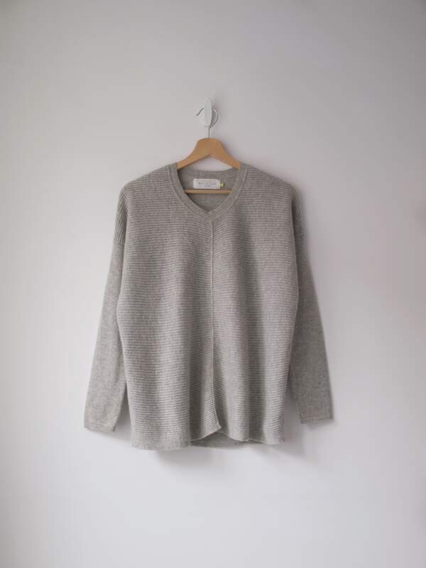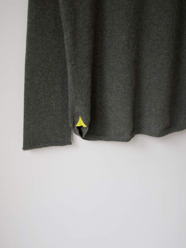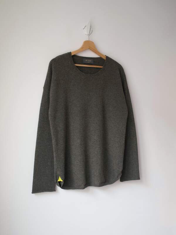 Sweter ekskluzywnej brytyjskiej marki Wyse London. Kaszmirowe swetry na stronie marki są dostępne w cenie 1000-1500 zł. Kolor khaki, na rękawach i na dole kontrastowe wstawki. Rozmiar z metki: L Skład: kaszmir Stan: bez wad Szerokość w klatce 51,5 cm Długośćcałkowita 69 cm